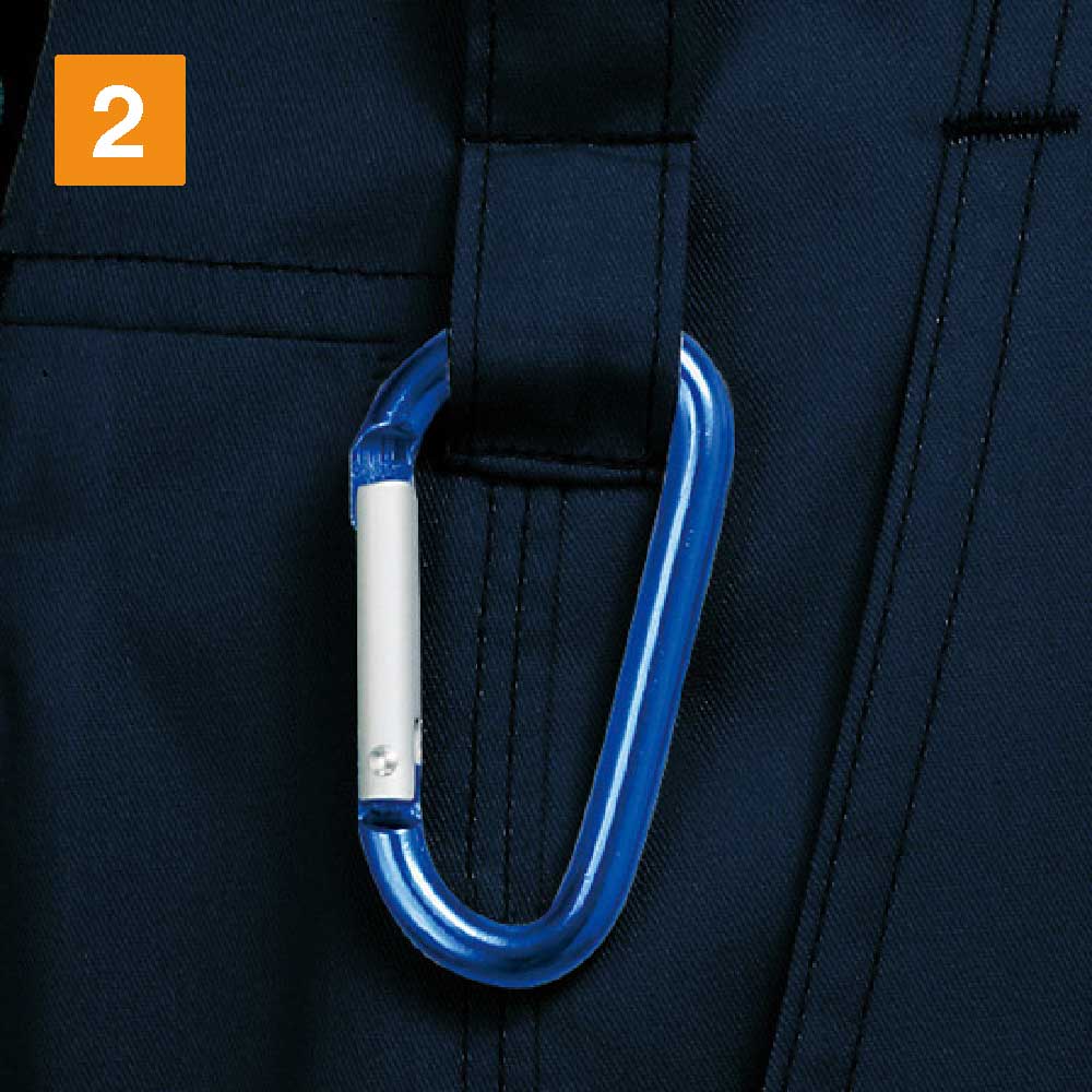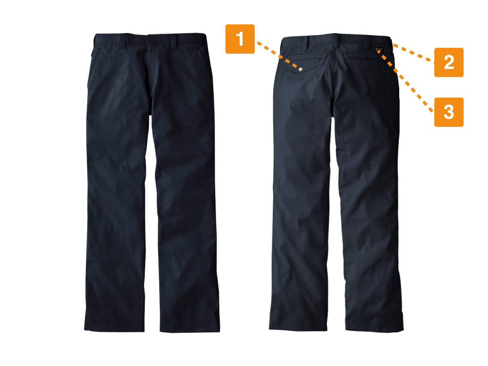 スリムに見せるノータック仕様、通気性と機能性重視でデザインされたこだわりのノータックパンツです。通気性を高めたベンチレーションで、ズボン内の空気の抜けを早める構造になっており、快適な着心地を実現しています。カラビナループは手の届きやすいウエストに付いており、作業でよく使う工具なども簡単に着脱できます。帯電防止機能入りの素材も使い、パチパチする静電気も防止するなど機能性も充実しています。ネービー、シルバー、キャメル、ブラックのシックな4色のカラー展開で、スタイリッシュに着こなすことができます。