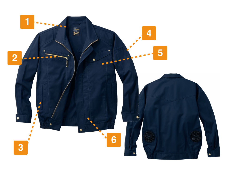 サマーツイル素材を使い、丈夫でタフに設計された空調服シリーズのワークウエアです。腰の左右にある小型ファンで、外気を服内に取入れ、涼しさをアップします。さらに襟元の調整ヒモで、ウエアと首元の間に隙間をつくることにより、空気の流れが増え、より涼しく感じます。収納を重視したポケットなどもウエアの各所に施され、作業でよく使う野帳などの大きいアイテムもすっぽり収まります。身体に帯電する静電気を外へ逃すための帯電防止機能付きで、パチパチする静電気を軽減することが可能です。優れた機能性を兼ね備え、ハードなワークシーンで活躍するワークウエアに仕上がりました。