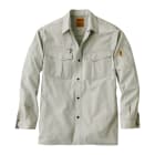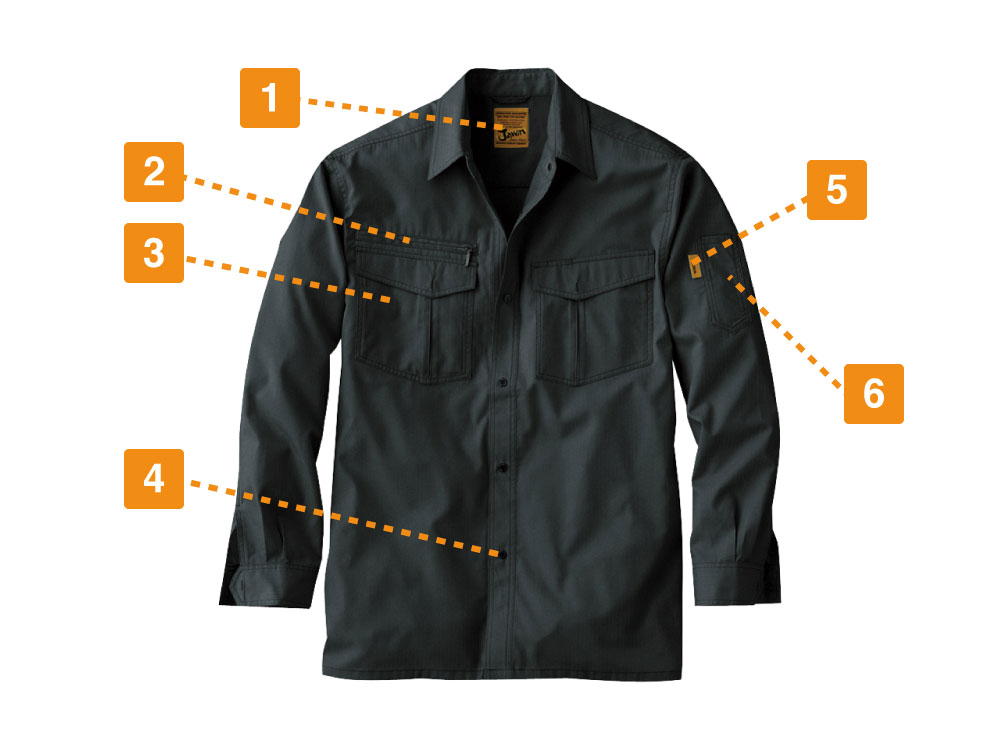 作業服の機能性をしっかり持ちながら個性的な印象を与える大人の男の作業服。シャドーストライプのストライプ生地を採用したこの長袖は、見る角度と光の当たり方で表面感が絶妙に変化します。ポリエステル65%、綿35%の混合生地なので、軽くて肌ざわりも良い上に耐久性もバッチリです。ストレッチ性も高く、大きな動きも邪魔せず、スムーズ。野帳や携帯電話がすっぽり収まる大きめポケットの他、右胸にはファスナー付のポケットも装備されているので小さな工具等も安心です。カラーバリエーションは4色で、サイズはSS~5Lまでと豊富なので、どんな方にも似合う、人や現場を選ばない作業着です。