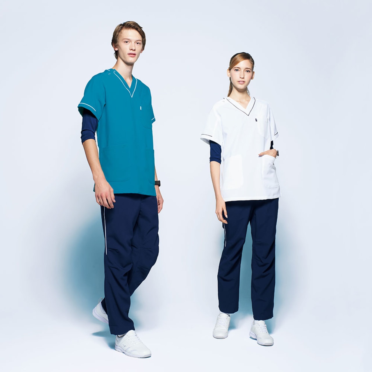 多機能なだけではなく、両サイドのパイピングがおしゃれな「ミズノ」の男女兼用スクラブパンツです。身体の動きを徹底的に追求したミズノ独自の裁断方法「DynamotionFit」を採用。ウエアの引きつれや圧迫感が軽減されています。股下にはマチが付いているので、ゆとりがあります。また、工業洗濯対応で、劣化しにくい高耐久性も嬉しいウエアです。