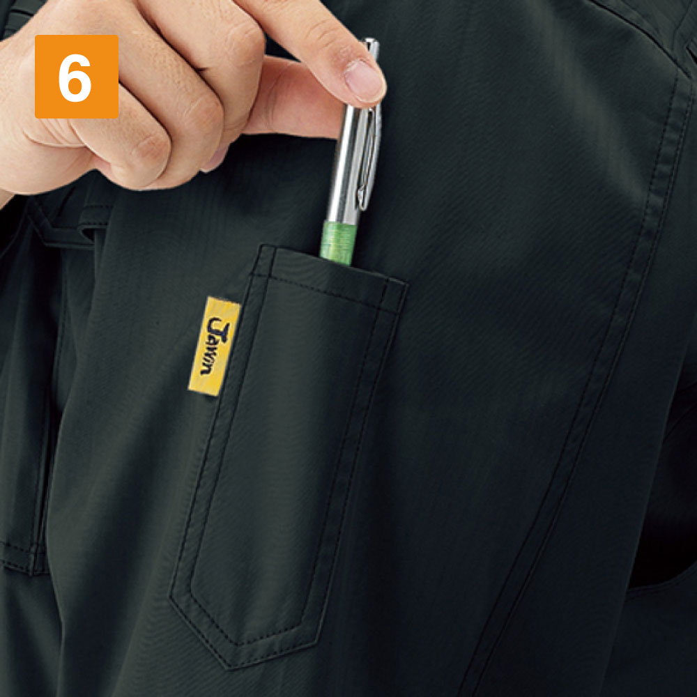 シャドーストライプのストライプ柄を採用したこの半袖は、見る角度と光の当たり方で表面感が絶妙に変化します。ポリエステル65%、綿35%の混紡生地なので、軽くて肌ざわりも良い上に耐久性もバッチリ。野帳や携帯電話がすっぽり収まる大き目ポケットの他、右胸にはファスナー付のポケットも装備されているので小さな工具等も落とす心配もなく安心です。肩はアクションプリーツ仕様なので大きな動きも邪魔しません。カラーバリエーションはシックブラック、ネービー、シルバー、アースグリーンの4色で、サイズはSS~5Lまでと豊富。どんな方にも合う、人や現場を選ばない作業着です。
