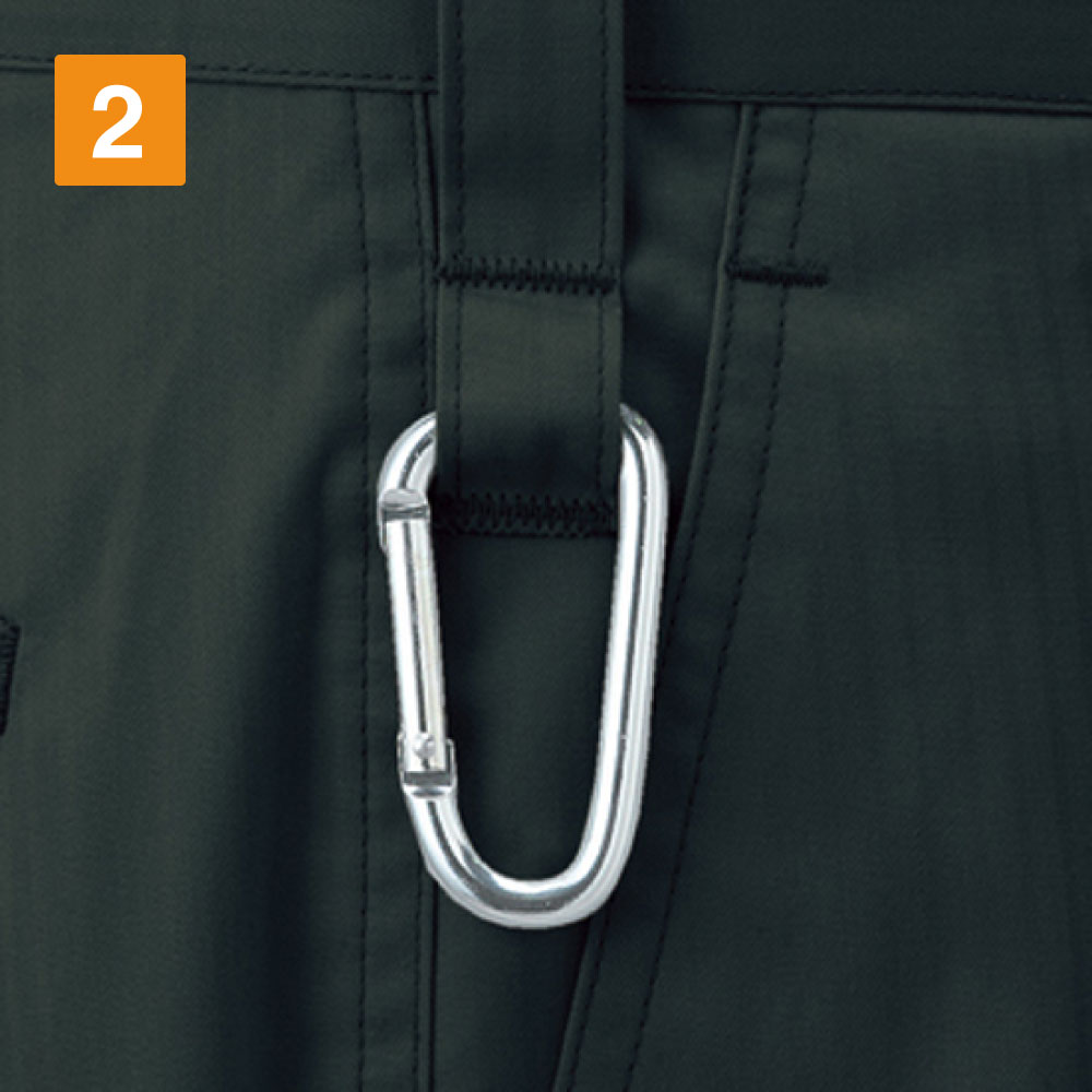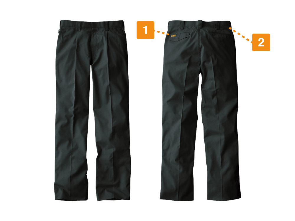 55200シリーズのワンタックパンツです。シャドーストライプサマーツイル素材でデザインされ、ウエストやヒップに遊びをつくるワンタック仕様で、脚にフィット感があり、アクティブな動きもしっかりサポートします。作業アイテムなどの取り外しが簡単なカラビナループが、ウエストに施されています。手の届きやすい位置にはいされていますので、作業時には素早く着脱することが可能です。帯電した静電気を体外へ放出する、制電糸入りの帯電防止機能もついている素材を使用した、機能性に優れたワンタックパンツです。