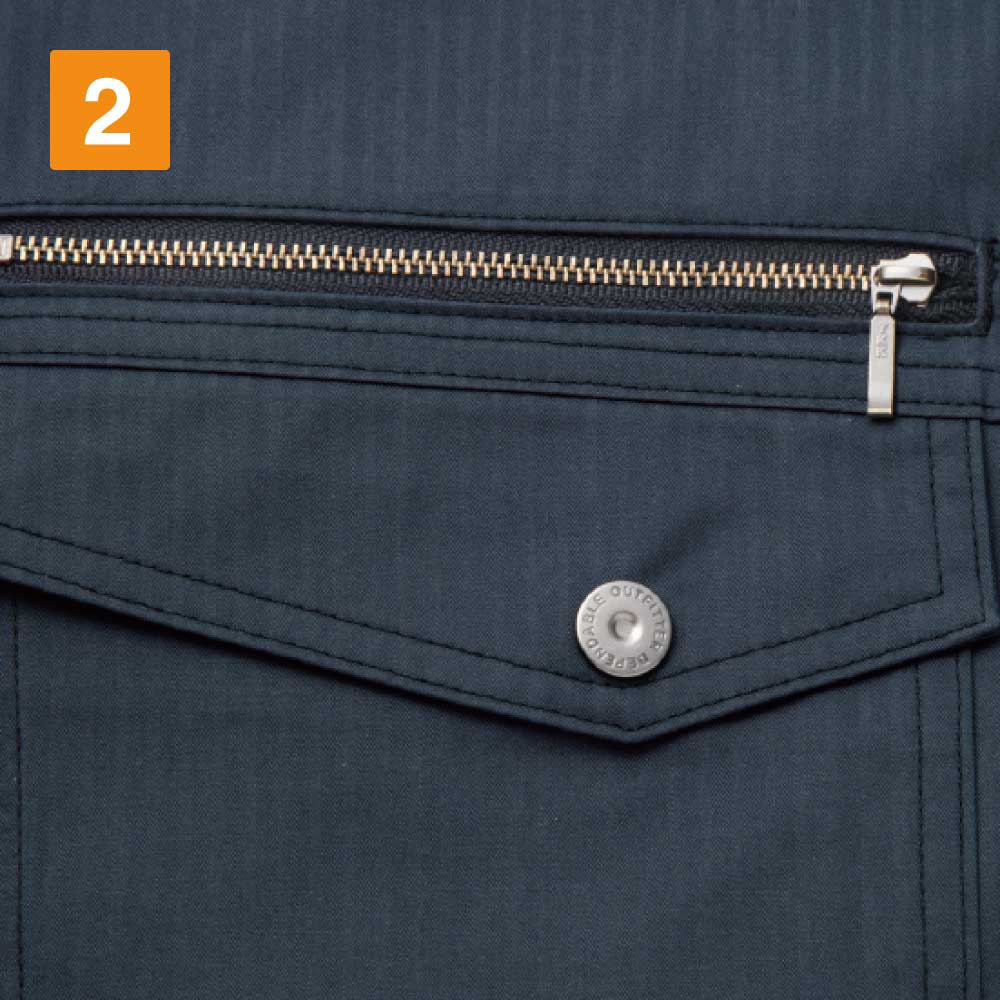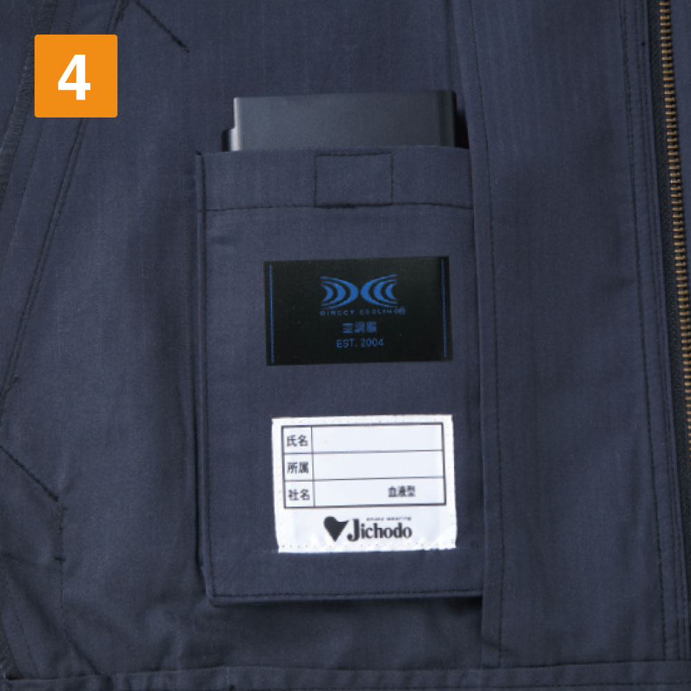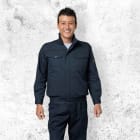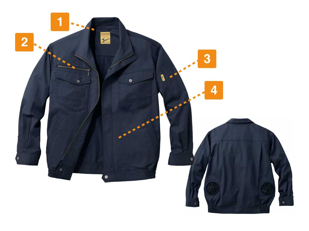 暑いシーズンに大活躍間違いなしの自重堂人気空調服シリーズ、おすすめの一着長袖ブルゾンです。55200をベースにデザインされ、腰には小型ファンを搭載しています。小型ファンを使い、服内の空気を循環させ、快適な涼しさを提供しています。軽量の小型ファンは着脱が簡単で、洗濯の際でも取り外しに手間がかからず、煩わしさを感じさせません。暑いシーズンの作業用に、熱中症を予防できるオススメの一着です。収納に優れた大型ポケット、帯電防止機能など、機能性も充実しています。ハードに働く作業などにおすすめのワークウエアです。