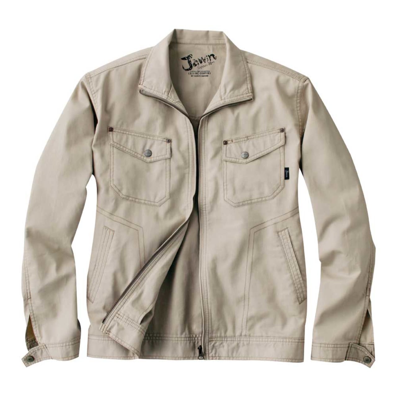 親しみやすくどんな現場でも着こなせるジャウィンのジャンパーは、ワークウェアにぴったりの綿100%ドビーを使用。コットン素材は丈夫で繰り返し洗濯をしてもへたりにくい特徴があり、吸水性も高いため乾きやすいメリットもあります。また、肌ざわりが良く吸汗性に優れており、快適なワークライフを送ることができます。胸ポケットに佇むオリジナルデザインのボタンとリベットは、使い込まれた深みのある質感を採用しています。ドビー独自の風合いを活かしたデニムテイストな雰囲気は、毎日着るの作業着としても飽きのこないデザインです。