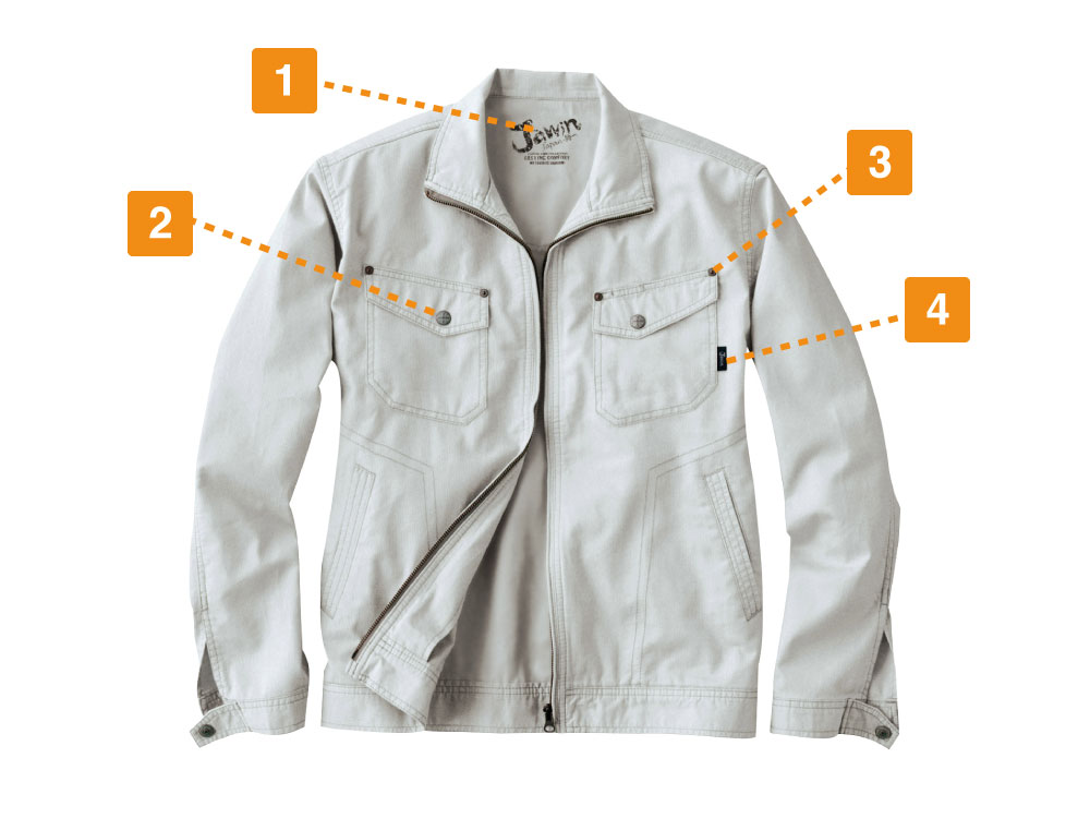 ポリエステル系の素材を活用することの多いワークウェアですが、ジャウィンの51100シリーズは綿を贅沢に100%使用しています。どの作業現場でも汚れやすいワークウェアは頻回に洗濯をするため、へたりにくい丈夫さは最大のメリットとなります。それでいてソフトなやわらかさは、長時間着ていてもストレスフリーというワークウェアに求められる特性を活かしています。ドビーのデニム生地のような織りは、デザイン性もさることながら吸水性やシワになりにくいといったメリットも多く、ワークウェアに最適です。そのため、デザイン・機能性どちらも求める方におすすめの1着と言えます。