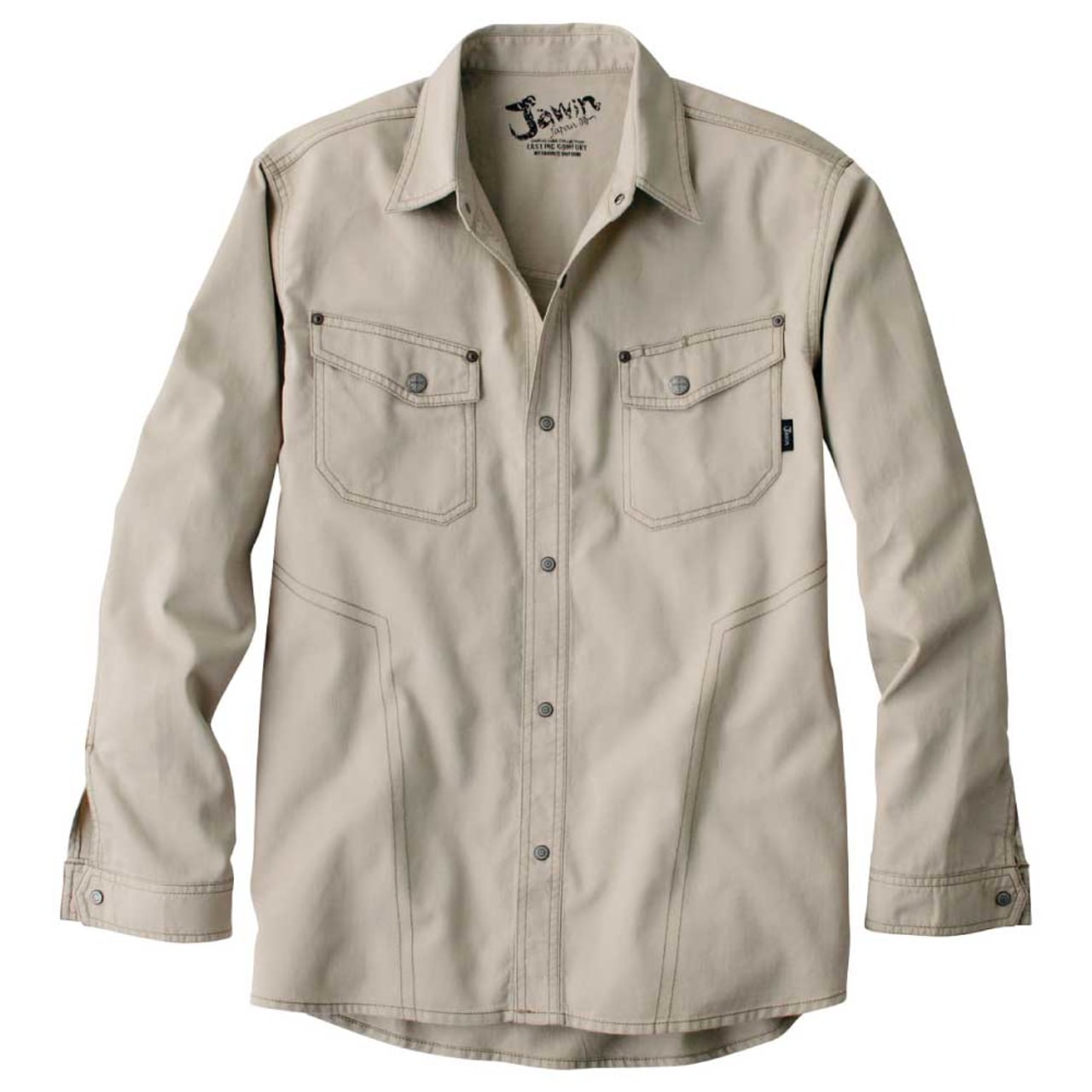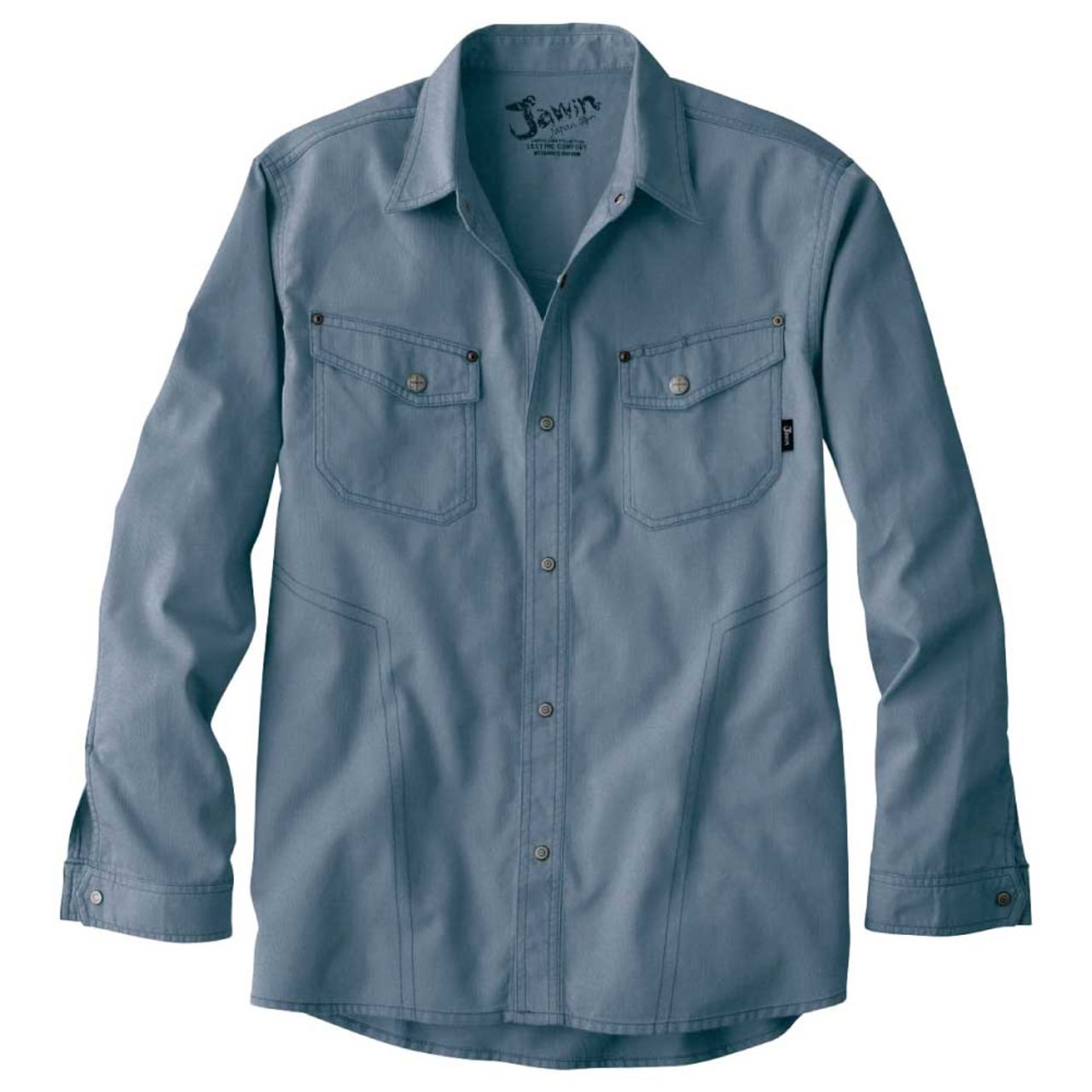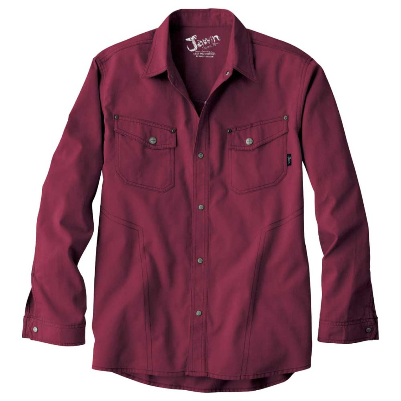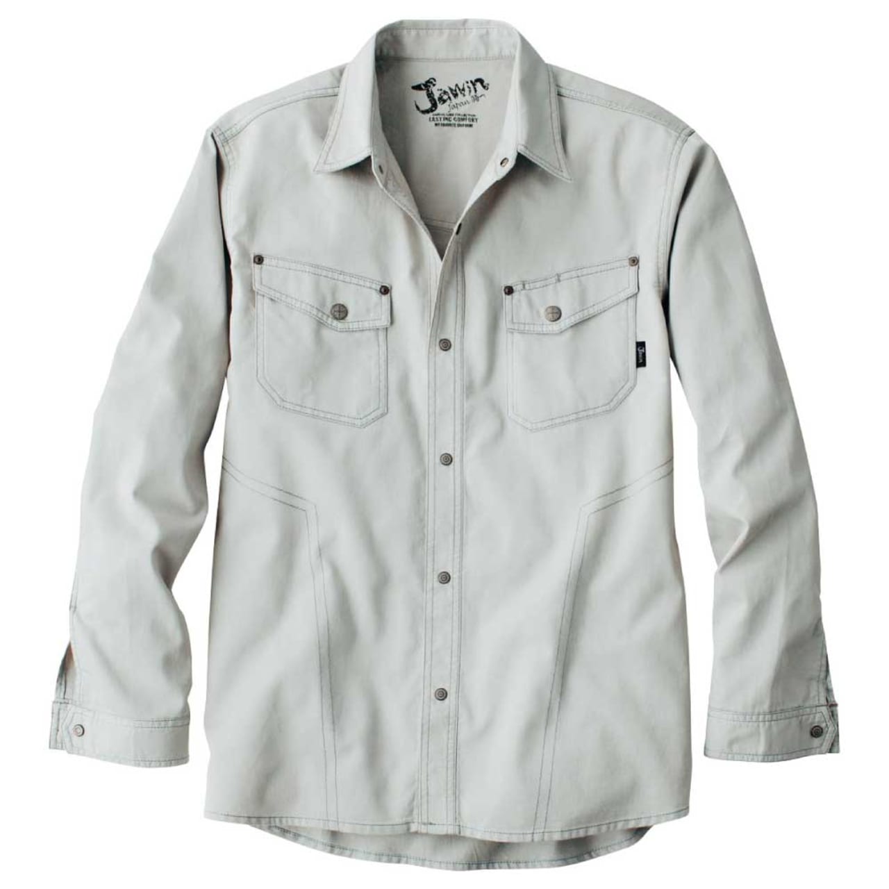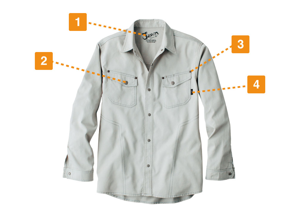 汚れやすく洗濯を頻回にすることが多いワークウェアは、長く使える丈夫さを求められます。自重堂の長袖シャツは、綿を贅沢に100%使用し、繰り返しの洗濯でもへたりにくく、吸水性も高いことから乾きやすさも人気のシャツです。ドビー特有のデニム生地のようなデザイン性の高さと、織りによる吸水性やシワになりにくいといったメリットも魅力のひとつ。背中プリントやワンポイントもシンプルななかに、さりげないジャウィンのこだわりが光ります。デザイン・機能性を兼ね備えた、まさにワークウェアに適した1着と言えます。