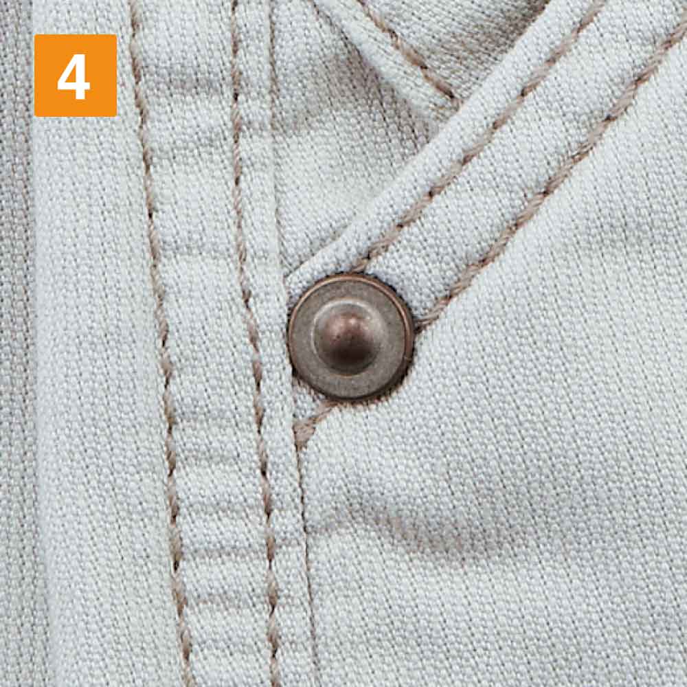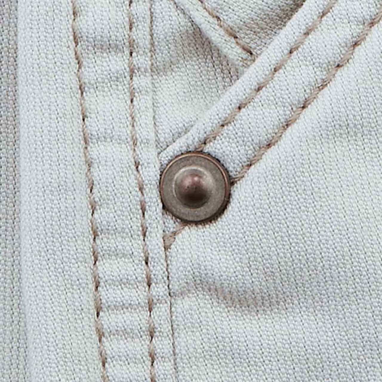 綿素材は丈夫で繰り返し洗濯をしてもへたりにくい特徴があり、気軽に使うことができる素材のため定番ワークウェアにぴったりです。天然素材ならではの肌ざわりの良さと、吸水・吸汗性にも優れた機能性もあり、ワークウェアにとって理想的な穿きごこちを生み出します。親しみやすくカジュアルに着こなせるドビー独自の立体感のある織りは、通気性の良さも兼ね備えたワーカーに人気の商品です。ブランドオリジナルのタックボタンとリベットは、使い込んだ独特の風合いを採用し耐久性の高い仕上がりです。