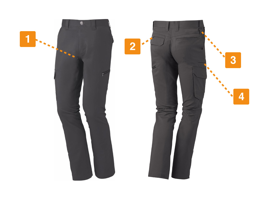 道具や、工具など作業でよく使うアイテムも簡単に着脱できるカラビナループは、手の届きやすいウエストに付属しており、右足側にあるマルチポケットは、大型なアイテムもすっぽり収納できます。大事な道具も紛失から守る、収納機能を重視したカーゴパンツに仕上がりました。消臭・抗菌作用があるテープで、作業中の気になる臭いも防ぎます。帯電機能も付いていて、充実した機能で仕事をしっかりサポートします。伸縮性のあるストレッチ素材を使い、快適な履き心地を実現しています。カラーは、スチールグレー、ネービー、シルバー、アーミーグリーンのシックな4色で展開しています。