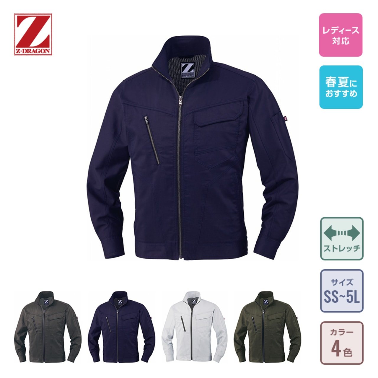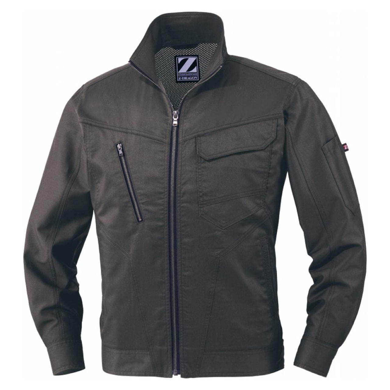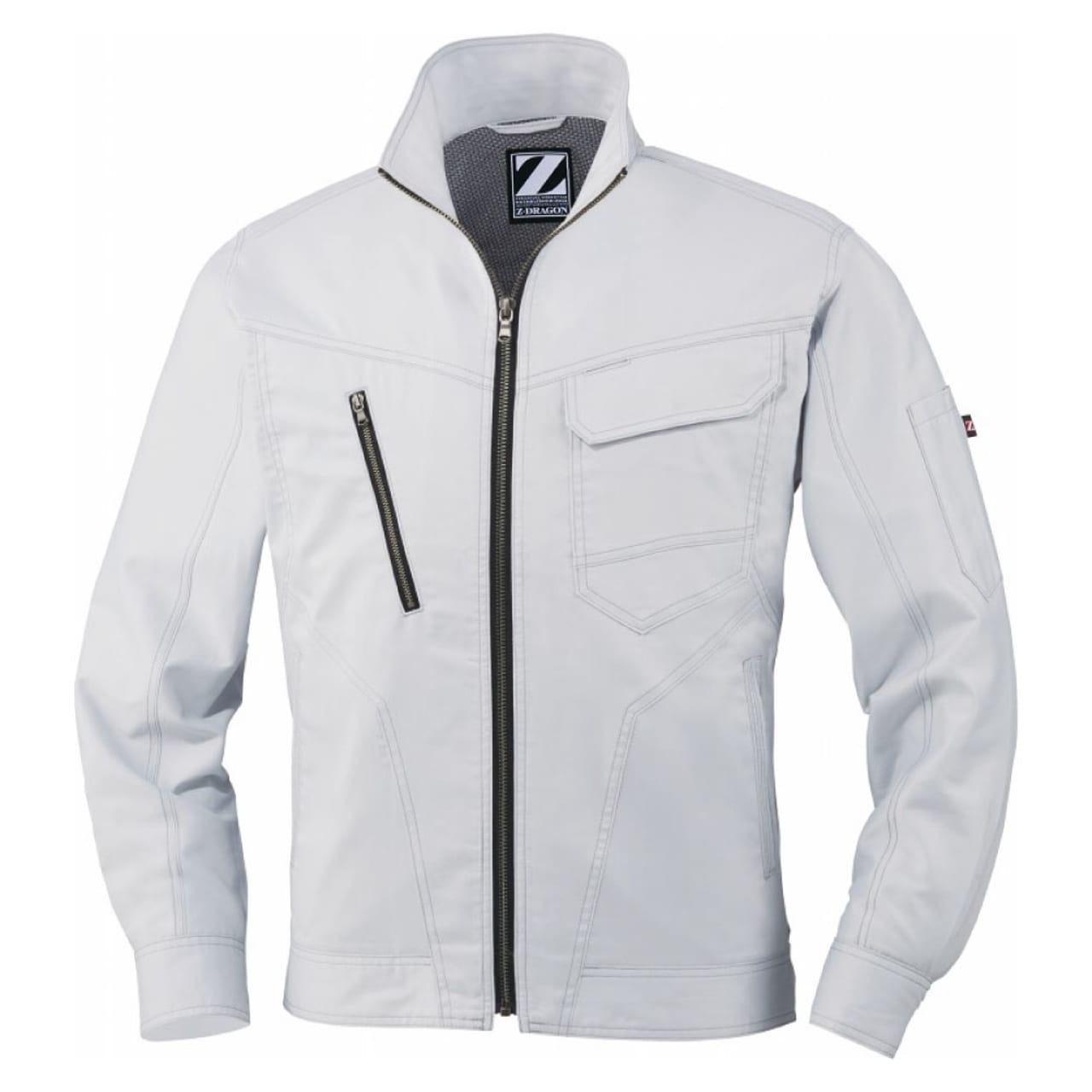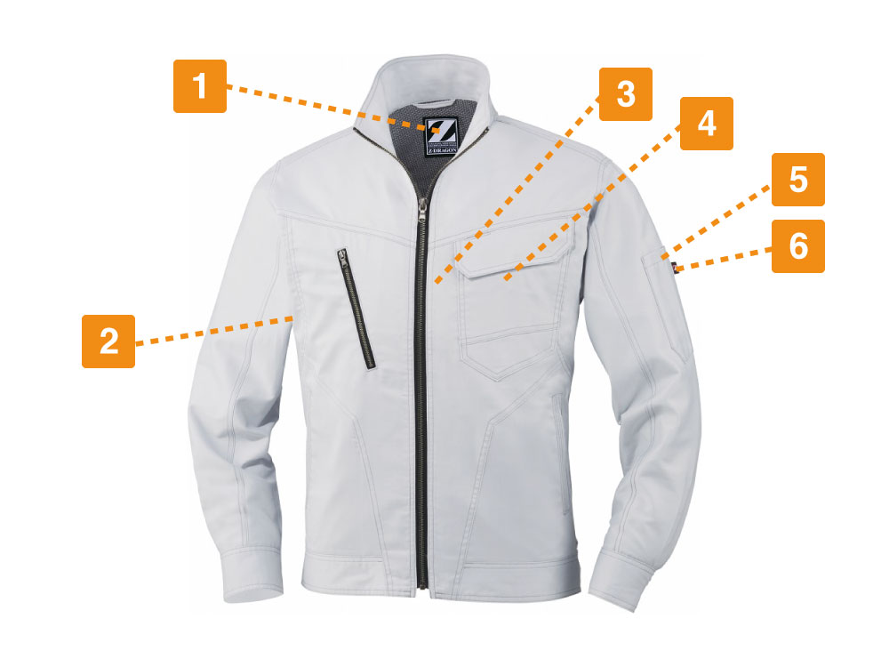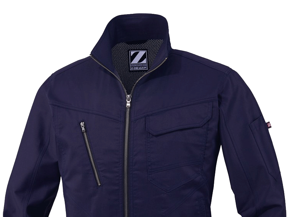 「Z-DRAGON」の長袖ジャンパーは、天然コットンの優しい風合いや通気性、吸収性の高さとポリエステルが持つ耐久性や伸縮性をベストマッチさせて開発されたバンジーテックサマーツイルを使っています。軽い着心地でどんな動作も快適。さまざまな作業現場で活躍しています。抗菌・消臭素材だから汗をかいても安心。野帳や携帯電話など、大きめのものもすっぽり入る内ポケットの他に、左胸には二重仕様のポケット、右胸にはチャック付のポケットが付いているので、大事なものを紛失する心配もありません。カラーは、ネービー、シルバー、アーミーグリーン、スチールグレーの4色。男女問わず着用可能なユニセックス仕様です。