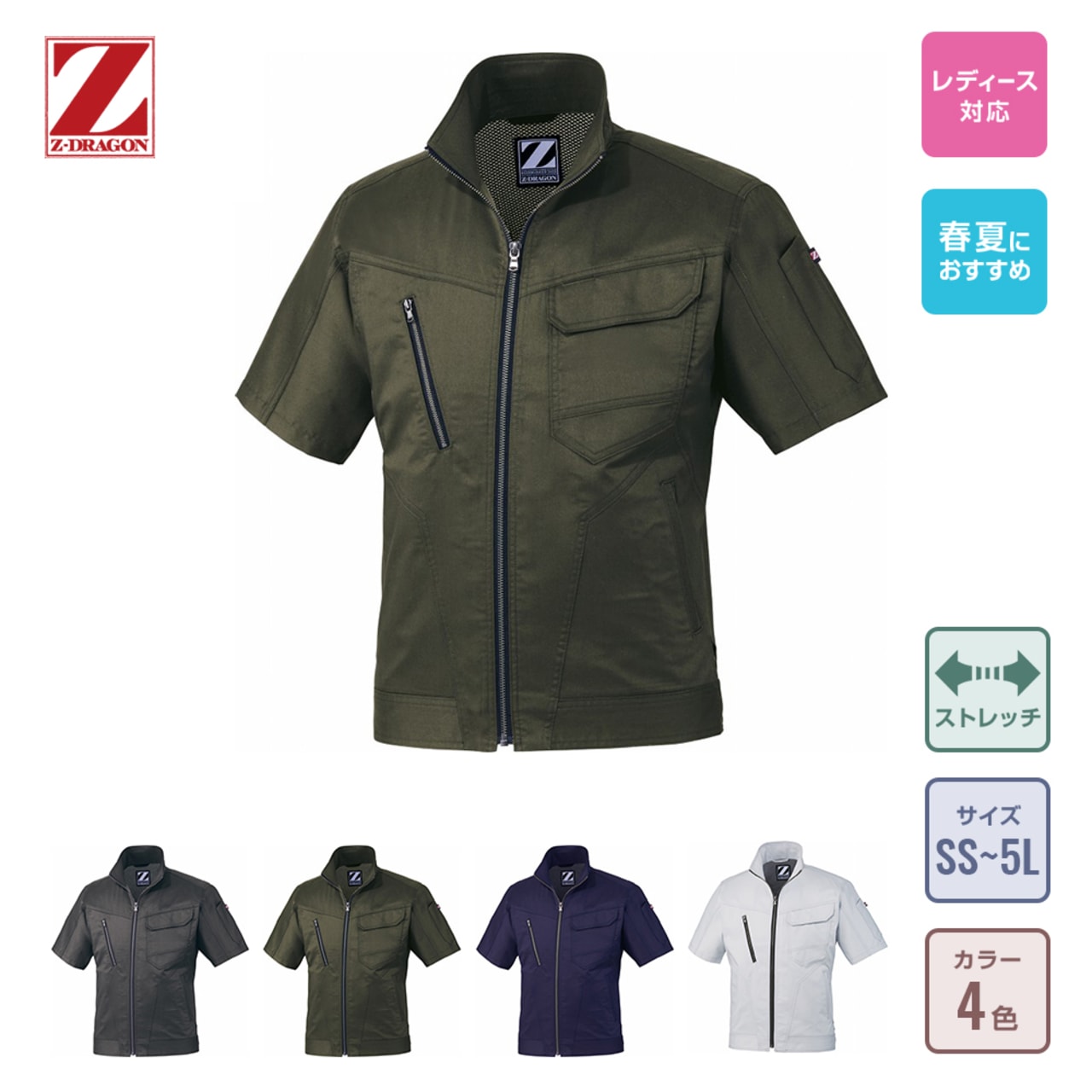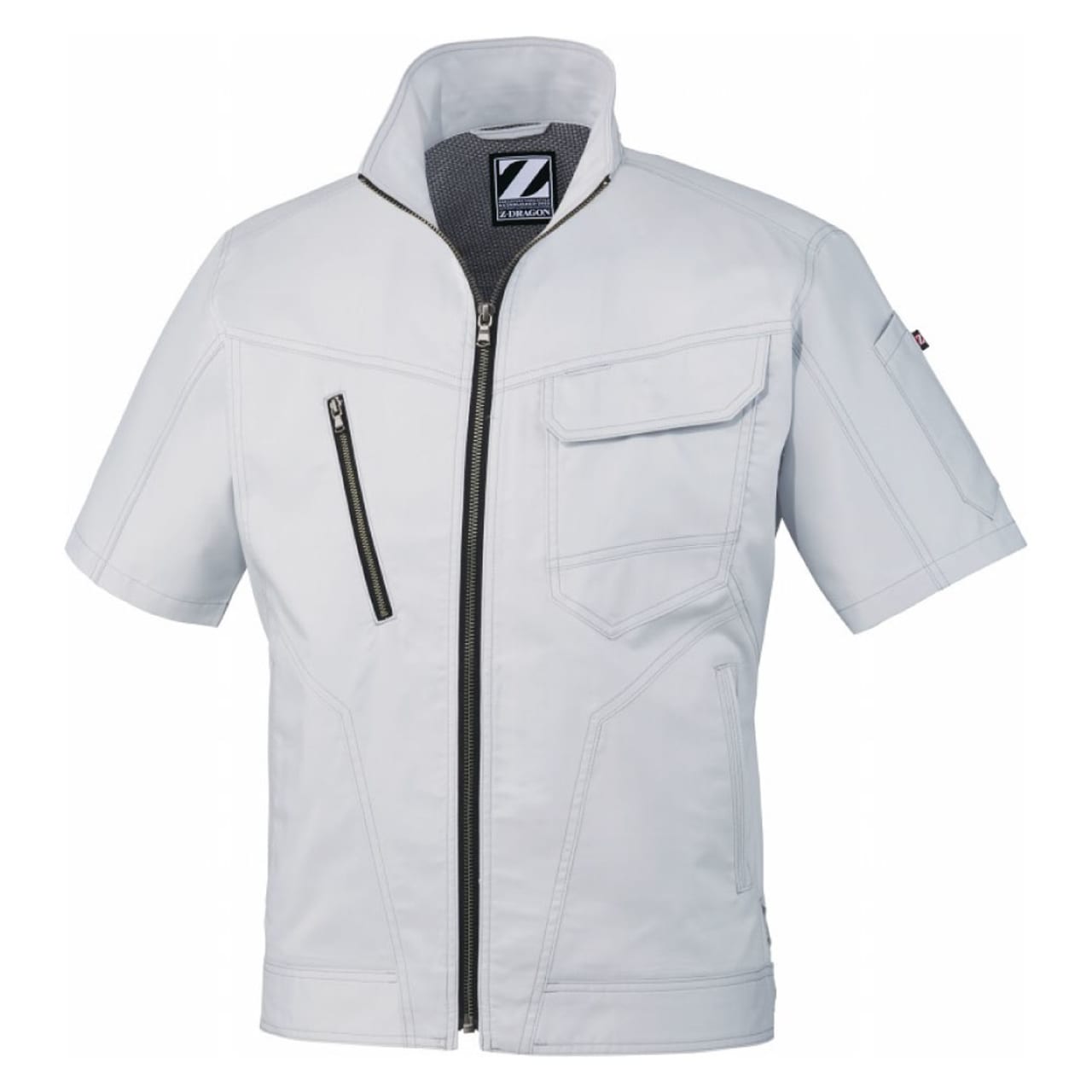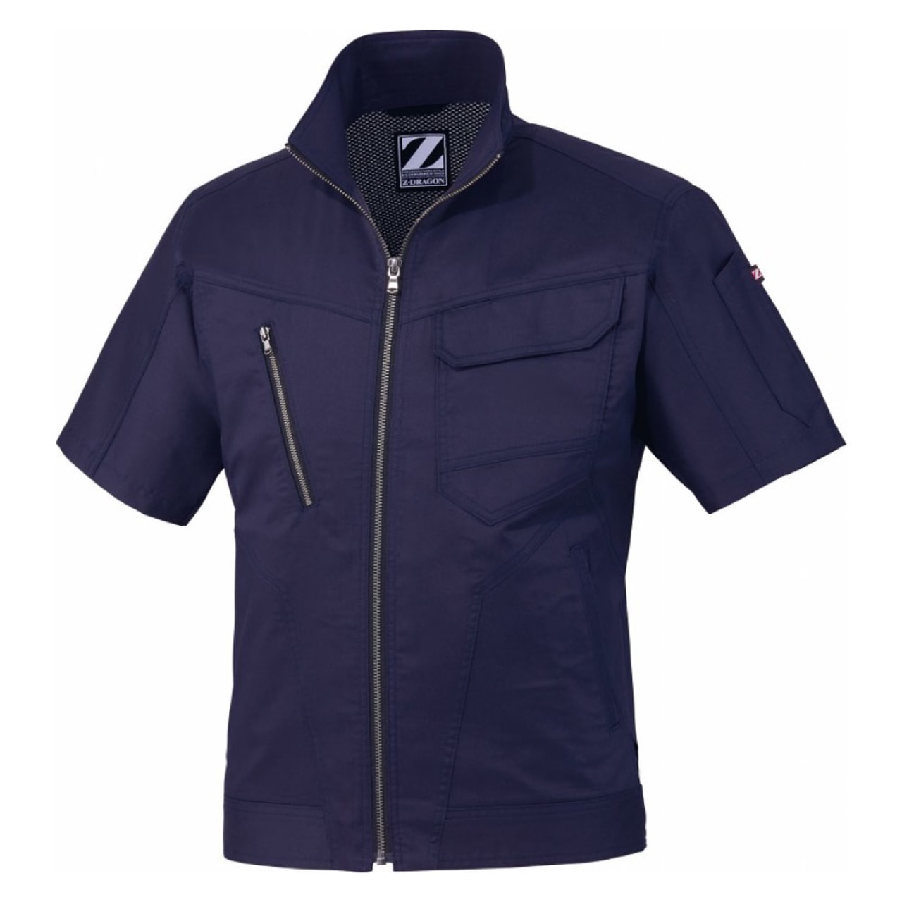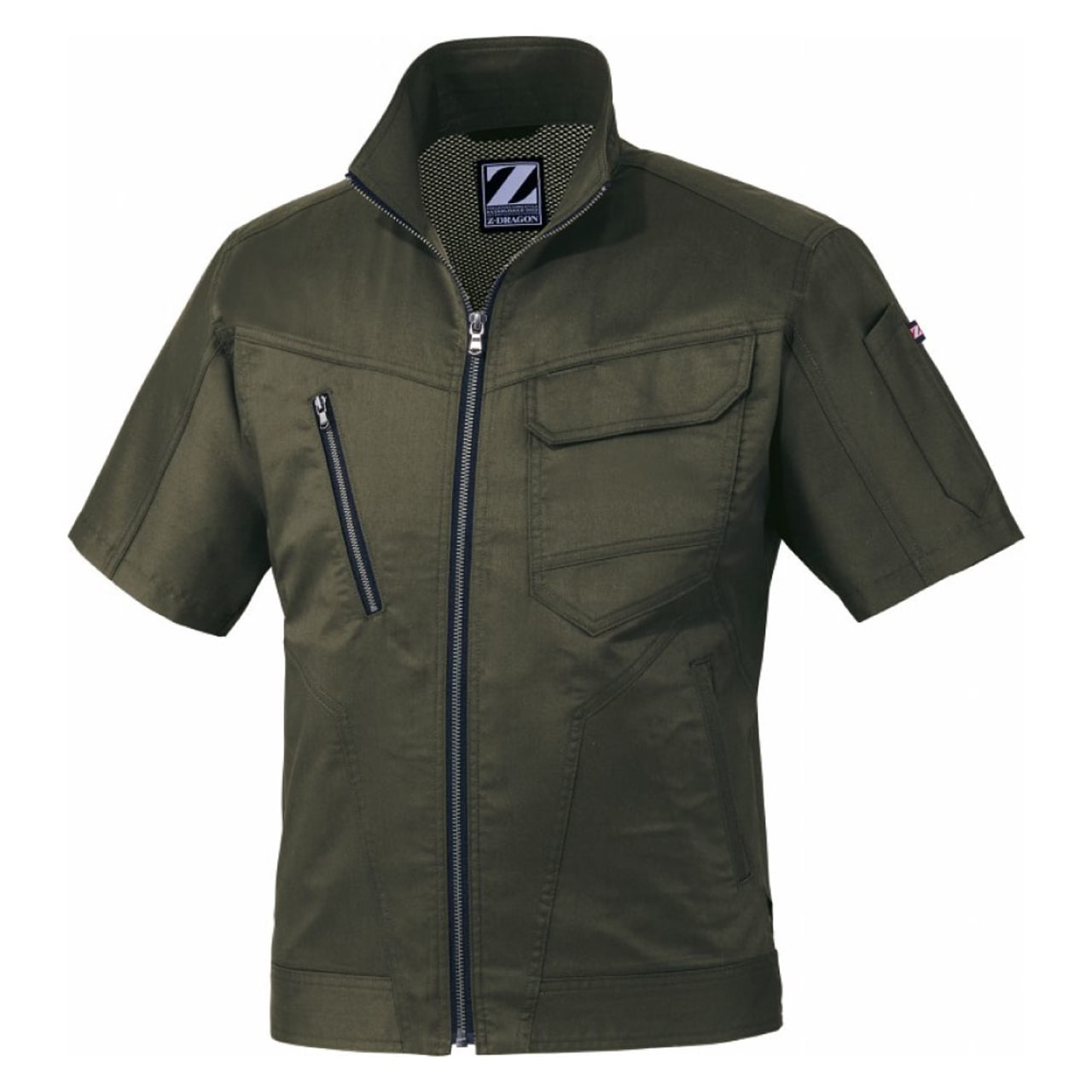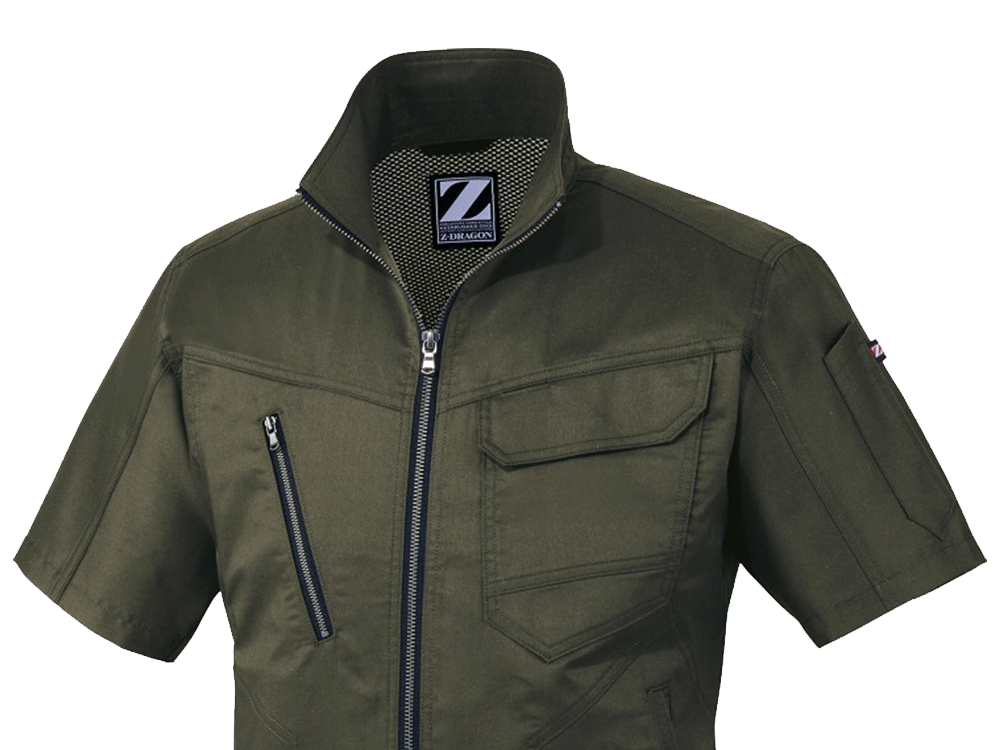バンジーテックサマーツイルという、コットンの優しい風合いと吸水性や通気性とポリエステルが持つ耐久性や伸縮性を併せ持つ作業着のための生地。軽い着心地でどんな動作も快適な「Z-DRAGON」の半袖ジャンパーです。汗をかいても安心な抗菌・消臭素材。野帳や携帯電話がすっぽり入る内ポケットの他に、右胸にはファスナー付のポケット、左胸には二重仕様のポケットが付いており、必要なものをしっかり身につけておけます。カラーは嬉しい4色展開。ネービー、シルバー、アーミーグリーン、スチールグレーと落ちついた色合いでサイズ展開も豊富なので、男女問わず着用可能です。