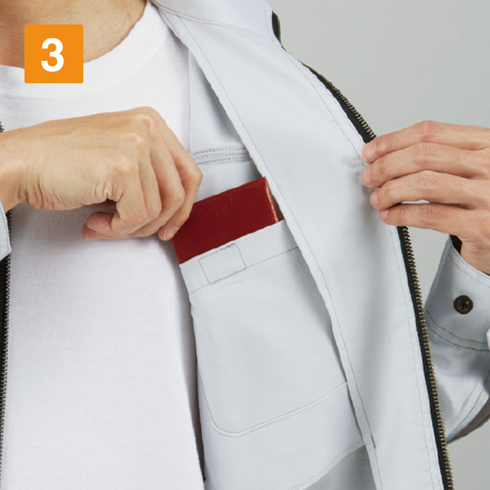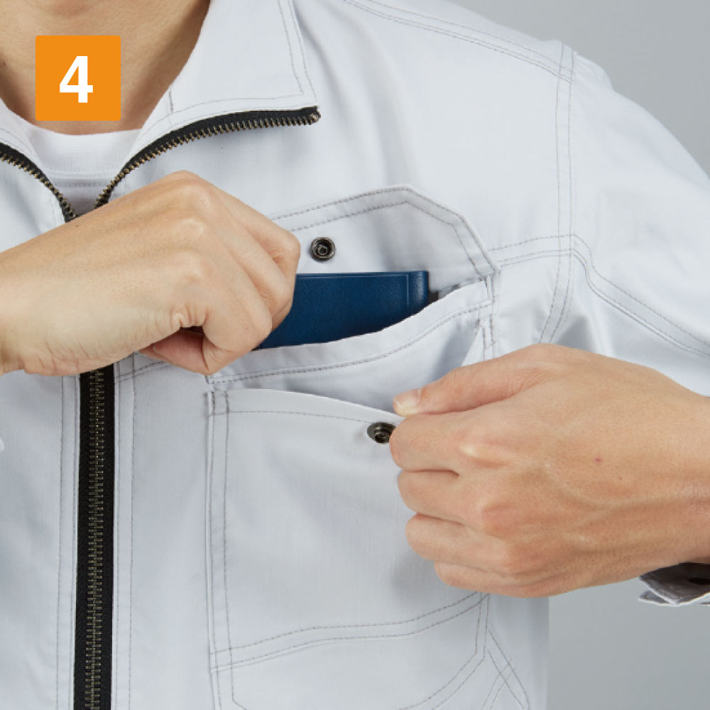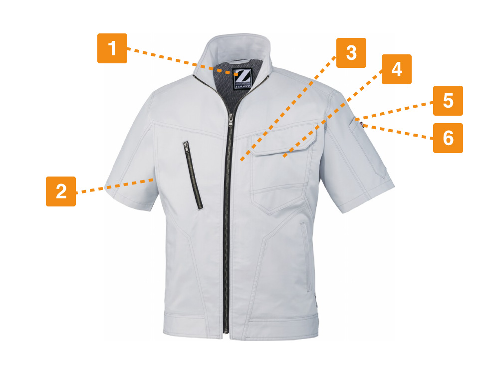 耐久性が高く劣化しづらいこの半袖ジャンパーは、ストレッチ性に優れ、さまざまな現場の作業着として最適です。抗菌・消臭効果があり、気になる臭いも防いでくれるため春夏のアイテムのひとつとして欠かせません。帯電防止素材だから静電気も防ぎ、あらゆる作業にも安心。両脇ポケットの他に左右の胸にはチャック付きのポケットと二重仕様のポケットがついており、野帳や携帯電話も落とすことなく作業ができます。左内側に付いている内ポケットと袖部分に装備されたペン差しも便利。首元まで覆ってくれる襟は、強風も日差しも防いでくれるため快適です。