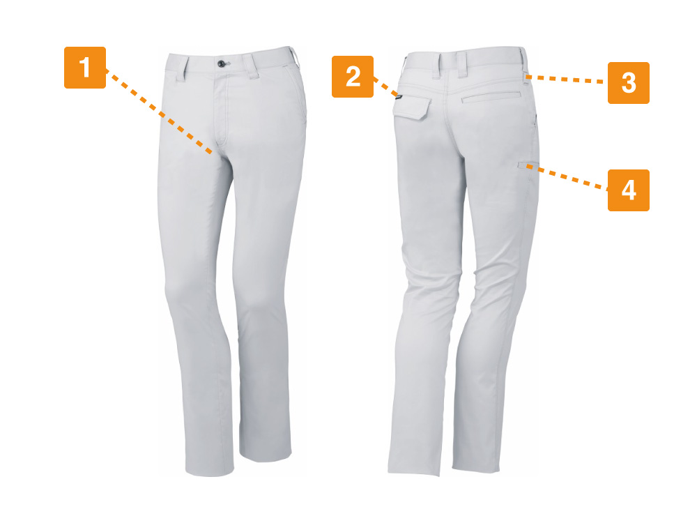 耐久性が高く劣化しづらい上に、ストレッチ性にも優れている「Z-DRAGON」のノータックパンツ。伸縮性が高いため、膝の曲げ伸ばしで感じがちな窮屈感もありません。洗濯もしやすく、シワにもなりにくいので毎日の作業にオススメです。抗菌・消臭効果もあるため、気になる臭いも防いでくれます。帯電防止素材だからあらゆる作業にも安心。両脇と左右のお尻側に合計4つのポケットが装備されているので、収納もバッチリです。カラビナが付けられるループが付いているのも嬉しいポイントです。