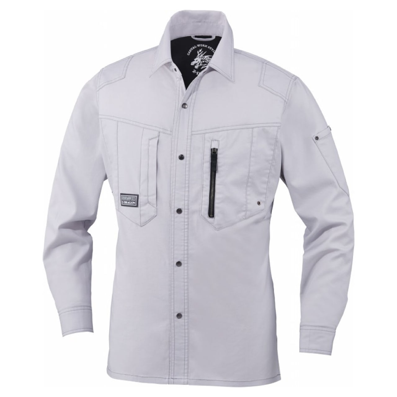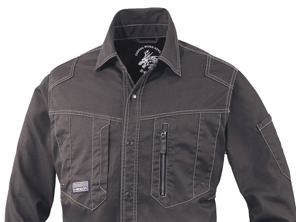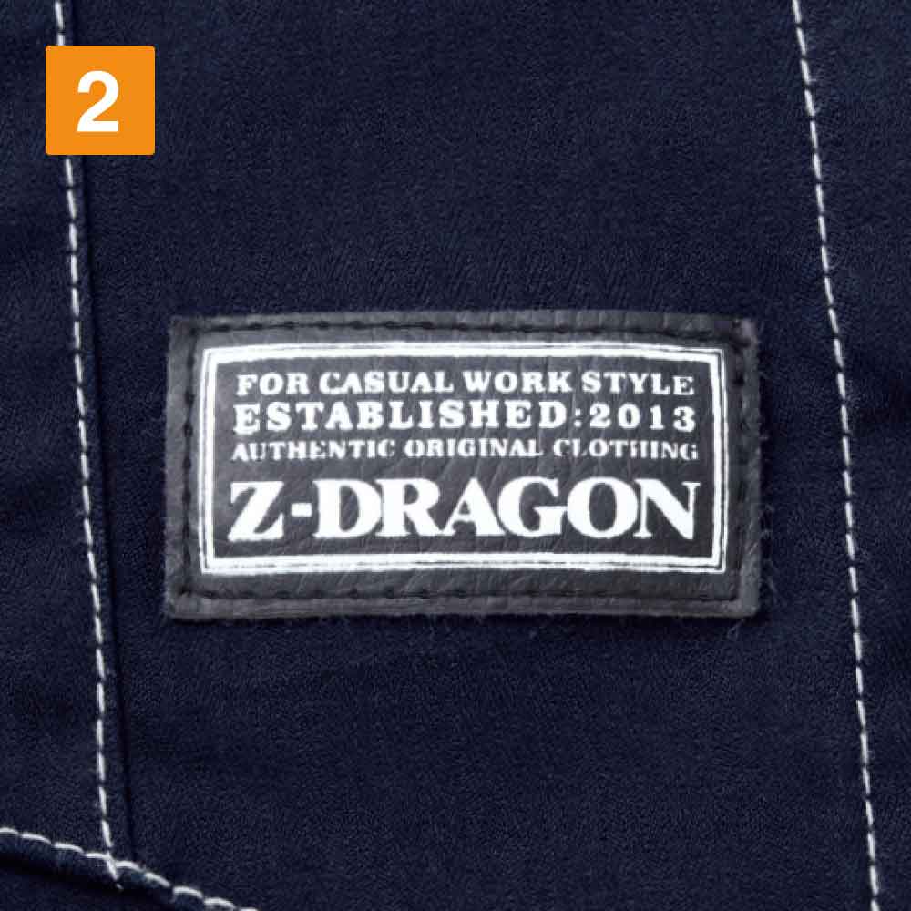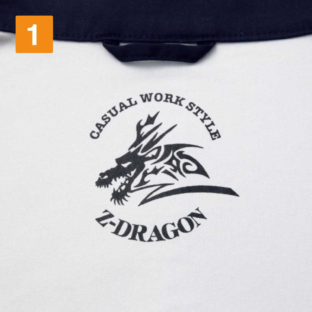 ワーキングウエアとしてだけではなく、普段着としても着られるようなボディカラー、ネイビー・シルバー・ブラック・サンドベージュ・スチールグレーの全5色。右胸ポケットのZ-DRAGONのロゴがブランド力をアピール。また、シルバー・サンドベージュ・スチールグレーならば左胸ポケットの縦ファスナーが際立ち、アクセントの一つに。背当てのドラゴンのプリントはボディカラーによって異なるのもおしゃれポイントです。