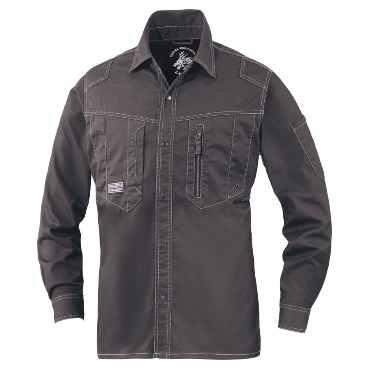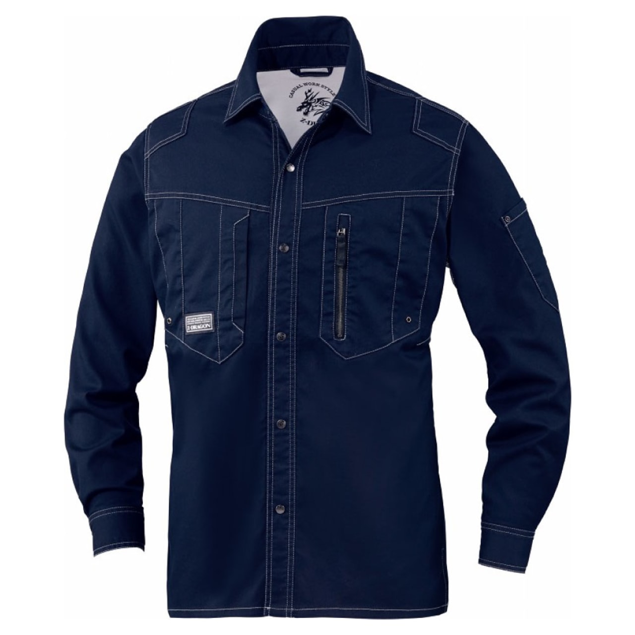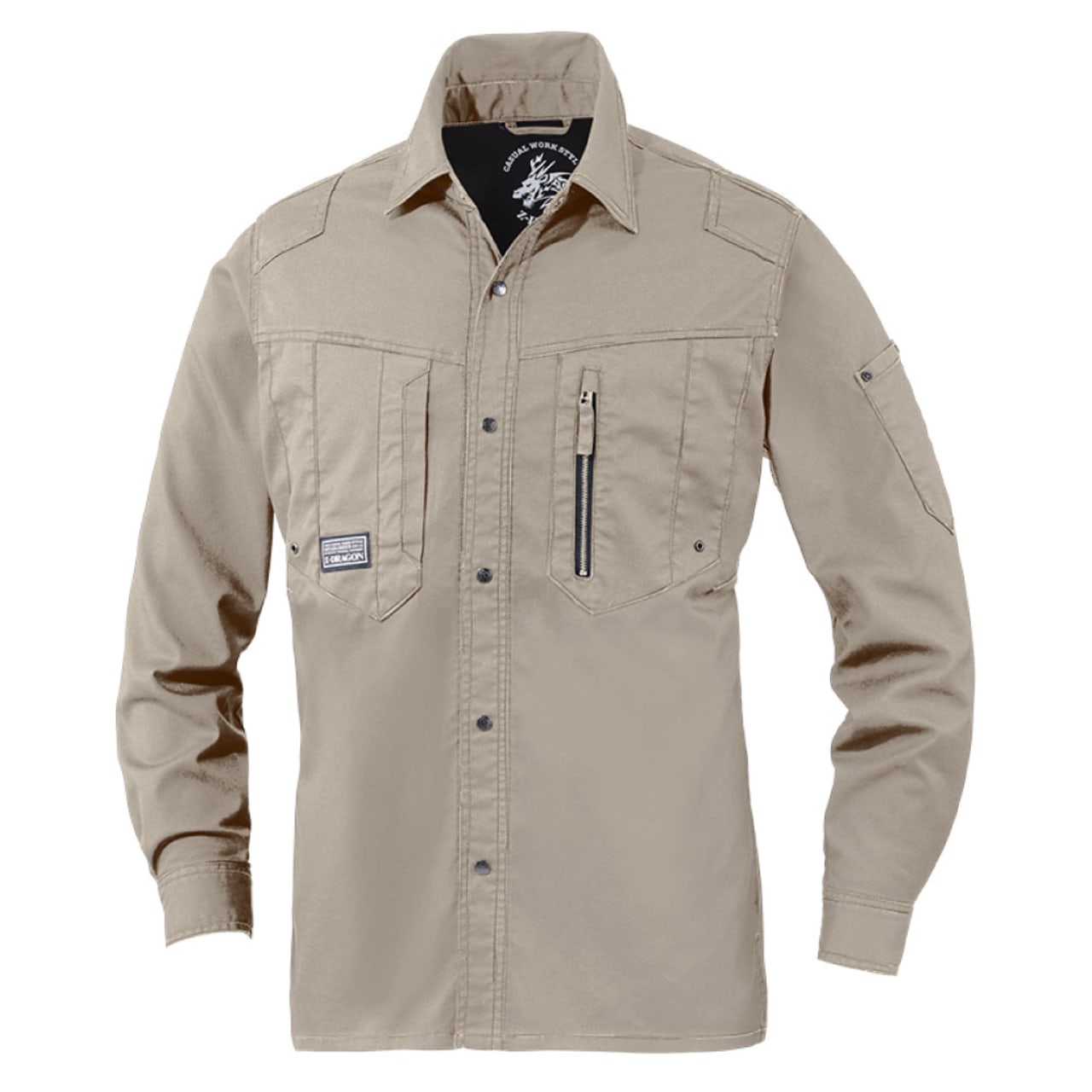 ワーキングウエアとしてだけではなく、普段着としても着られるようなボディカラー、ネイビー・シルバー・ブラック・サンドベージュ・スチールグレーの全5色。右胸ポケットのZ-DRAGONのロゴがブランド力をアピール。また、シルバー・サンドベージュ・スチールグレーならば左胸ポケットの縦ファスナーが際立ち、アクセントの一つに。背当てのドラゴンのプリントはボディカラーによって異なるのもおしゃれポイントです。