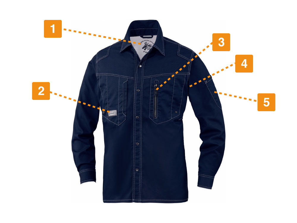 ストレッチ長袖シャツに使用している素材のストレッチツイルは、綿を高混率で配合しています。ソフトな肌ざわりと丈夫で長持ちする生地は、ワークウェアにぴったり。吸水性と吸汗性もあるため、汗をかいても不快感が少なく、脇下メッシュのおかげでさわやかな着ごこちをキープします。制限が多い高所作業でも、細身のシルエットが体に適度にフィットしハードな動きにも対応。伸縮性のおかげでストレスフリーです。度重なる洗濯にも耐える丈夫さも、ワークウェアにとって評価すべきポイント。全5色のカラーリングと選べるサイズの豊富さも魅力のひとつです。