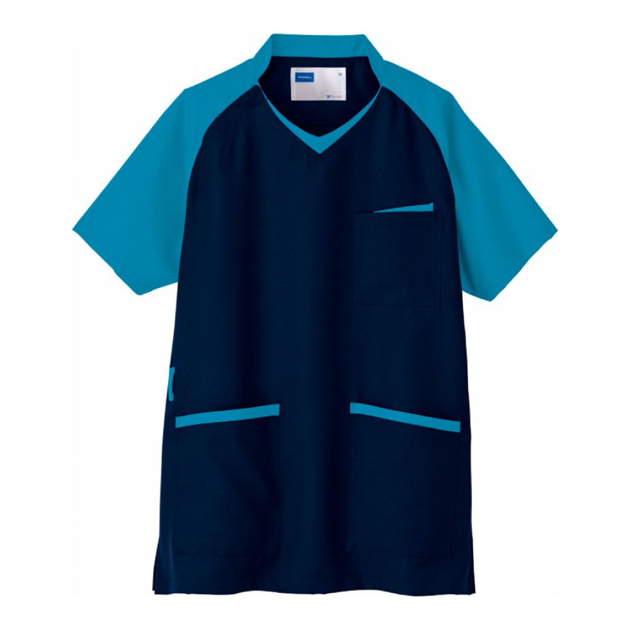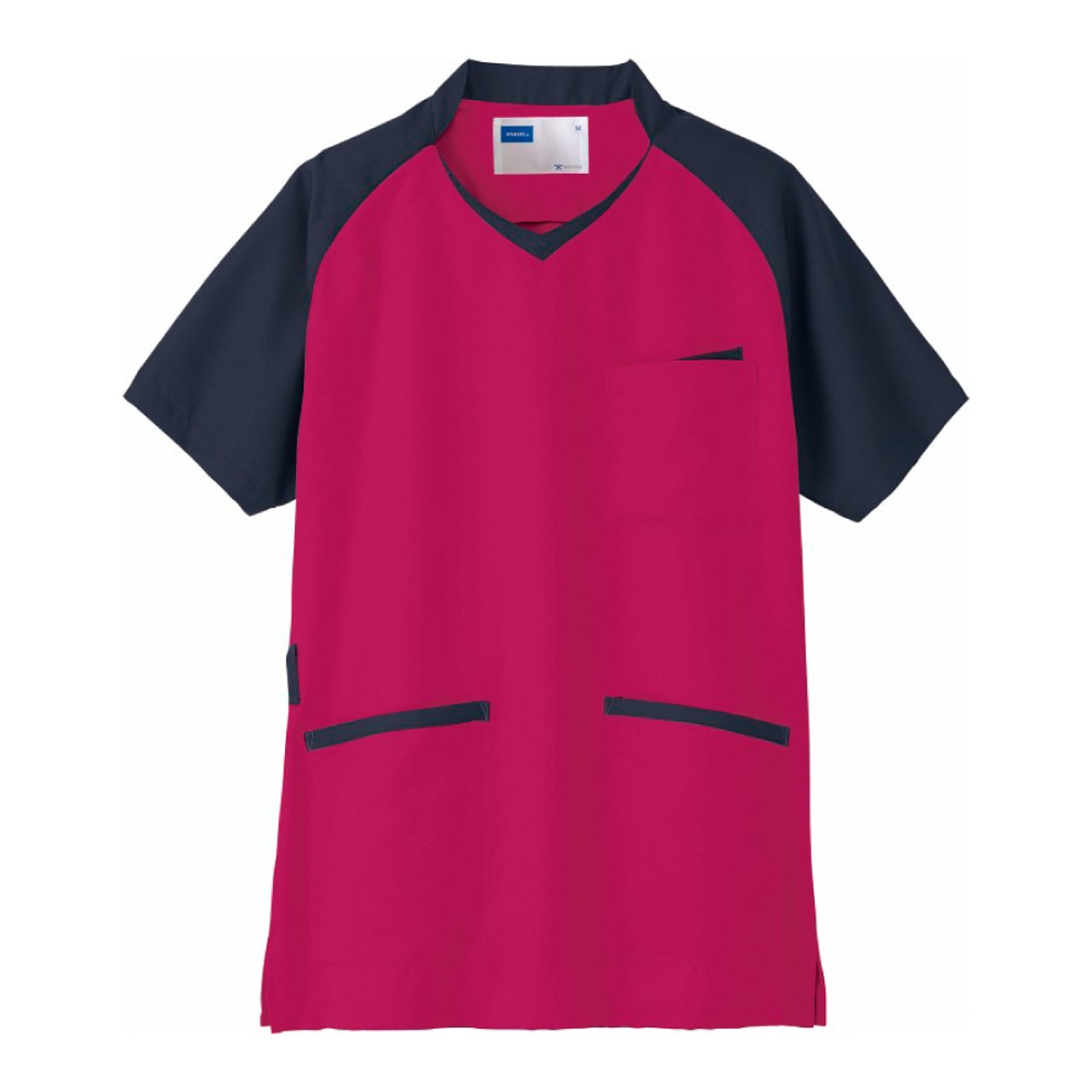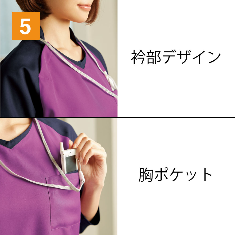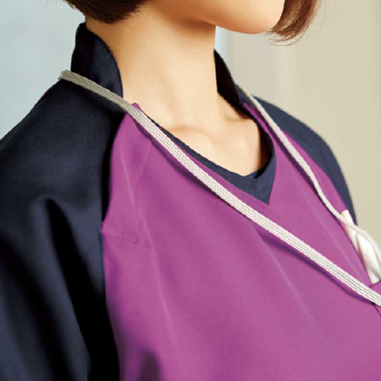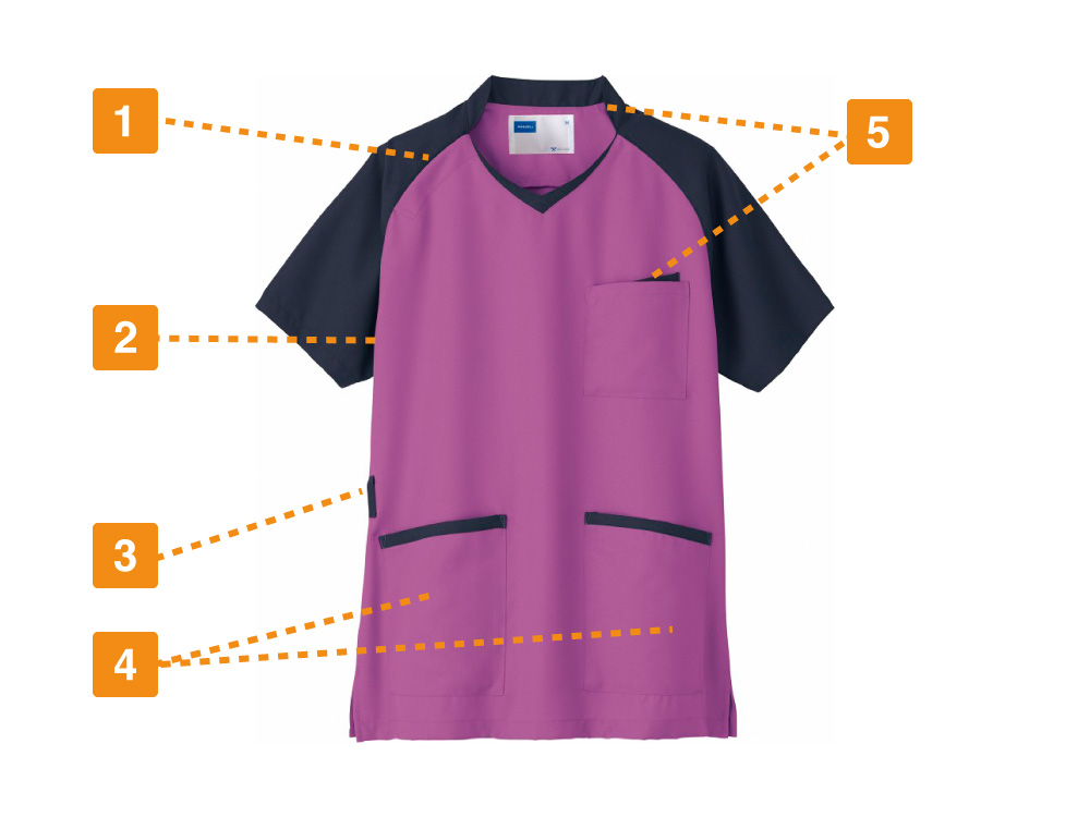 白のイメージが強い医療現場。そんなイメージをカラフルな実用ウエアが一新。いま注目を集めるカラフルなスクラブです。 ボディカラーとは異なる配色が両肩に施され、まるでラグランTシャツ風のデザインに。さらに両肩の配色と同色で襟元やポケットにも切り替えしが施され、おしゃれなデザインになっています。脇下には消臭・抗菌効果のあるテープがセットされ、汗のニオイを軽減。生地には制電糸を使用しているので、まとわりのない快適な着心地が仕事への集中力を高めてくれます。