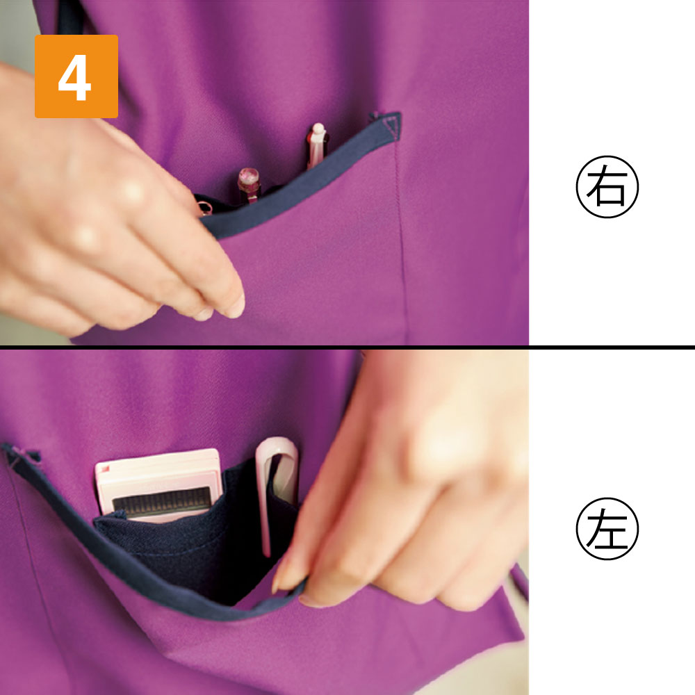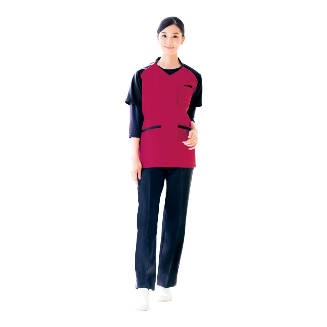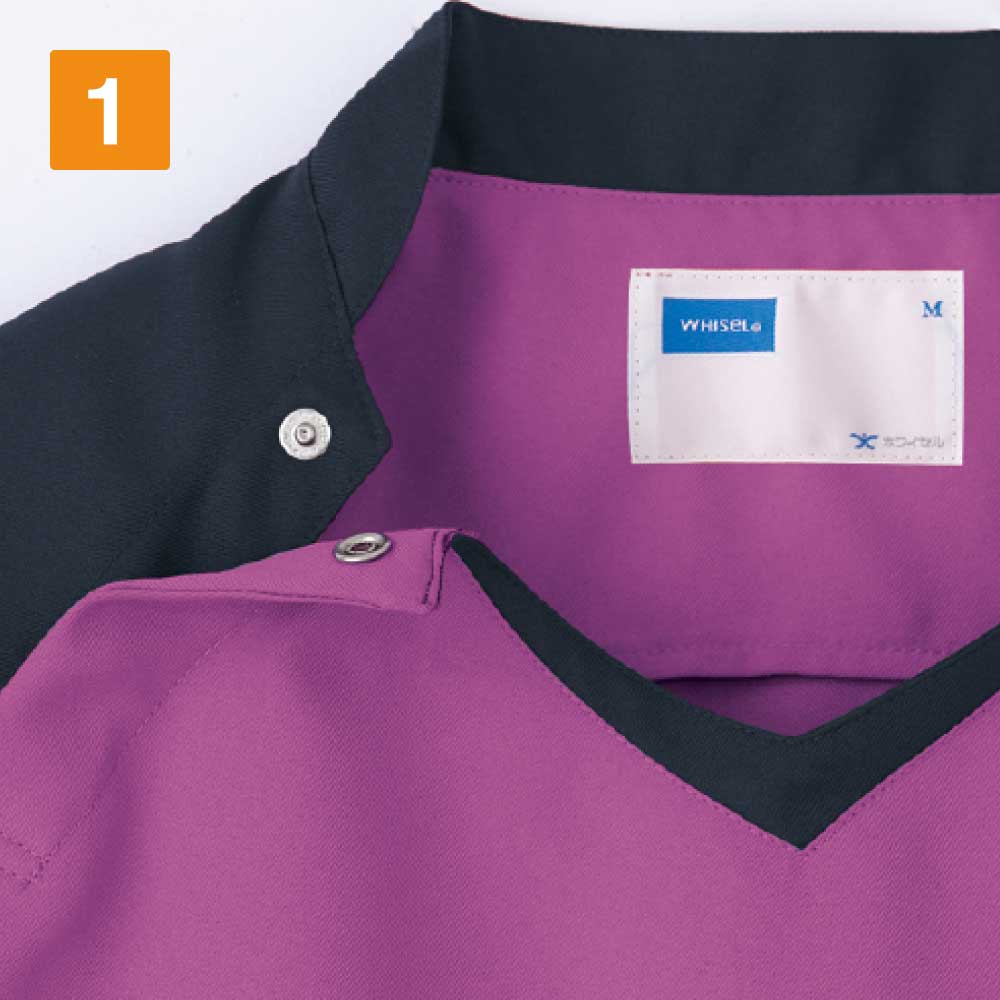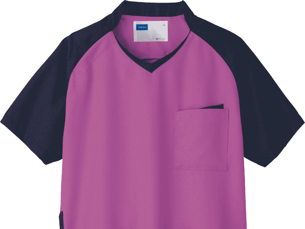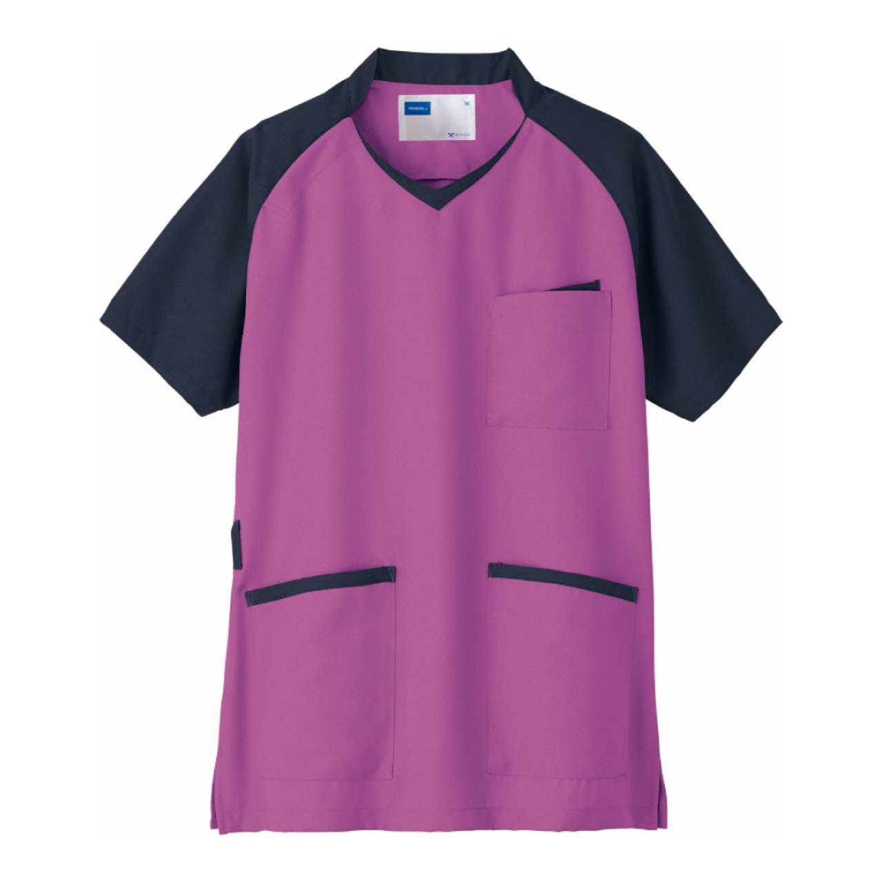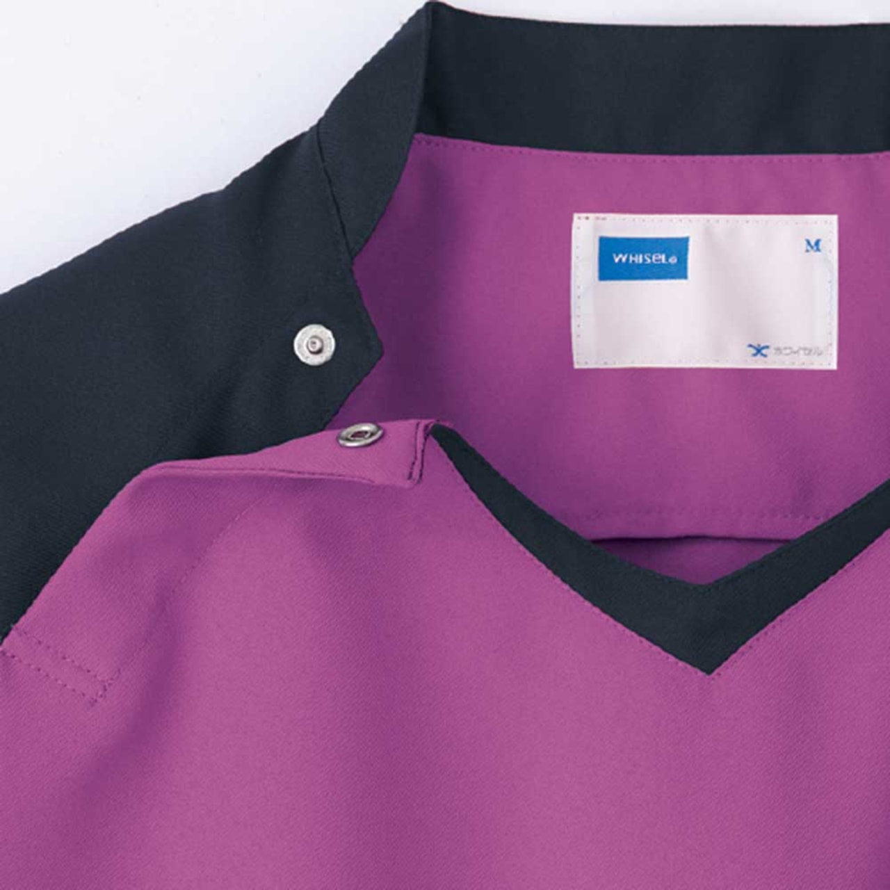 白のイメージが強い医療現場。そんなイメージをカラフルな実用ウエアが一新。いま注目を集めるカラフルなスクラブです。 ボディカラーとは異なる配色が両肩に施され、まるでラグランTシャツ風のデザインに。さらに両肩の配色と同色で襟元やポケットにも切り替えしが施され、おしゃれなデザインになっています。脇下には消臭・抗菌効果のあるテープがセットされ、汗のニオイを軽減。生地には制電糸を使用しているので、まとわりのない快適な着心地が仕事への集中力を高めてくれます。
