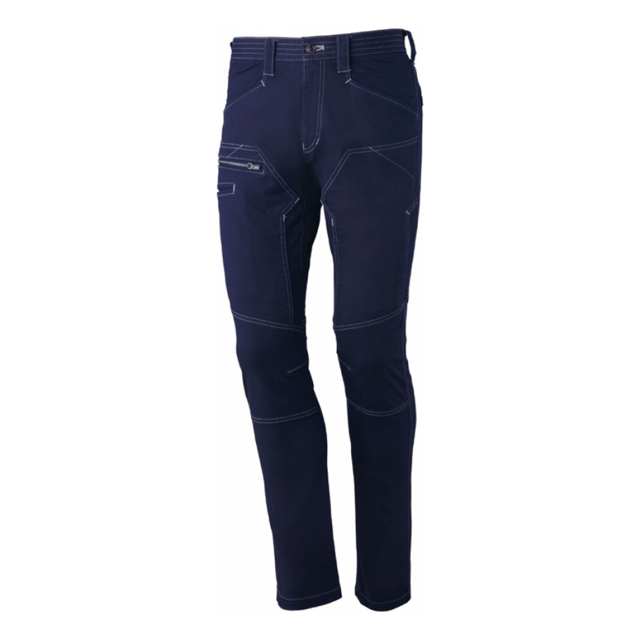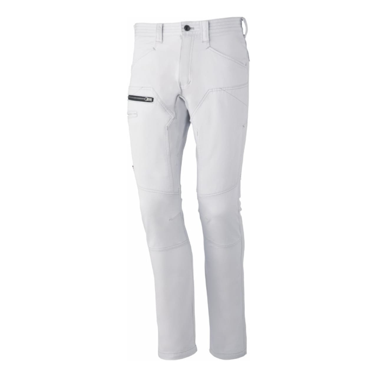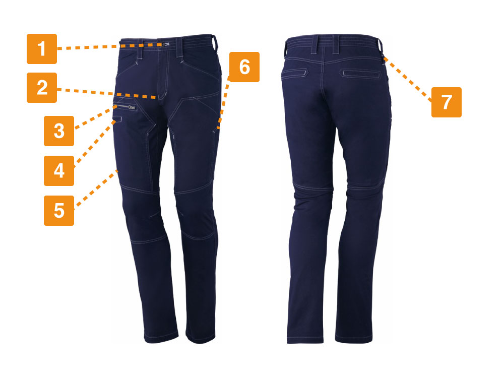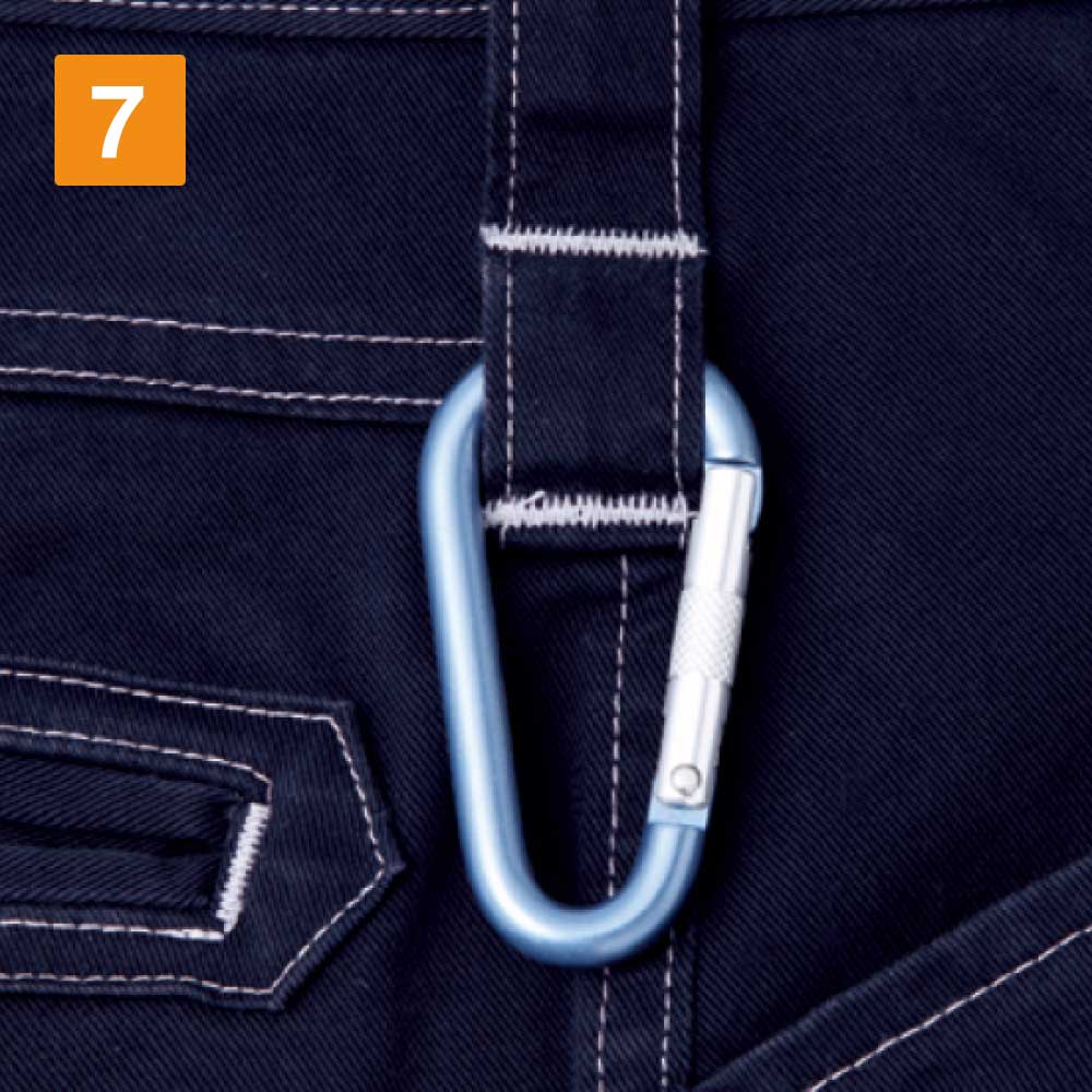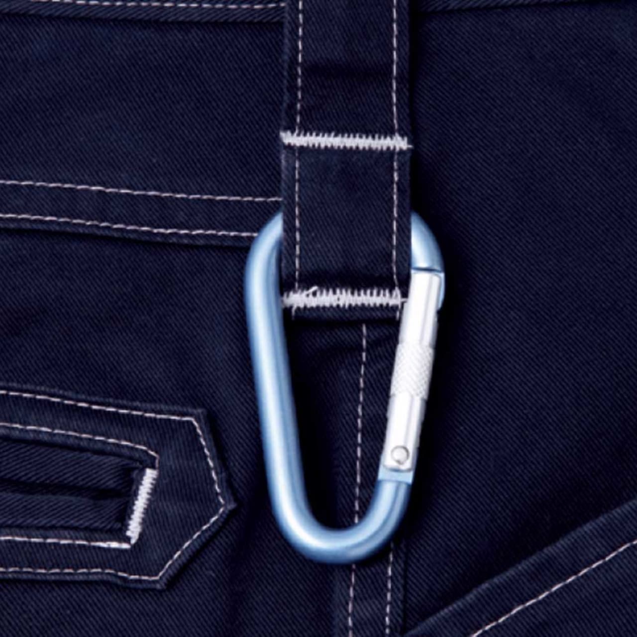 ノータックでウエストをスマートに見せる仕様でつくられていながらも、脚へはしっかりフィットし、動きやすさを実現しています。どんな動きもサポートするストレッチ素材で、ハードなワークシーンでも大活躍間違いなしのワークパンツに仕上がった一着です。ハーネス着用非対応モデルですが、手の届きやすい位置や、右脚側など各所ににポケットが配置されており、収納にもこだわってデザインされています。ウエストのカラビナループは、作業用の道具を簡単に取り付けできますので、高所などの作業での道具の落下や、紛失を防ぎます。魅力ある機能が充実している完成度の高い、自重堂のストレッチノータックカーゴパンツです。