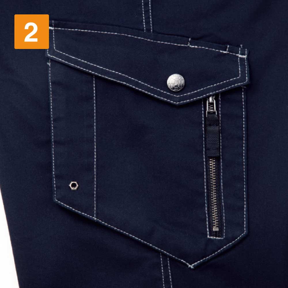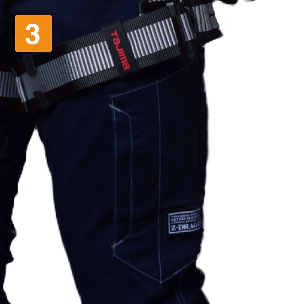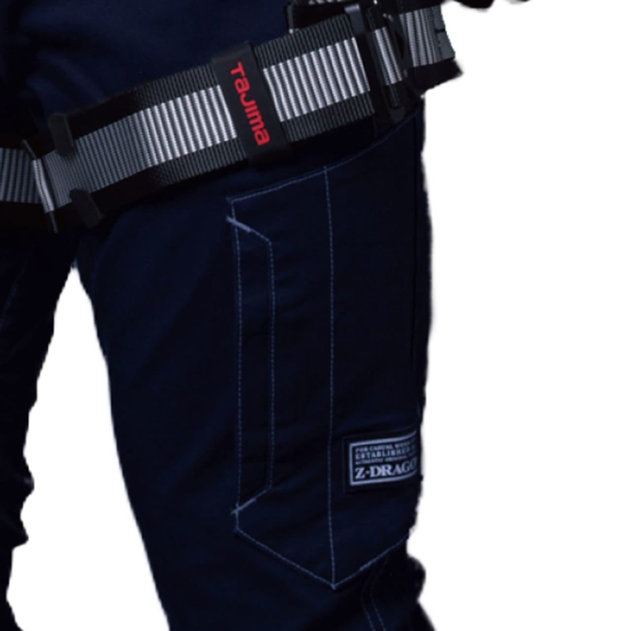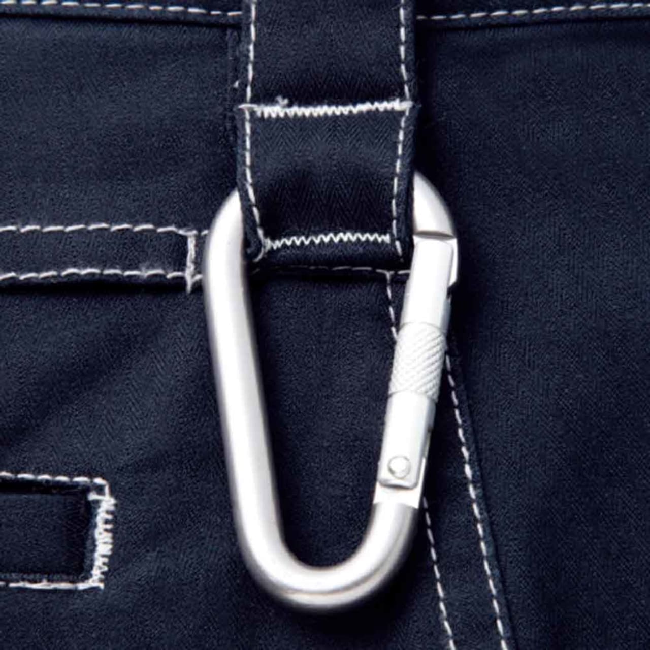 カーゴパンツといえば、両足に配置された大型ポケットが魅力の一つです。作業で使うどんなアイテムも、収納することができます。手の届く腰部分にはカラビナループもあり、アイテムの紛失なども防ぎます。驚きの収納性を重視したつくりでありながら、機動性にも注目。スリムでありながら、ソフトな履き心地で、脚にフィットするため、ハーネスを着用して作業する際など高所作業に最適なカーゴパンツです。股下には、ガゼット仕様のマチも施されているので、アクティブでどんな動きも、しっかりサポートするワーカー向けストレッチノータックカーゴパンツです。