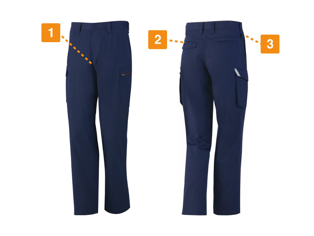 驚きの収納力が魅力の、自重堂製品制電ノータックカーゴパンツです。パンツの各所に施されたポケットなどの収納場所の多さがポイントです。作業時に、両手で荷物を運ばなくてもすむように、荷物をたくさん収納できる大型のポケットが両脚についています。日常のアイテムを収めるのに重宝する、ウエストのマルチポケットも配置されています。また、カラビナループも最大の魅力の一つで、ツールなどを簡単に着脱できます。作業着としての、充実した収納機能を完備したカーゴパンツで、飛躍的に作業の効率をあげることが可能です。
