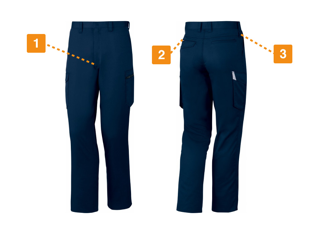 暑い日でも軽くて動きやすいと評判の自重堂のノータックカーゴパンツ。特にこのシリーズは高度な帯電防止素材でできているので、静電気を嫌う作業等、現場を選ばす着用していただけます。ポケットは左右とお尻側に2か所。そして、両太腿部分には、野帳や携帯電話がラクラク入る大きめのポケットも搭載されています。左側はファスナー仕様なので、大切な工具等も落とす心配がありません。鍵やロープなどを取り付けておきたい方には、ウエスト部分のカラビナループも便利。機能性抜群のパンツです。同シリーズで長袖やジャンパー等もあるため、セットでの着用もおすすめです。