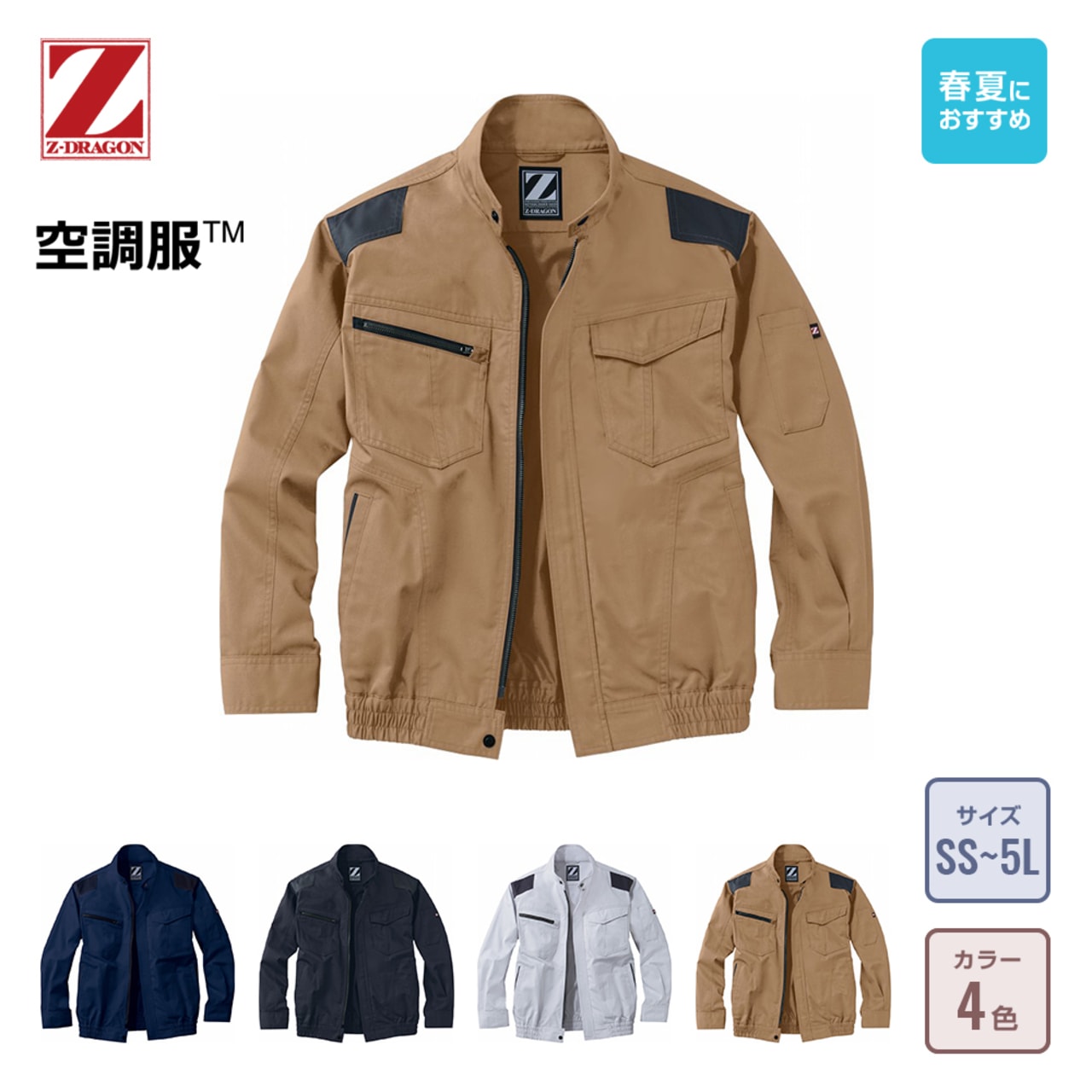ポリエステル65%、綿35%から成るサマーツイル生地は、春夏のワークウェアによく用いられる素材。薄手で軽さがあり、長時間着ていても負担を感じません。別売の着脱式のファンを装着することで、服内をすがすがしいほどに風が通り抜け、これまでに感じることができなかったさらなる快適さを感じることが可能です。レディース対応シルエットのSS、Sサイズ~5Lサイズまで広範囲で用意されおり、企業用ユニフォームとしても着用できます。4色の使い勝手の良いカラー&すっきりとしたシンプルなデザインで、同シリーズのパンツや手持ちのパンツとも気軽に組み合わせを楽しむことができます。