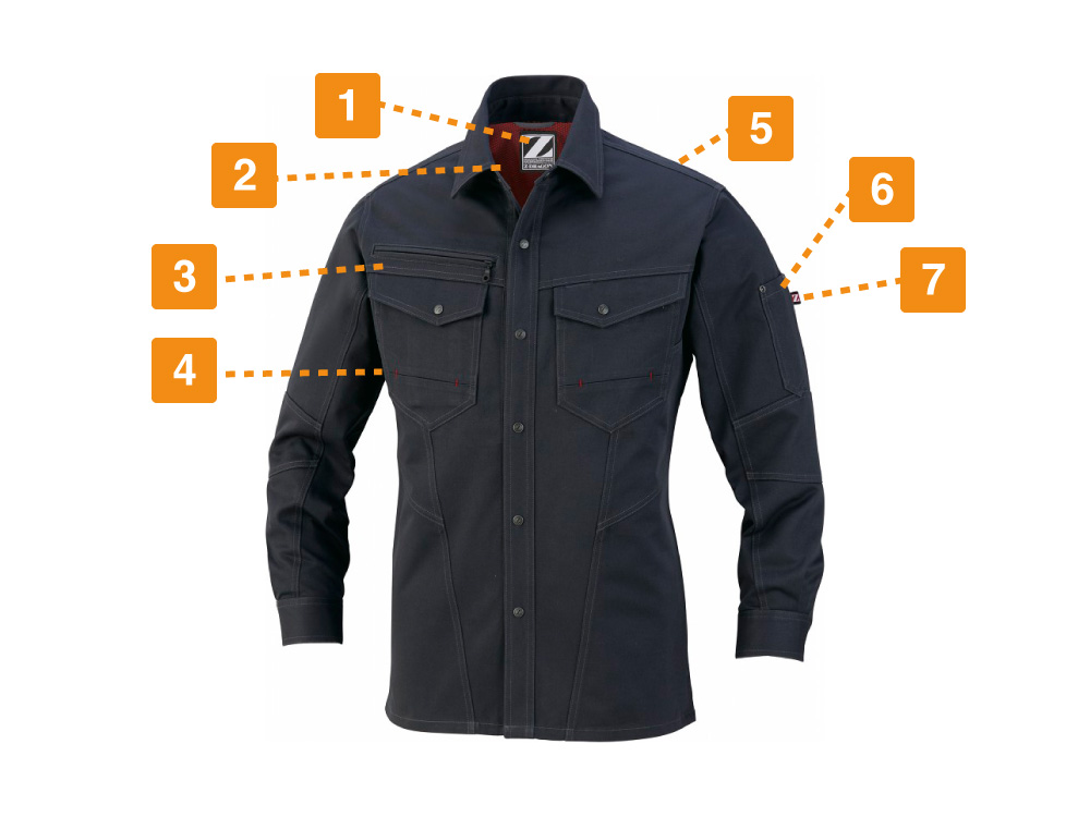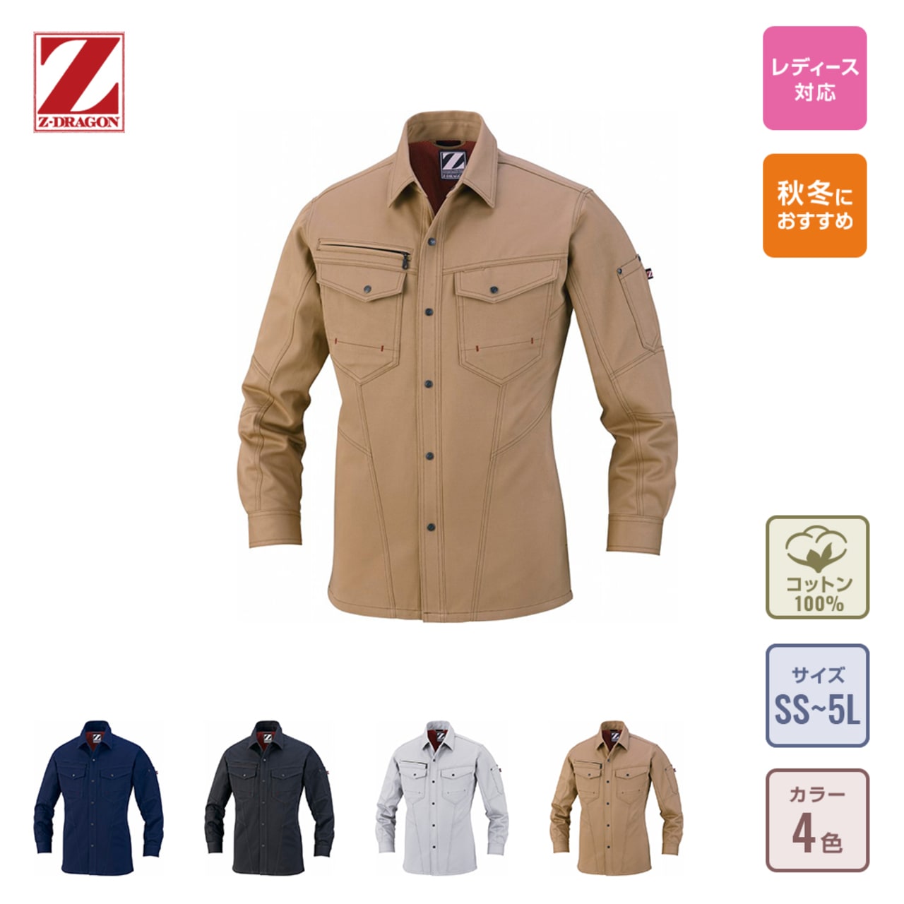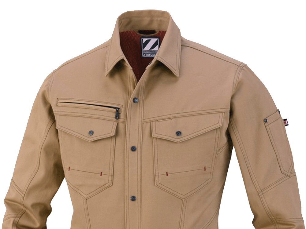 綿100%で仕立てられた自重堂Z-DRAGONの長袖シャツは、通気性が良く熱伝導率が低い綿の特性により、ほどよく体温をキープすることができ年間を通して着用することができます。チノクロス生地は、チノパンなどに用いられるポピュラーな生地で、昔から軍服にも使用されていたほど丈夫さには定評があります。ワークウェアに欠かせない耐久性と肌ざわりの良さを両立する長袖シャツです。カラーはネービー、シルバー、シックブラック、キャメルの定番色を採用し、レディース対応シルエットも取り入れた豊富なサイズ展開で、さまざまなワーカーを想定したラインナップとなっています。