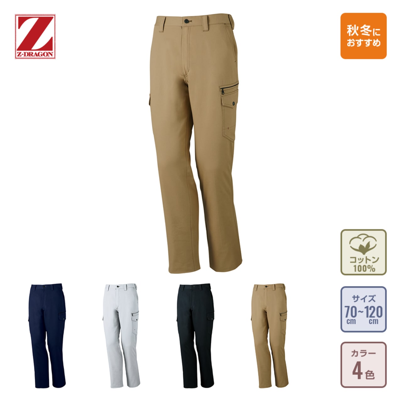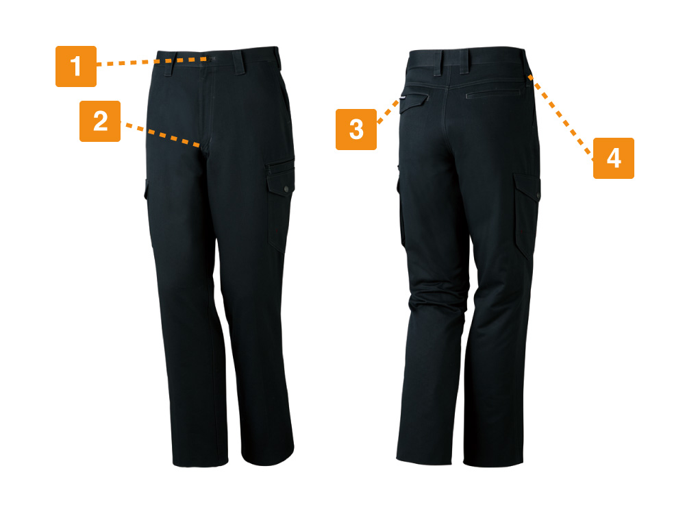 ワークウェアに必要な要素が多い人気の素材の綿を100%使用したノータックカーゴパンツ。天然素材特有のしなやかな穿きごこちと、チノパンとしてなじみのあるチノクロス生地の耐久性をあわせ持ったボトムスです。汗もしっかりと吸水してくれ、抗菌消臭効果でハードな作業現場でも、存分に働くことができます。定番デザインとスマートなシルエットは、同シリーズのシャツ、アウターはもちろんどんなトップスとの相性も良く、長く使うことができます。幅広いサイズ展開と年代を選ばない定番色も自重堂ならではの愛されポイント。万人受けするワークウェアです。