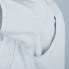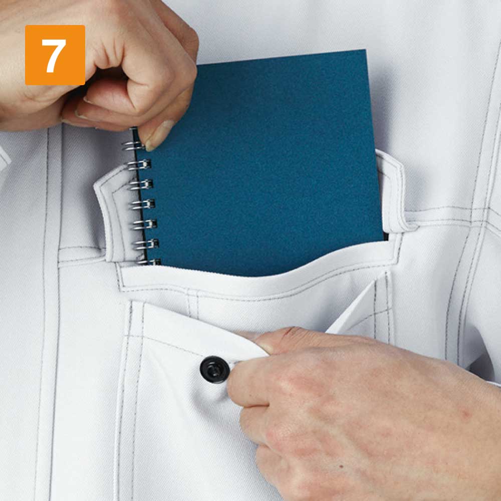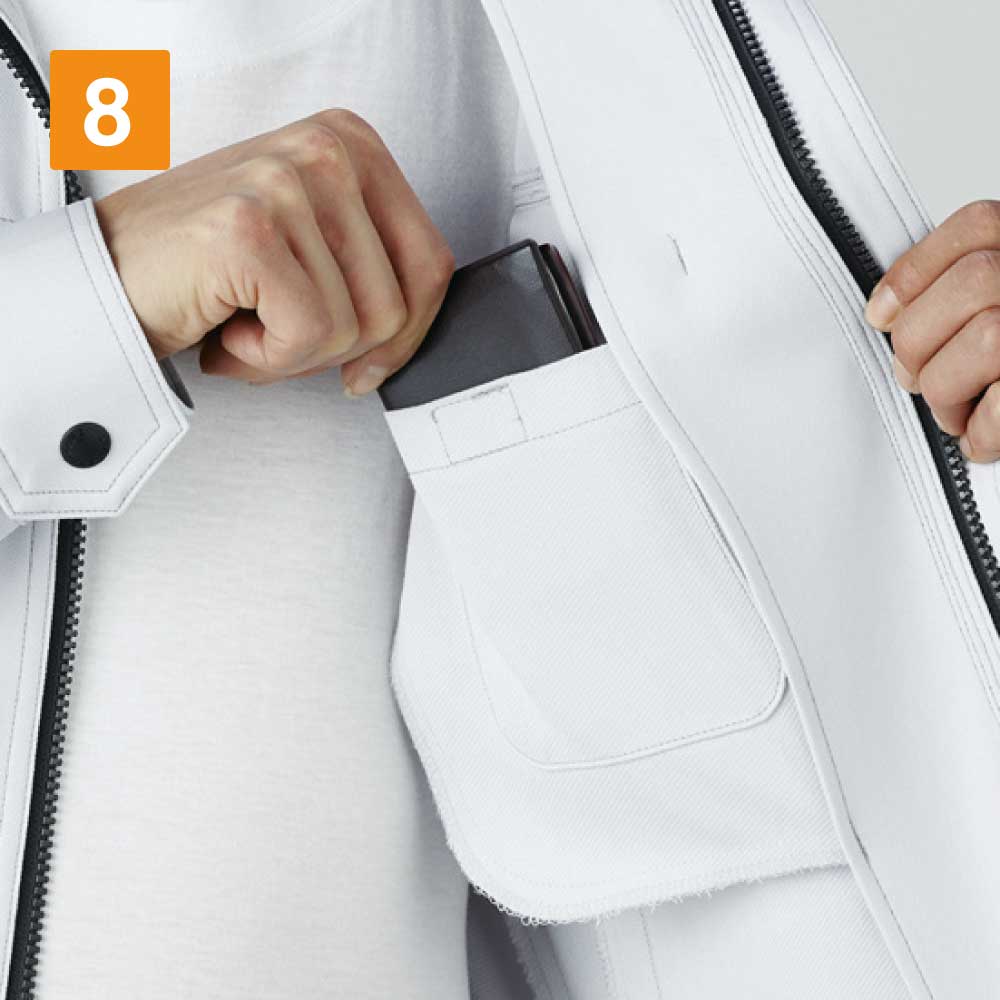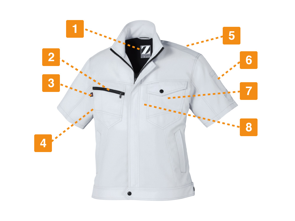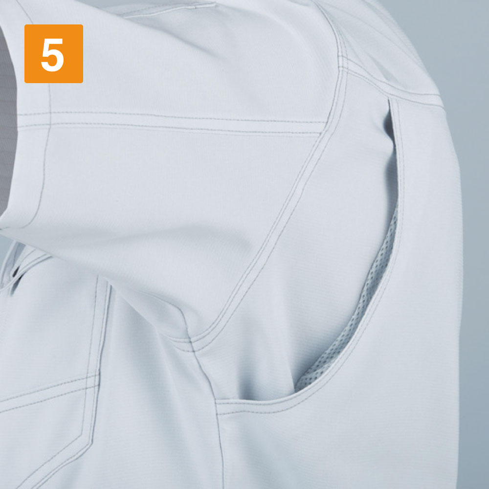 春夏モデルの製品制電半袖ジャンパーは、夏場でも気持ちよく着用できるような工夫が施されています。中でも特徴的なのが、裏綿素材が使われている点です。肌離れ性に優れているので、汗をかいても服がべたつくような心配もなく、いつまでもサラサラと気持ちのいい着心地をキープすることができます。また、汗をかくとどうしても気になるのが体臭です。こちらの製品制電半袖ジャンパーには、消臭&抗菌テープがあしらわれています。汗臭さをしっかり制御してくれるので、体臭を気にせずに作業に集中できることでしょう。