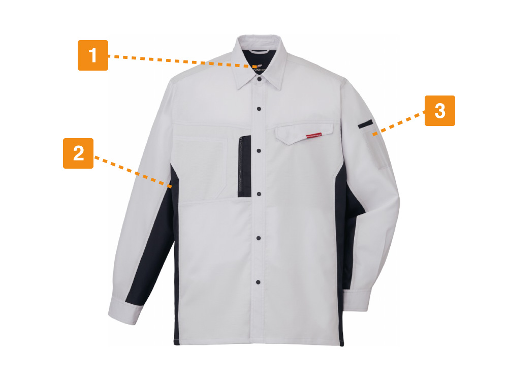 こちらの製品制電ストレッチ長袖シャツの特徴として、汚れに強い、ストレッチ性が高い、JIS規格に適合した帯電防止性能があるという点が挙げられます。特に防汚性に関しては東レの新技術であるテクノクリーンを採用することにより、通常のクリーニングで落ちるレベルの汚れなら簡単に落とすことができます。業務上どうしても作業着が汚れやすいのであれば、防汚性は重視するべきポイント。作業着の油汚れや泥汚れが懸念されるならぜひ導入の検討をおすすめします。