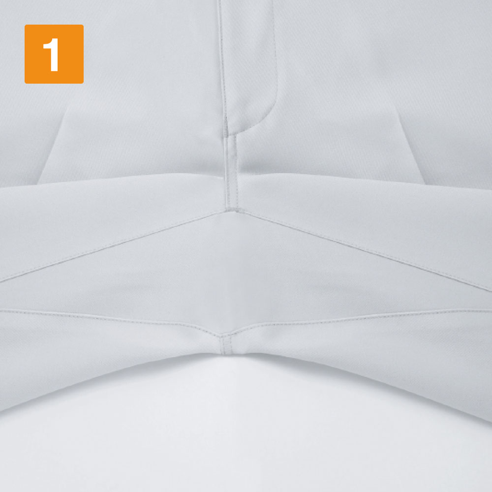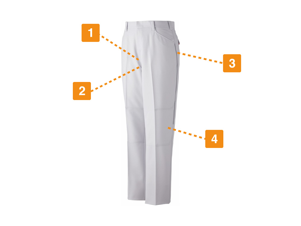 製品制電ストレッチノータックパンツ最大の特徴は、東レの新技術を搭載したことによる防汚性の高さです。ナノスケール加工技術を応用し、通常のクリーニングで落ちる種類の汚れであれば、容易に落とすことが可能です。また、伸縮性の高い素材を採用したことに加え、股ガゼットなどの機能面によりワーカーの動きをしっかりと支えます。JIS規格に適合した帯電防止性能も備えているため、静電気に対してシビアな環境でもご利用いただけます。