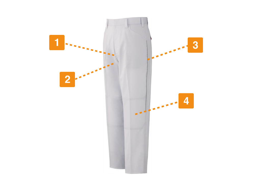 製品制電ストレッチノータックパンツの特徴はなんと言っても高い防汚性にあります。このパンツの生地は東レのテクノクリーンを使用。ナノレベルで性能をコントロールすることにより、汚れを落としやすく、かつ付着しにくくすることに成功しました。このような防汚加工施されたパンツは大変貴重です。また、随所にワーカーが快適に作業できるような設計が施されていることも特長です。汗ムレによる悪臭を防止する消臭&抗菌テープ、ワーカーの動きをサポートする股ガゼット・ひざ切替などの魅力的な機能を搭載し、ワーカーの作業効率向上に貢献します。