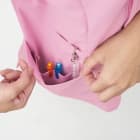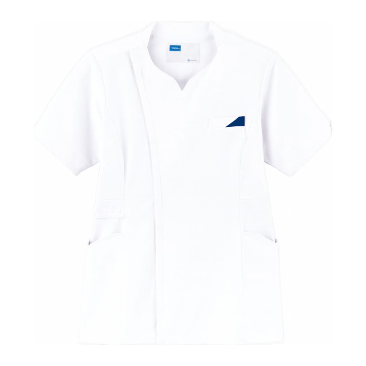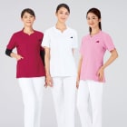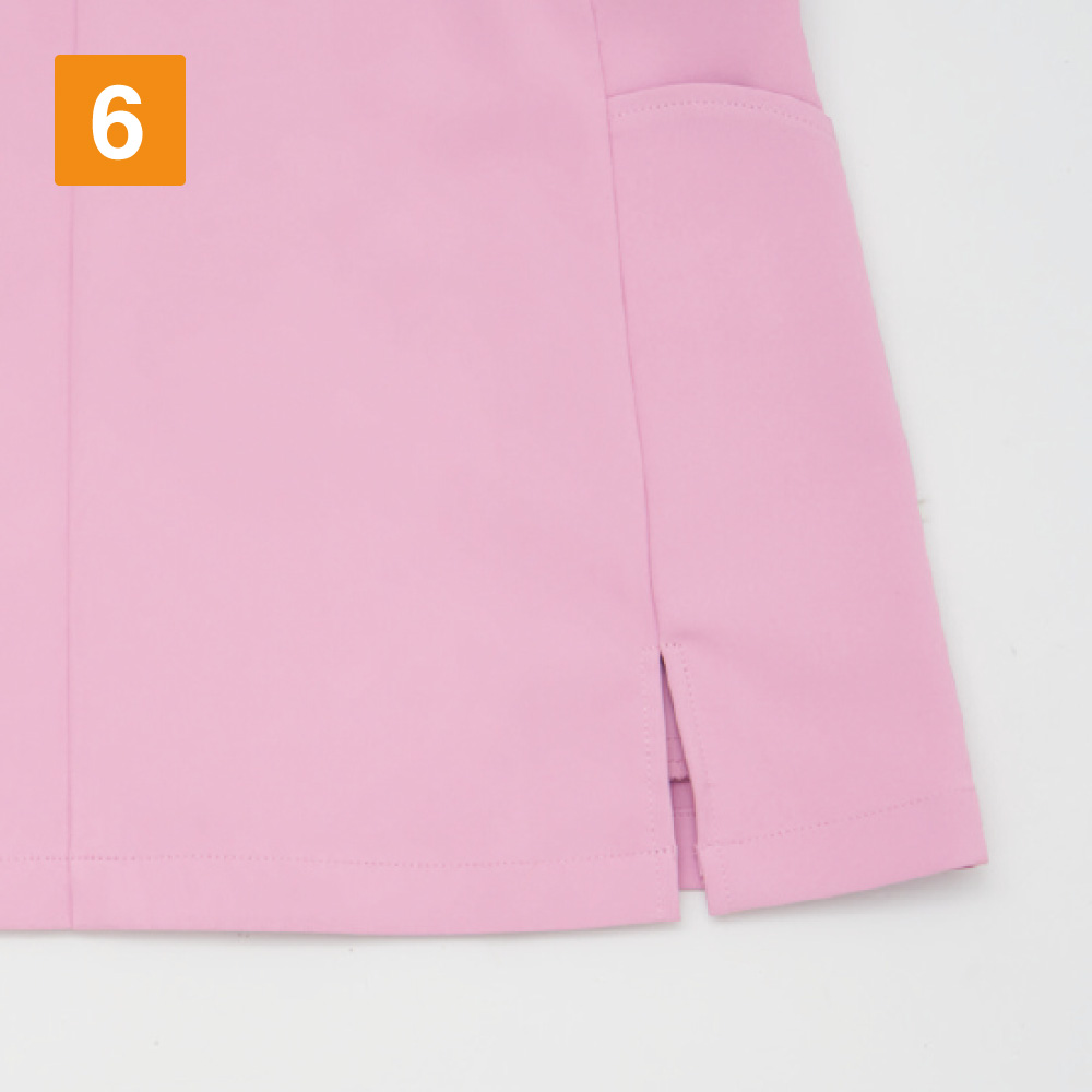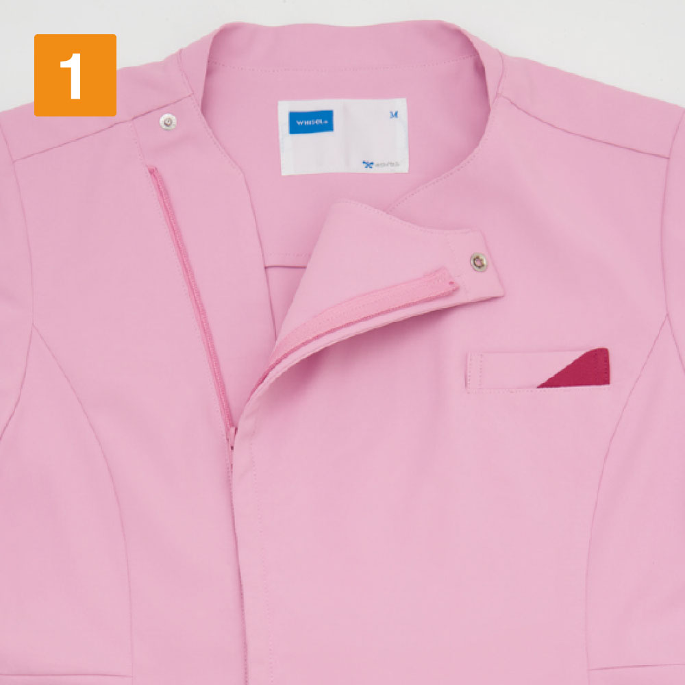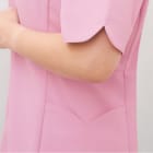 襟元のハートシェイプド・ネックがおしゃれなレディーススクラブです。袖口と脇ポケット口も花びらをモチーフにしたカッティングとなっており、上品な印象をあたえます。こちらの商品はサイドファスナー開きで着脱時の髪型や化粧の崩れを防ぐ、女性に優しい仕様になっています。機能としては、SEK(赤)認証の制菌加工が施されているので、繊維上の細菌の増殖を抑制、清潔感をキープ。生地には透け防止効果があるので、女性にはうれしいポイント。おしゃれなデザインだけではなく、多機能なスクラブです。