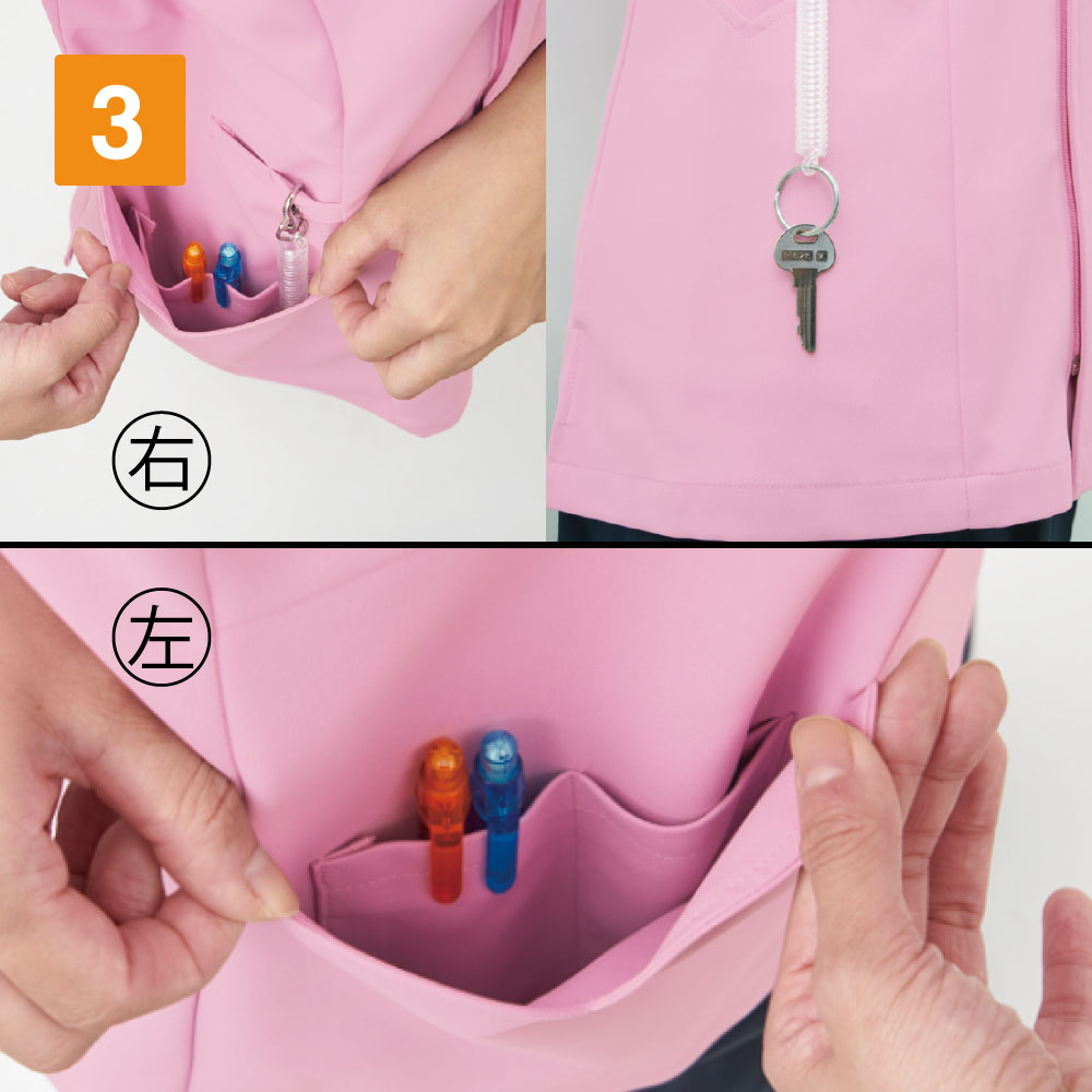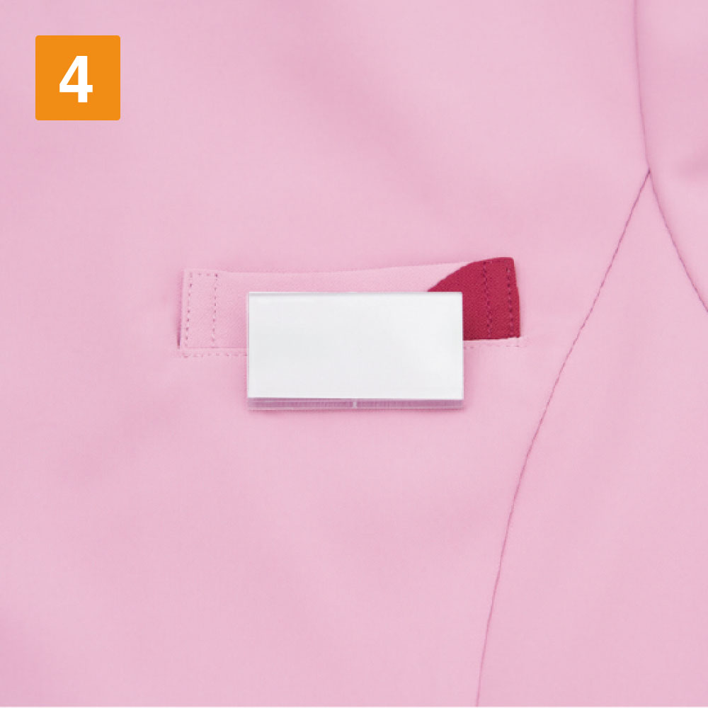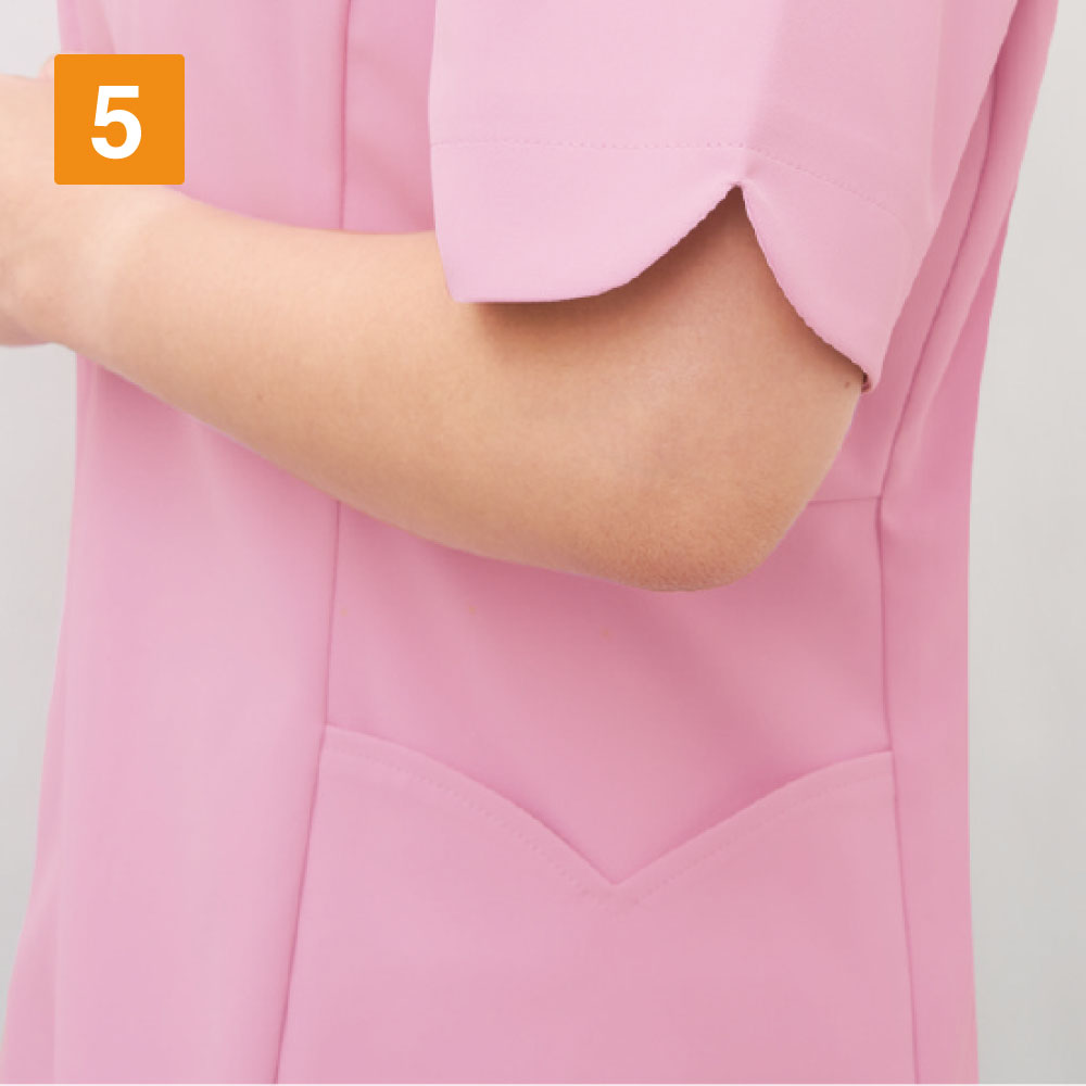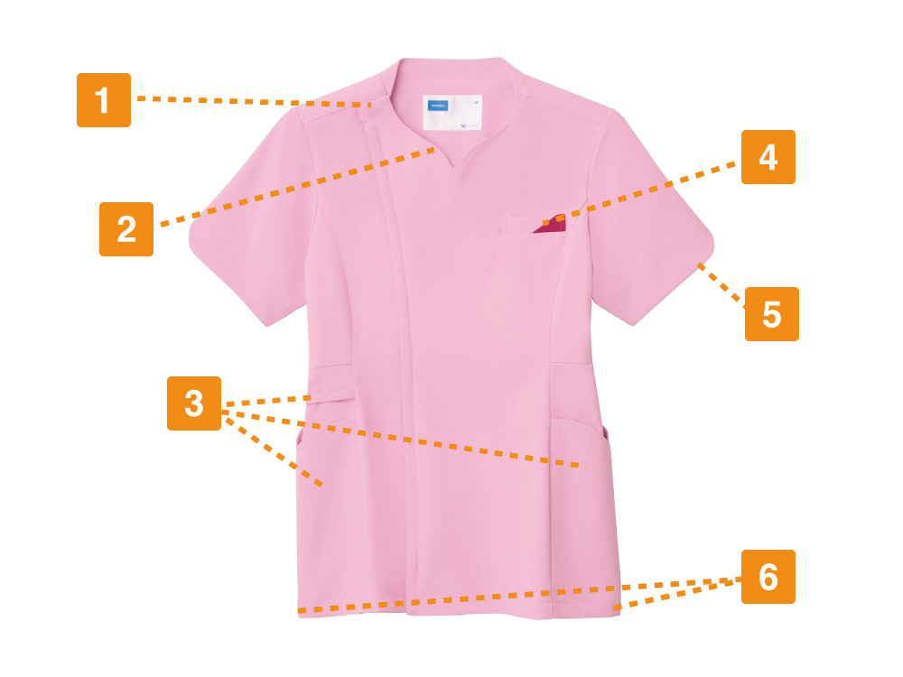 レディース専用のスクラブです。このスクラブの特徴は衿元がハート型になっているのとソデ口の女性らしい形状にあります。さりげない部分ですが可愛らしい女性を演出してくれます。機能がしっかりついているのもGOODポイント!
