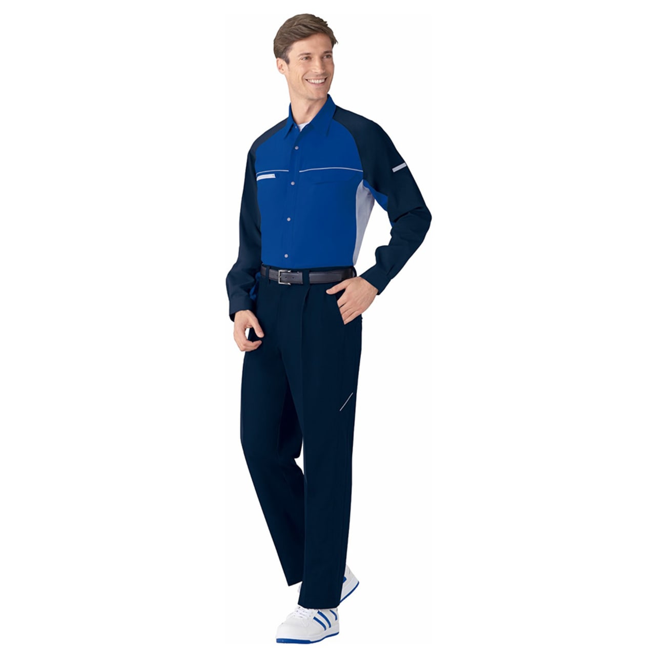 生地のストレッチ性と適度なゆとりがあり、ソフトワークに向いている製品制電ストレッチワンタックパンツ。ストレッチ性により、立つしゃがむ等の動きに対応できます。ゆとりのあるストレートパンツのため、足回りに生地が張り付かず、風が通りが良く快適に作業がしやすいでしょう。着用想定は春夏で、作業で動き回り汗をかくシーンでも、快適に着られるデザインを採用しています。パンツには裏地がなく、1枚で快適に着られるタイプです。パンツのフロントはワンタックのみで、シャツをパンツの中に入れてもスッキリ着られます。ベルトループありで、パンツのウエスト調節が可能です。生地は防汚加工が施されており、シルバーのように明るい色でも、汚れを気にせず着られます。