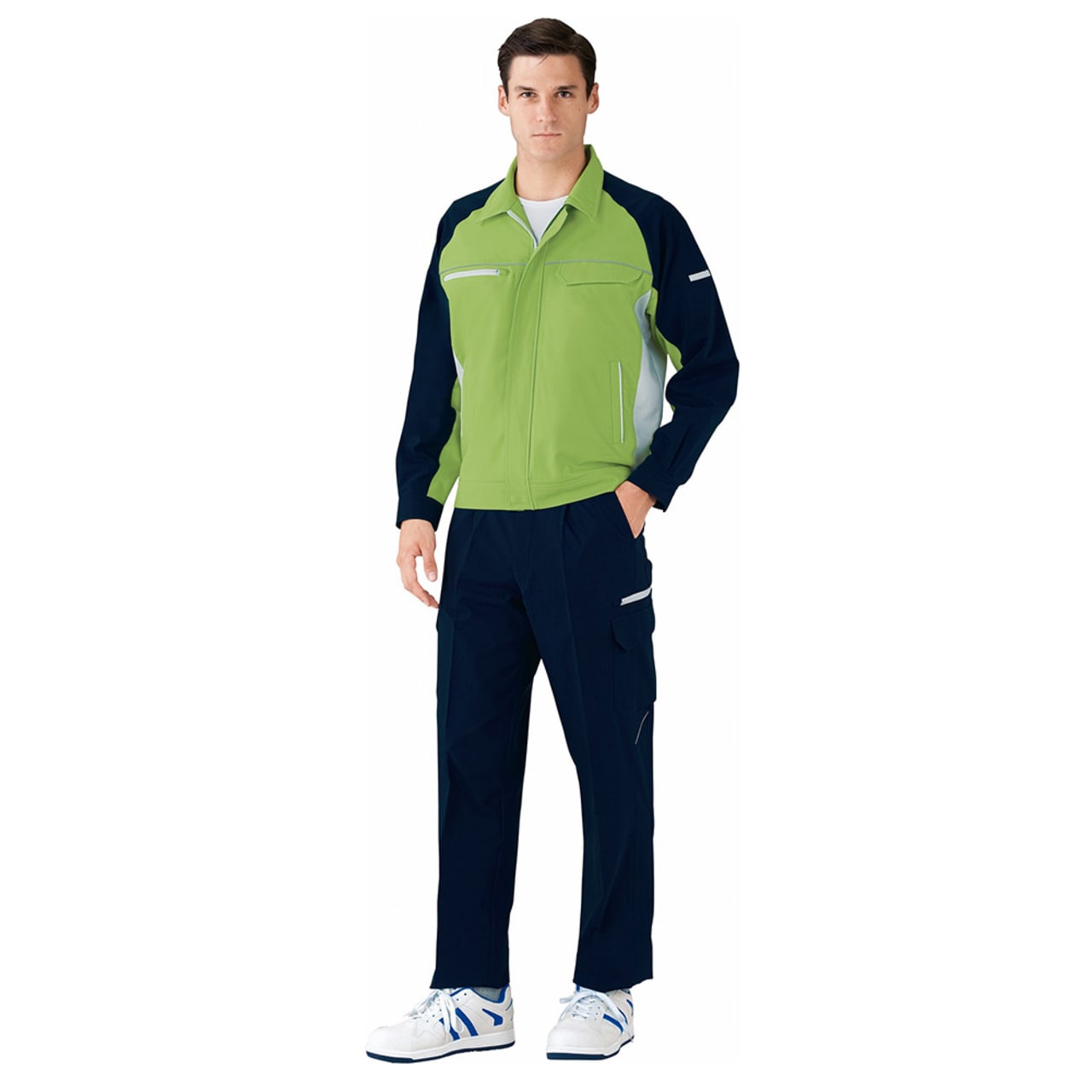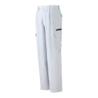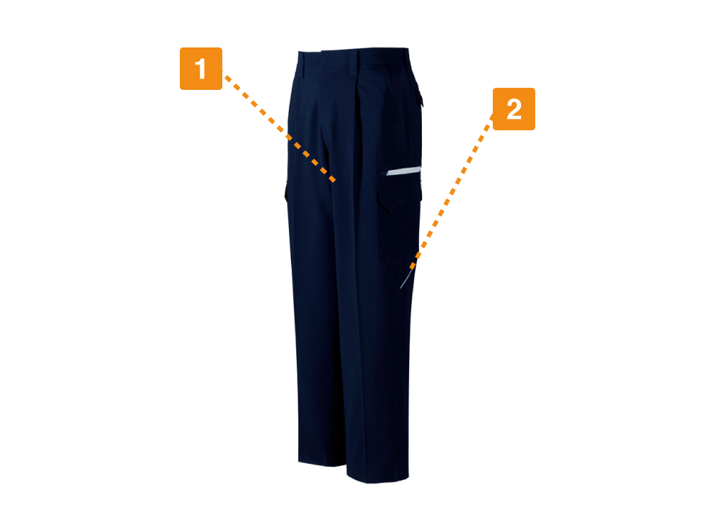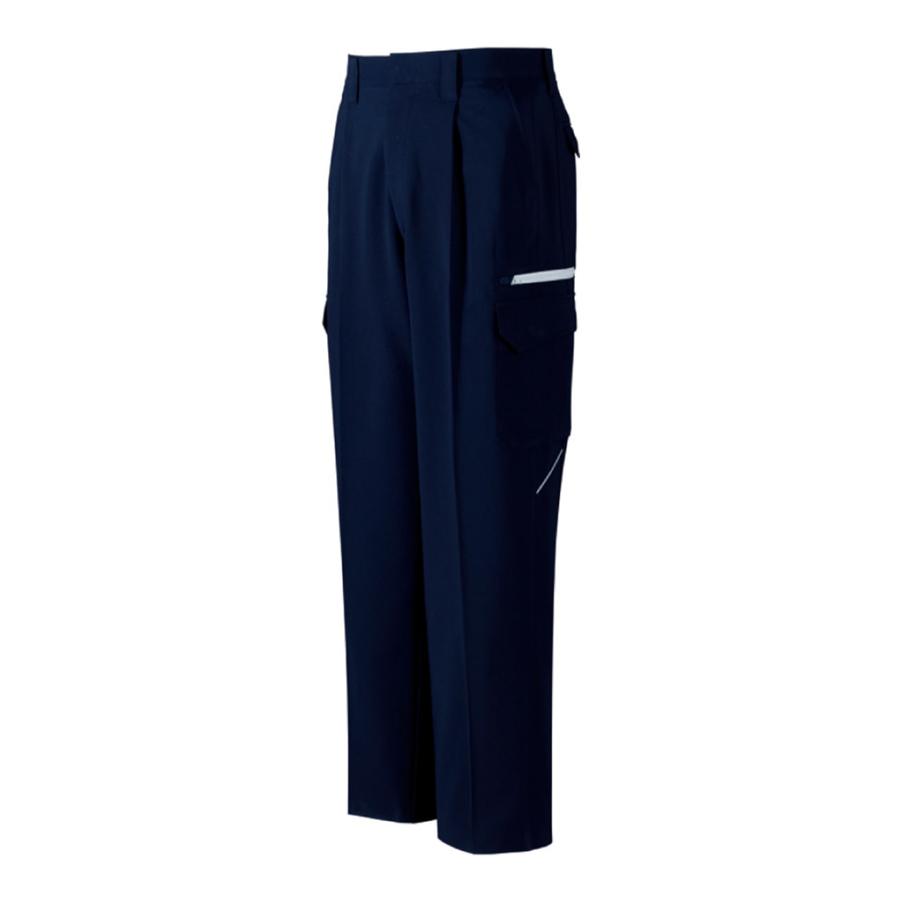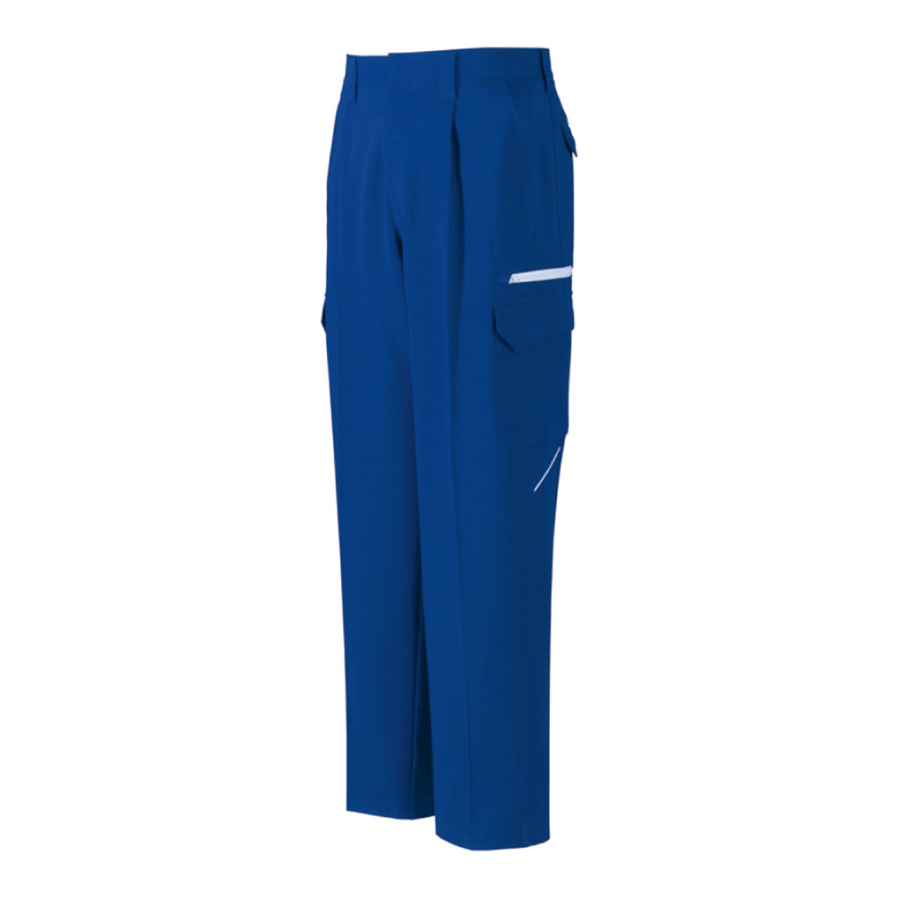 多数の機能が施された、機能充実のカーゴパンツです。生地は伸縮性に優れたストレッチ素材を使用し、立つ・しゃがむなどの動作に対応できます。パンツは適度なゆとりで足回りに余裕があり、足の曲げ伸ばしを妨ぎにくいデザインです。パンツの生地に防汚加工を施し、汚れが付着しにくく、付いた汚れが落ちやすくなっています。汚れが目立ちにくいネービーやロイヤルブルーが選択可能で、またはシルバーのように淡い色でも防汚加工により清潔を保ちやすいでしょう。生地はさらに、製品制電機能もあります。空気が乾燥しやすい季節やシーンでも、嫌な静電気が起こりにくくなっています。カーゴパンツは、両サイドのポケットと、太もも横のポケットがあり、小物収納に便利です。
