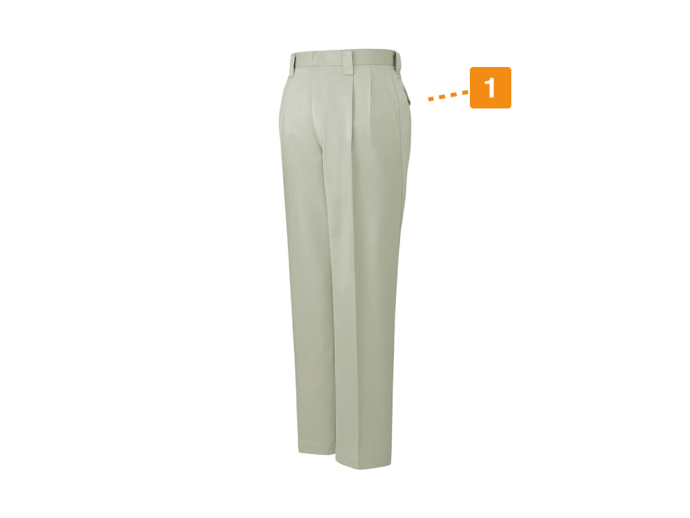 適度に厚みのある生地を採用した、ハードワーカー向けパンツです。パンツの全体にゆとりがあり、足の動きをスムーズにします。立つ・しゃがむなどの動きでも、足回りの動きを妨げません。パンツのデザインは、シンプルなスラックスタイプです。腰回りのフロントに2本のタック入りで、同タイプのブルゾンと合わせると、タックの膨らみをカバーできます。飾りがないデザインで、幅広いウェアと組み合わせが楽しめます。パンツは、センタープレス入りです。幅広デザインのパンツでも、センタープレスによりスッキリとした印象があります。パンツの生地は、シワになりにくいポリエステル65%です。綿35%を加えることで、肌触りの良さにも対応しています。
