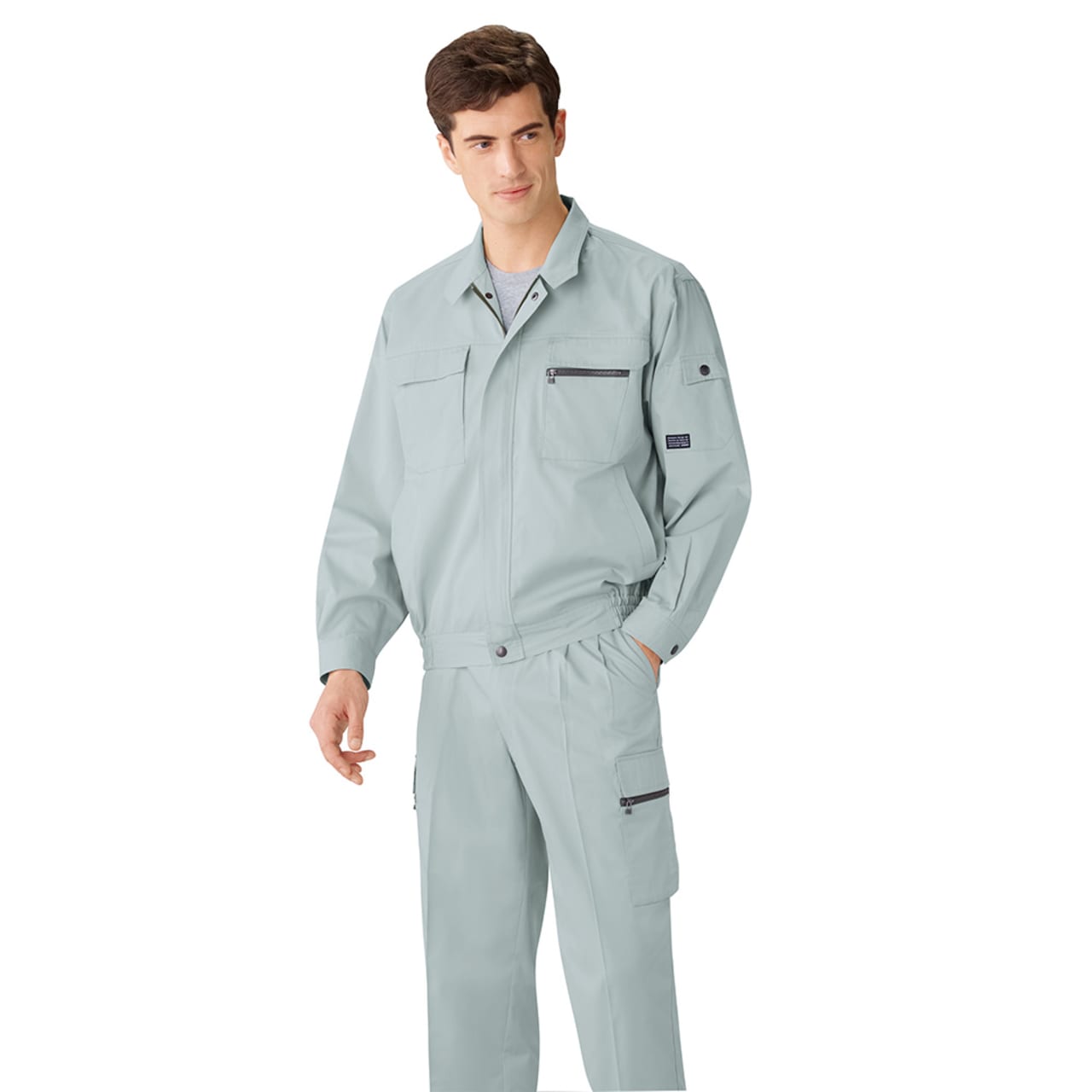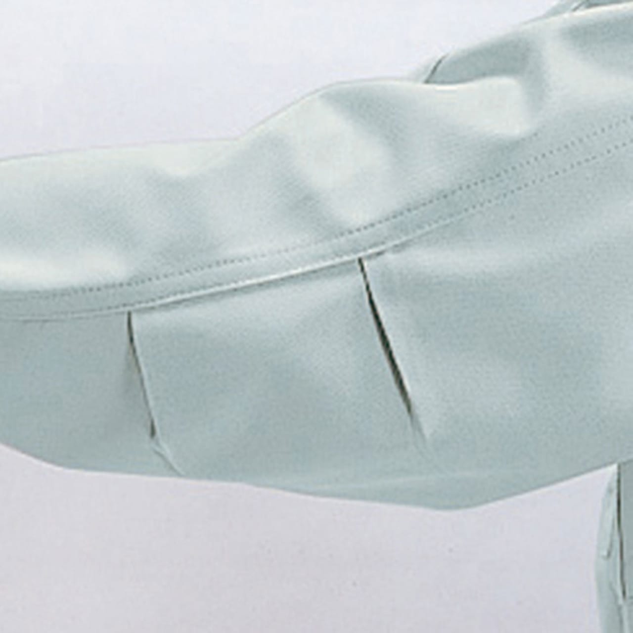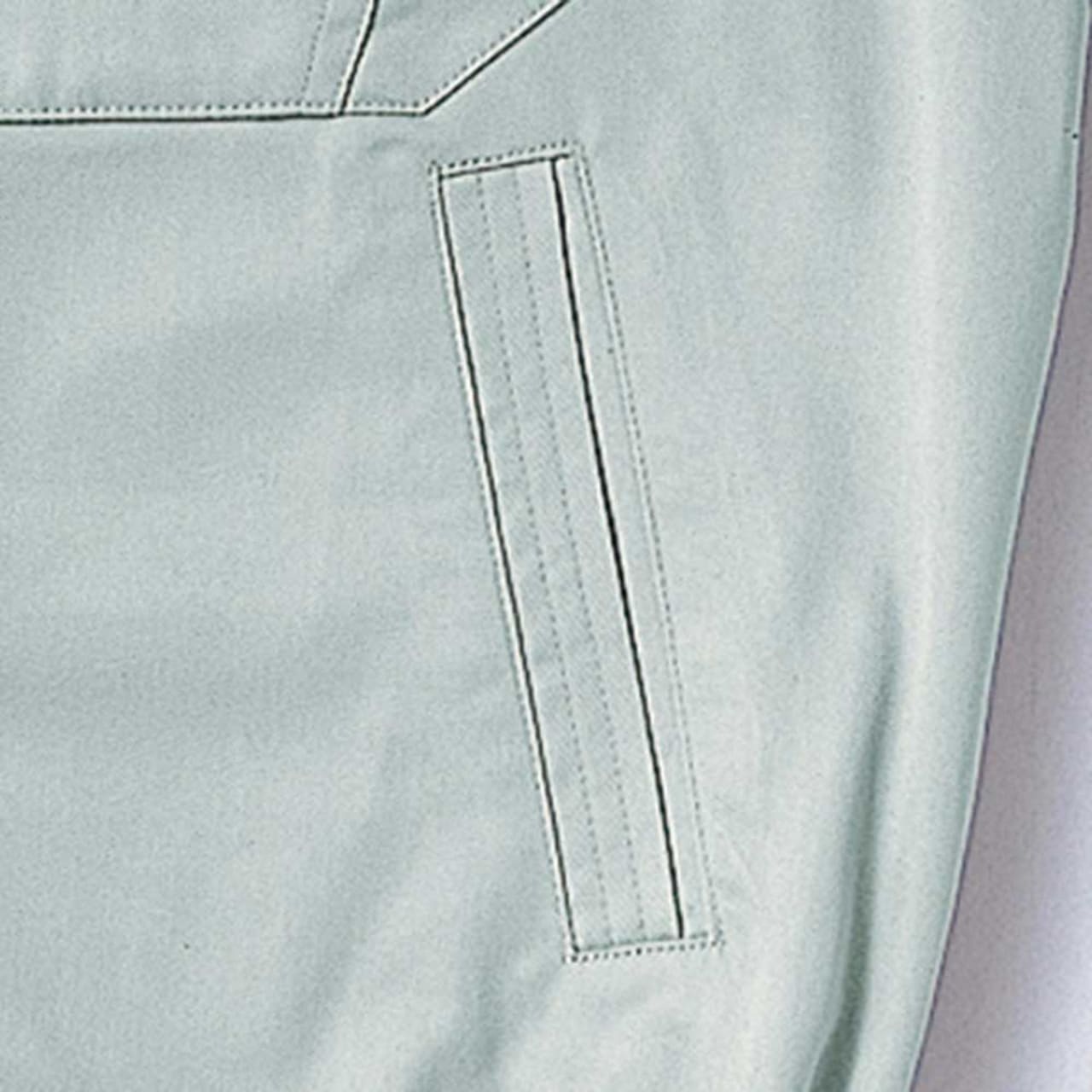 胴回りや腕などにゆとりを持たせているため、激しい動きでも快適に作業ができます。背中の脇の部分はプリーツ入りで、腕を前や上に動かしてもつっぱりません。肘タックにより、肘の曲げ伸ばしを楽にできます。全体的にゆったりとしたサイズ感ですが、腰後ろにギャザー入りで、ブルゾンを体にフィットさせることができます。腰回りのフロントはギャザーなしで、スッキリとした着こなしが可能です。ブルゾンの丈はウエストよりやや低い位置で、長すぎず腰の動きを妨げません。ブルゾンの生地は、耐久性のあるツイルを使用しています。ソフトサマーツイルで減量加工生地のため、耐久性と軽さを兼ね備えています。汗をかく春夏に着られるブルゾンです。
