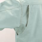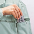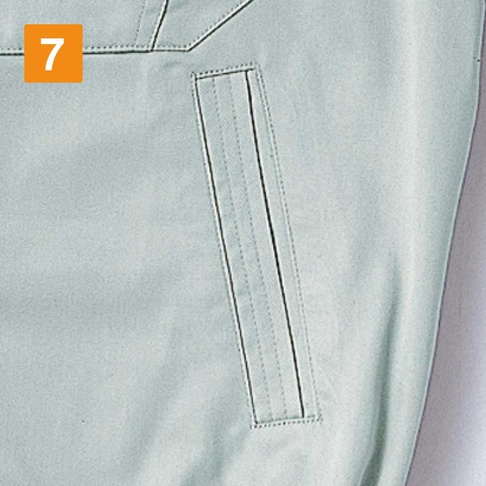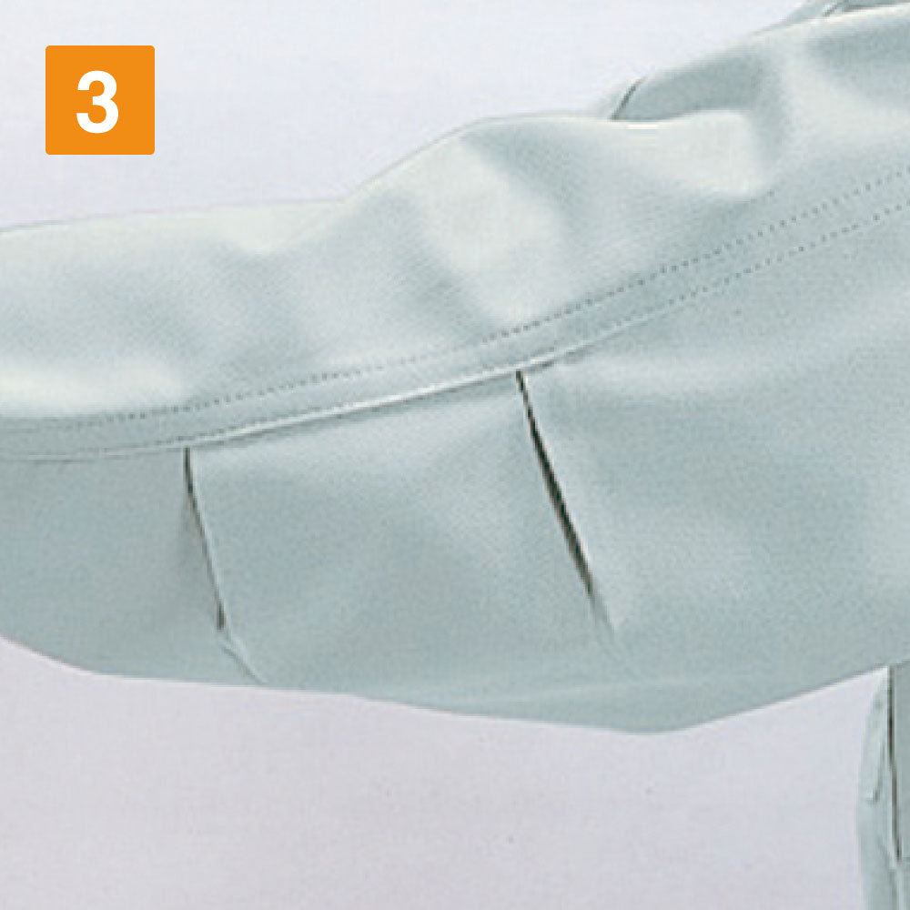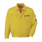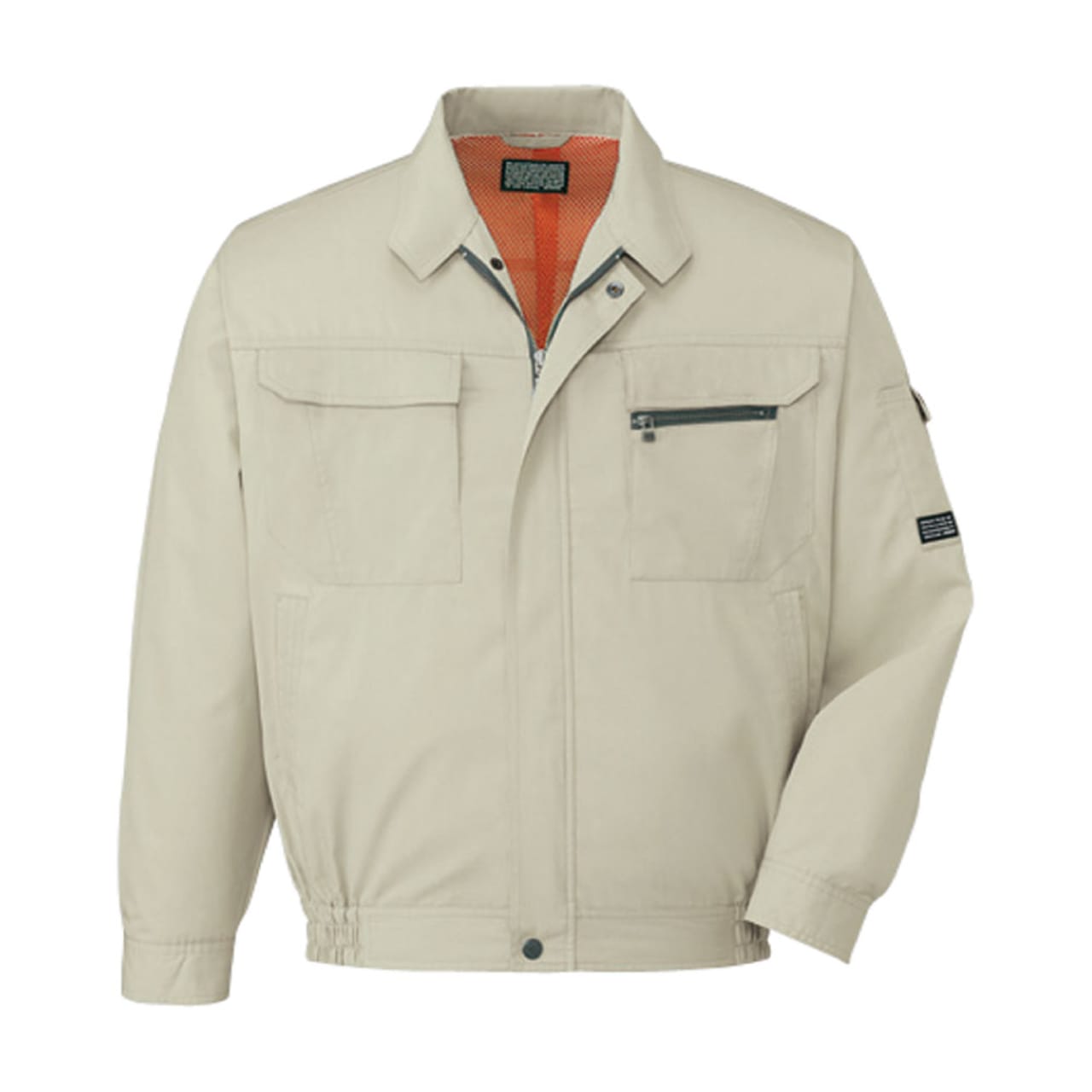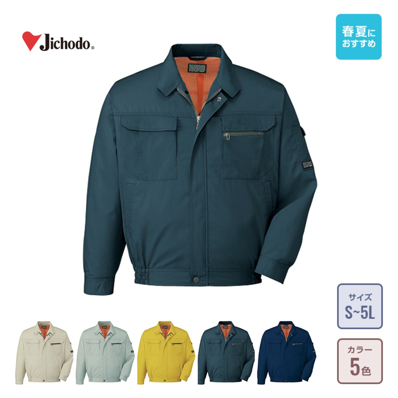 胴回りや腕などにゆとりを持たせているため、激しい動きでも快適に作業ができます。背中の脇の部分はプリーツ入りで、腕を前や上に動かしてもつっぱりません。肘タックにより、肘の曲げ伸ばしを楽にできます。全体的にゆったりとしたサイズ感ですが、腰後ろにギャザー入りで、ブルゾンを体にフィットさせることができます。腰回りのフロントはギャザーなしで、スッキリとした着こなしが可能です。ブルゾンの丈はウエストよりやや低い位置で、長すぎず腰の動きを妨げません。ブルゾンの生地は、耐久性のあるツイルを使用しています。ソフトサマーツイルで減量加工生地のため、耐久性と軽さを兼ね備えています。汗をかく春夏に着られるブルゾンです。