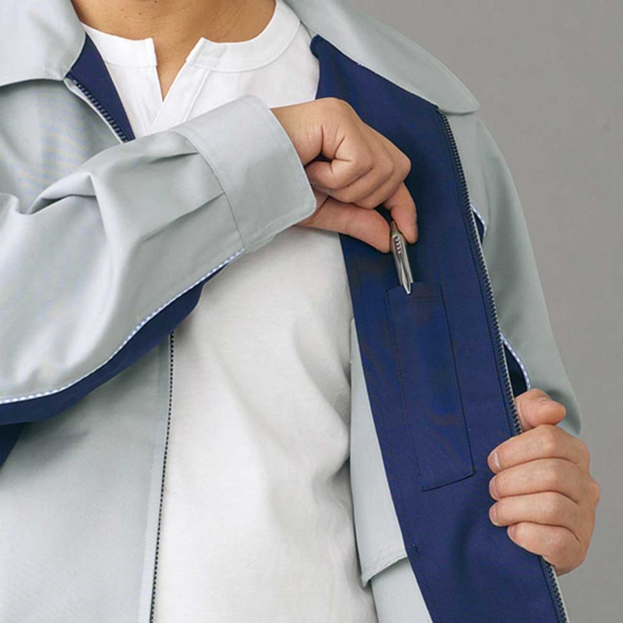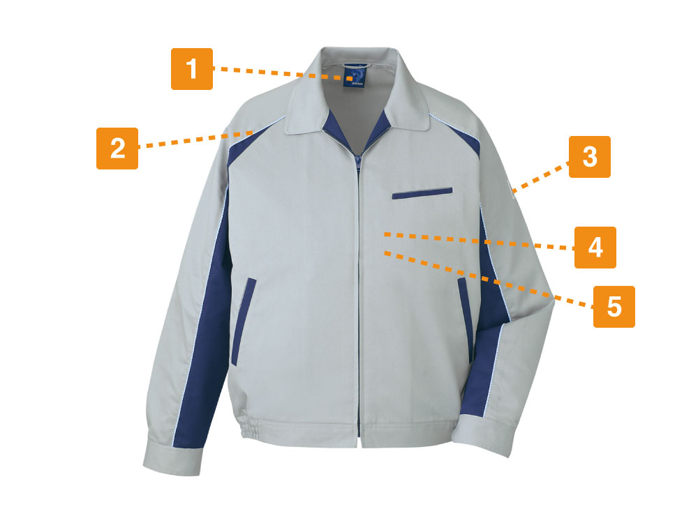 物流や工場のライン作業などでは、体の前面部での作業が増えます。荷物を持つ際に作業着に引っかかりがあると、作業しにくくなります。体の前面部での作業が多い場合は、極力シンプルなブルゾンがおすすめです。エコ5バリューブルゾンなら、体の前面部のデザインを極力シンプルにしてあるため、引っ掛かり予防が必要なシーンにおすすめです。前開きはファスナー式で、生地が重なり合わずスッキリしています。ポケットの数も最小限で、凹凸の少ないデザインを採用しています。ブルゾンは胴回りや肩や腕に多少のゆとりがあります。ストレッチ生地採用により、作業中の動きを妨げない作りのため、上半身の動きが多いシーンに向いています。