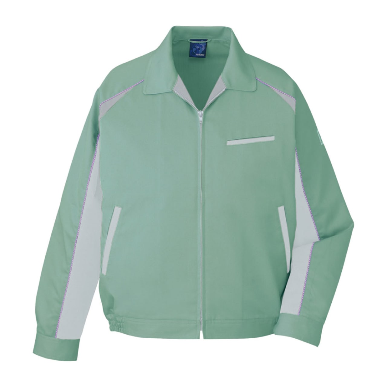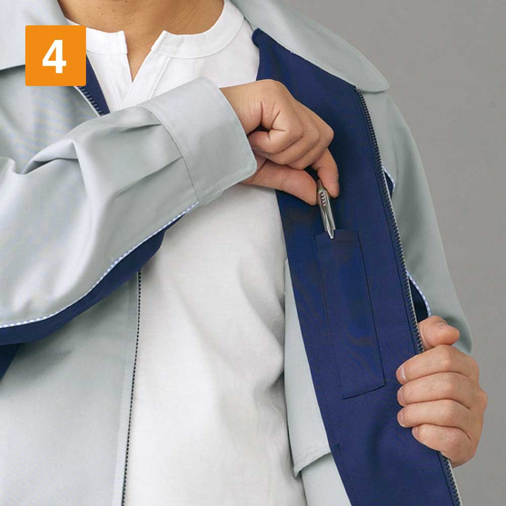 ブルゾンは、ワーカーに求められる複数の機能が付いています。大きな動きもサポートするストレッチ生地、清潔に保ちやすい防汚加工などです。製品制電により、安全で快適に作業できる加工もあります。生地にリサイクル原料を使用したエコマーク認定商品です。袖にはさりげないエコマークが入っています。ファスナーは樹脂製で、金属を使っておらず、処分する際もエコです。ブルゾンのデザインは、シンプルなファスナータイプです。脇から袖下にある色の切り替えにより、スッキリとした印象があります。ポケットは、両サイドと胸ポケット1つ、内ポケット付きです。ポケットは必要最低限の量でありながら、作業中に必要な小物を持ち歩けます。