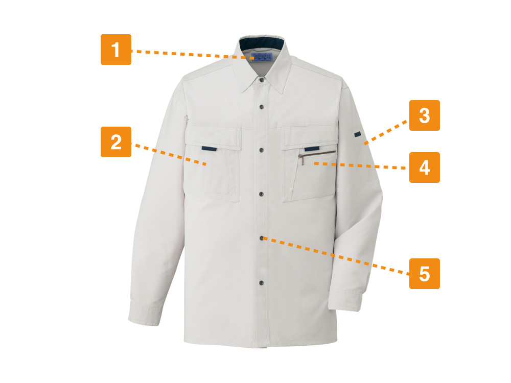 まるごとストレッチ長袖シャツの最大の特徴は、抜群のストレッチによる動きやすさです。作業中のハードな動きや、長時間に及ぶ作業にも着用者に不快感を与えずに対応することができます。それを叶えるのは、ポリエステル複合繊維であるライクラT400ファイバーを使用し、ストレッチ織物加工技術で作り上げたフリーアクションという素材で、従来の素材に比べ約6%伸び率をアップさせました。まるごとストレッチという名前の通り、生地全体が伸縮性に富んでおり、腕や肩回りだけでなく、腹部や背中部分もしっかりと伸縮し、ワーカーの動きをサポートします。