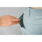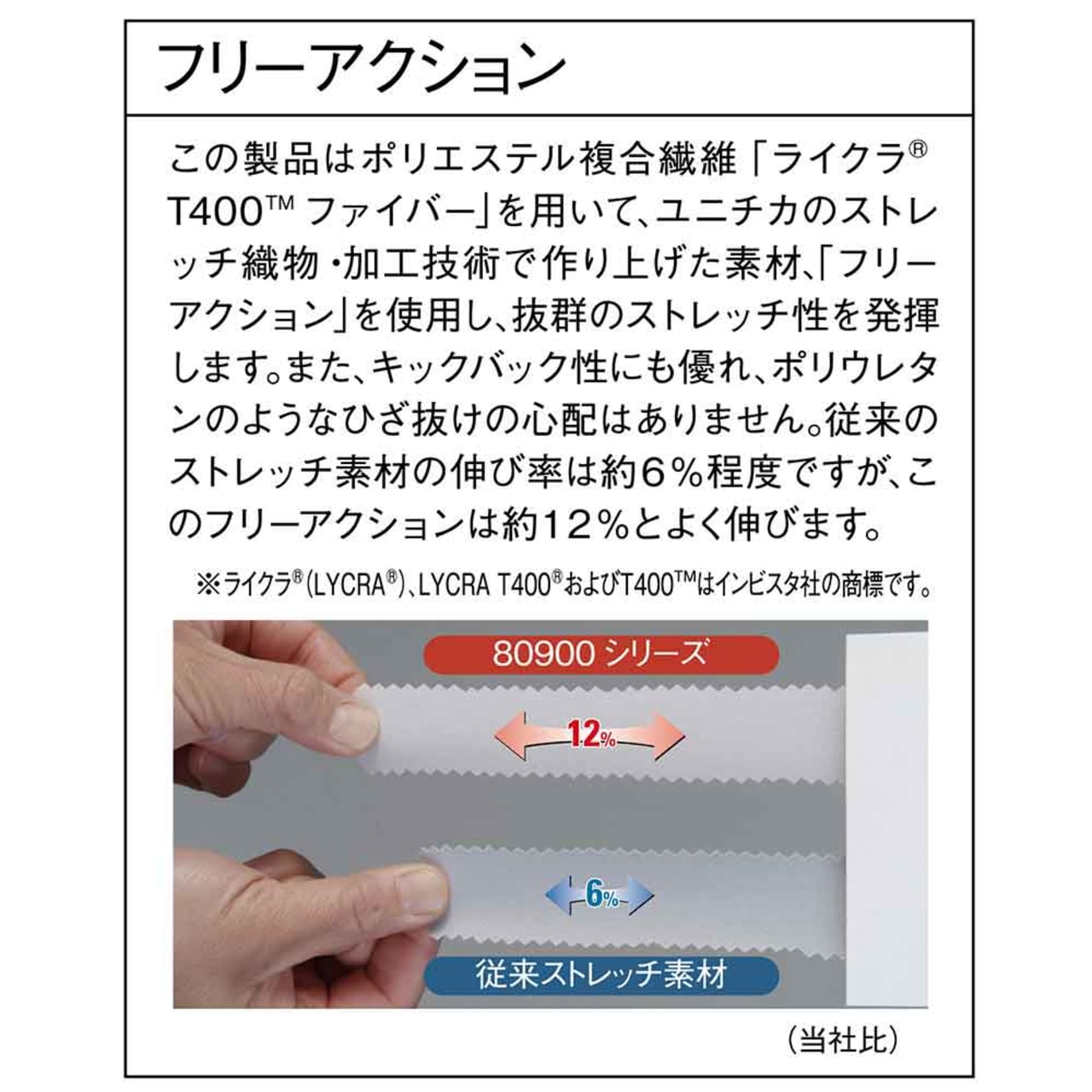 ポリエステル複合繊維であるライクラT400ファイバーを採用し、ストレッチ織物加工技術で作り上げたフリーアクションという素材を使用することで、従来の素材に比べ約6%伸び率がアップし、驚きのストレッチ性を発揮します。足の曲げ伸ばしはもちろん、ヒップや太もも部分にもつっぱり感のない快適なストレッチ性を感じることが可能です。立ち座りや屈む姿勢も自然にサポートし、長時間に及ぶ作業でも、快適にこなすことができます。また、形態安定性に優れた生地は、型崩れがしくく、常にパリッとした清潔感のある状態をキープできるのも嬉しいポイントです。