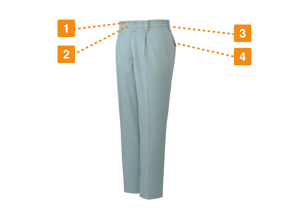 ソフトで伸縮性のある生地はストレッチ性が抜群で、作業中のワーカーのどんな動きにもしっかりと対応可能です。さらに形態安定性にも優れており、さまざまなアクションに対応しながらも、よれたり型崩れが起こりにくい仕様になっています。ワークシーンでの着用には欠かせない清潔感のある装いをキープできるのは、大きな魅力のひとつです。ワンタックパンツはノータックパンツに比べ、腰回りやヒップに数センチのゆとりができ、締め付け感や生地のつっぱりによる不快感が軽減されています。そのため、体型を問わず快適な履き心地が叶い、足回りの動きもよりスムーズになります。