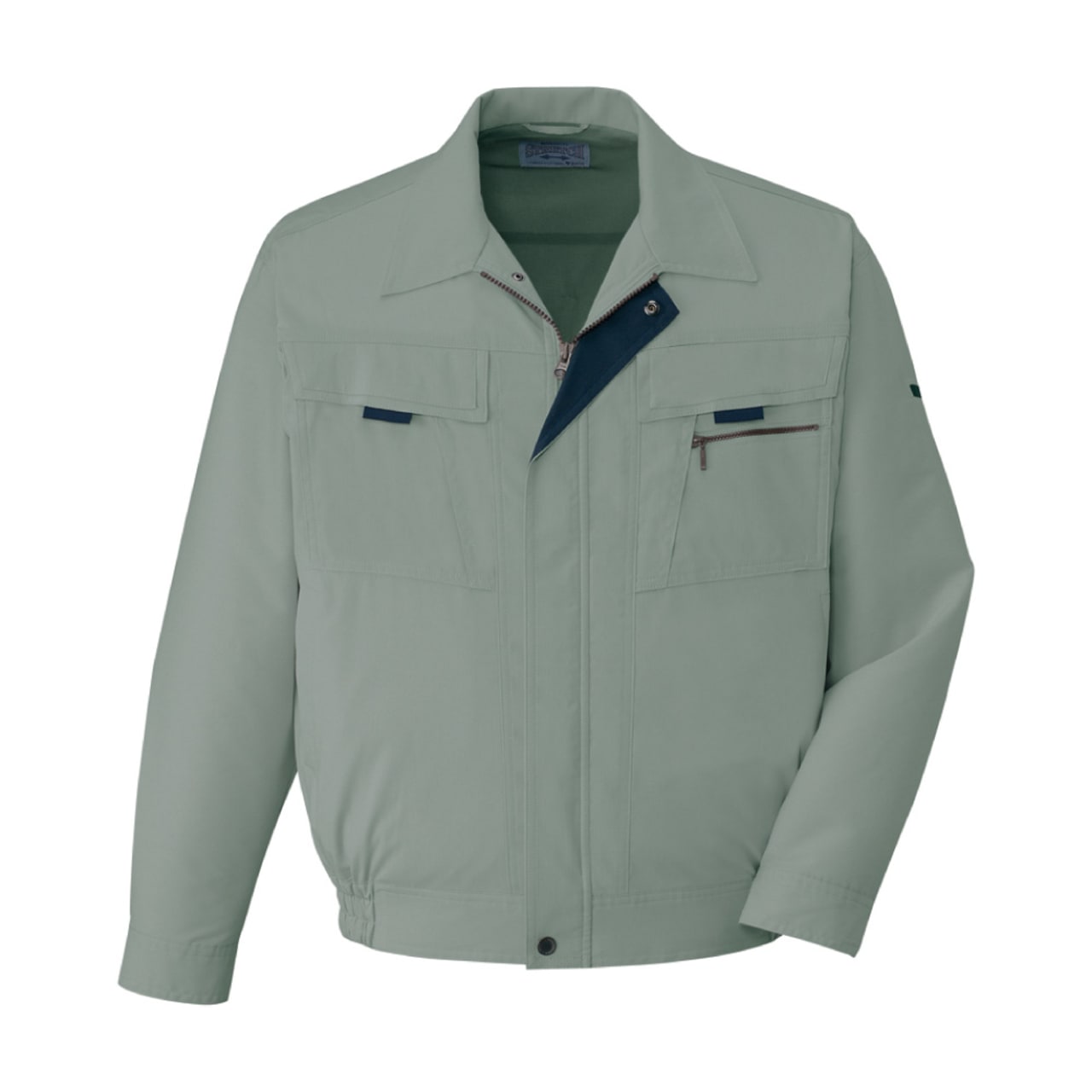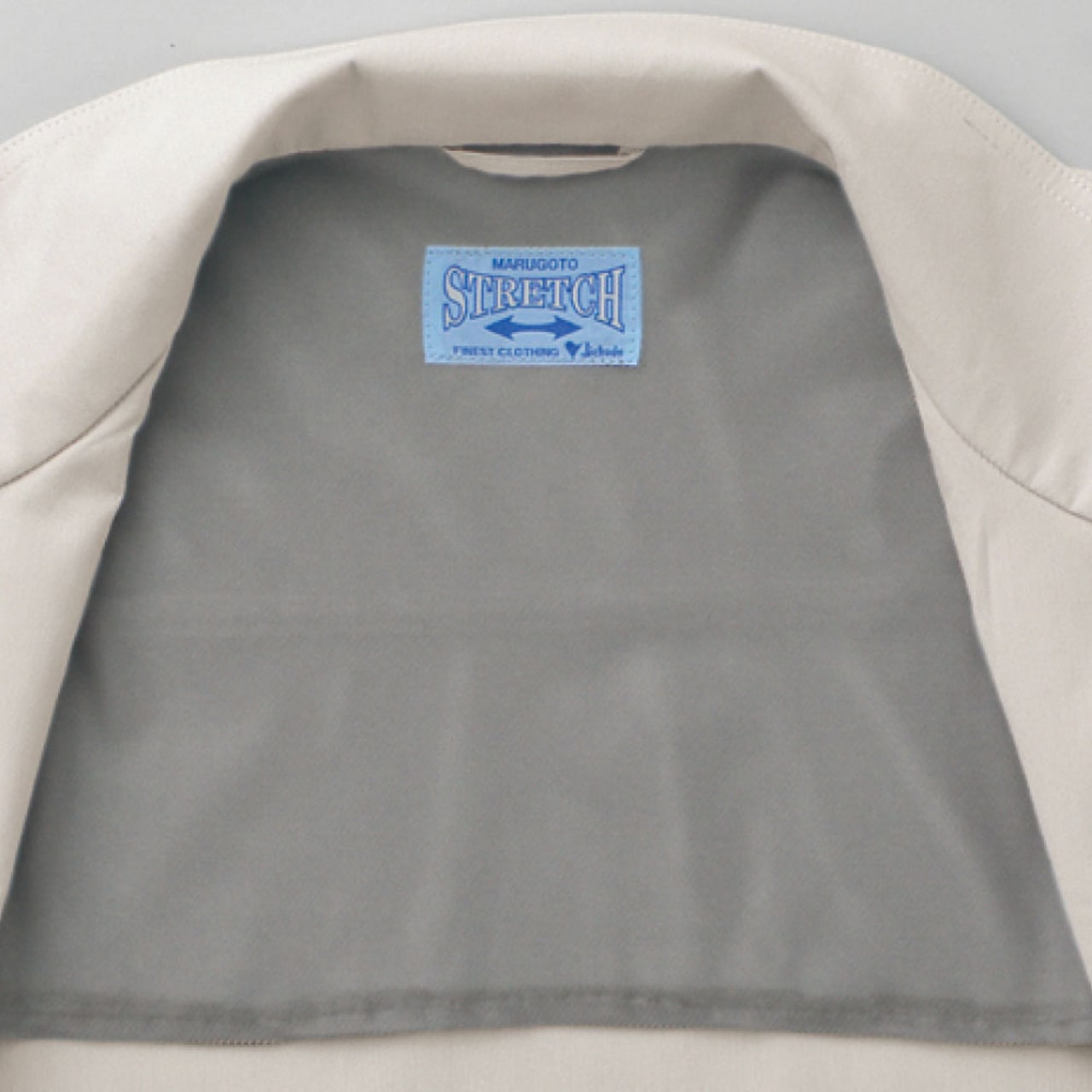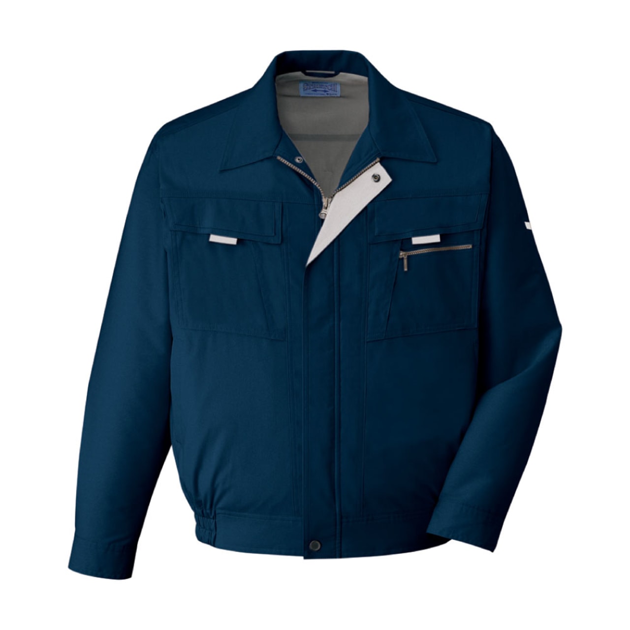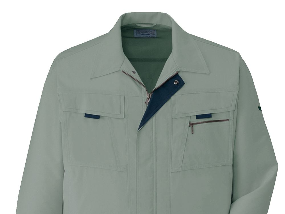 まるごとストレッチ長袖ブルゾンは横糸にソロテック社の特殊ストレッチ糸「ソロテックス®」を採用し、抜群の伸縮性、特に横方向への伸びを維持しています。当社の従来品の伸縮率は6%くらいですが、この糸素材は12%を誇っています。伸縮性が良い一方で、形態安定性も優れていて、外観が乱れにくいのも特徴です。カラーバリエーションはネイビー、アースグリーン、シルバーの3種類で、どれも現場作業にぴったり合う色合いになっています。機能性も優秀で、ポケットが多く携帯性が優れているし、引き手付雨蓋もついています。そのうえ帯電防止素材使用で、静電気に敏感な現場でも活用できる商品です。サイズはS~5Lと7種類もあり、どんな年齢や体形の方にも自由に選べるようになっています。