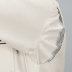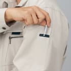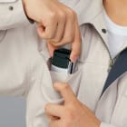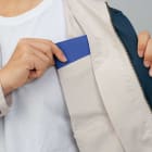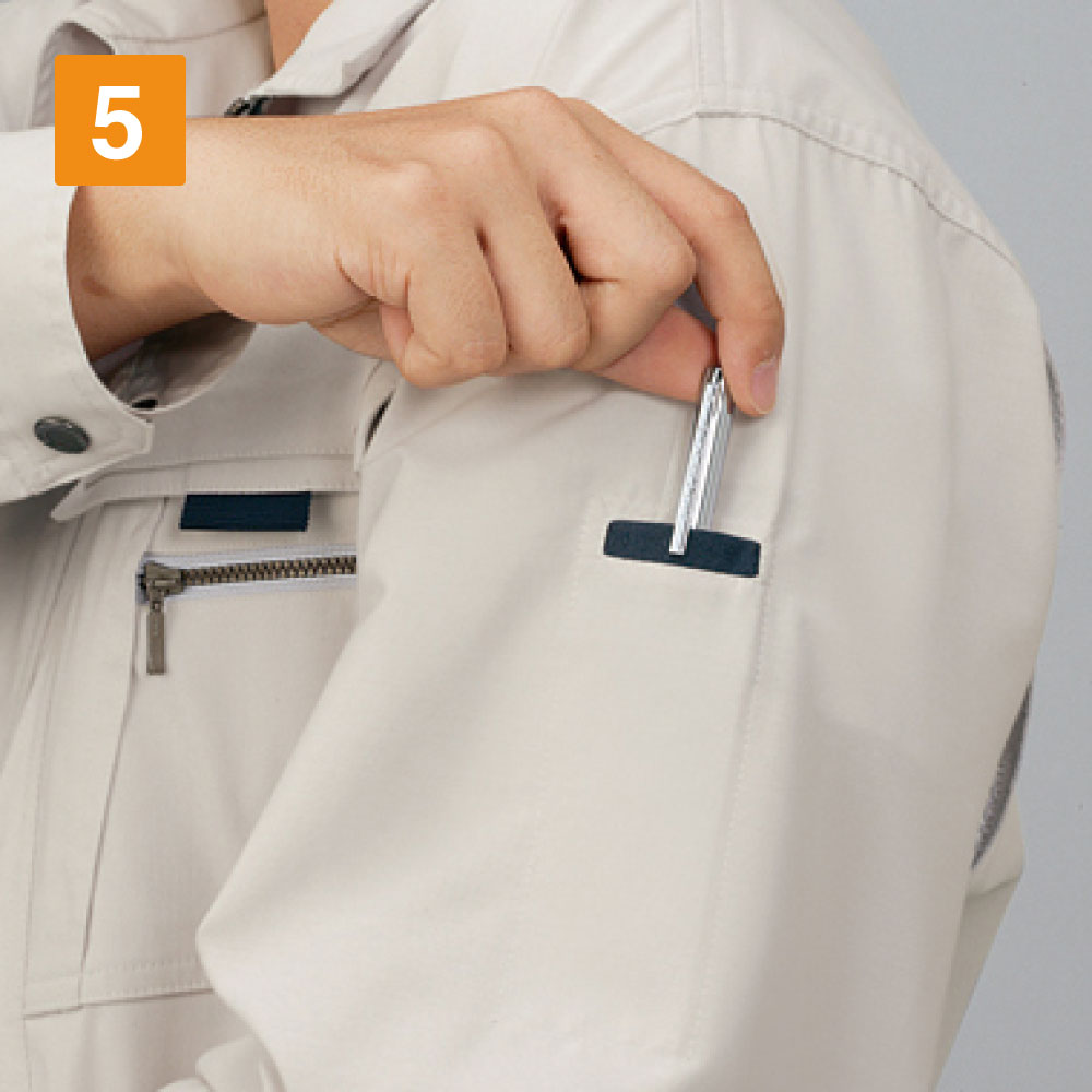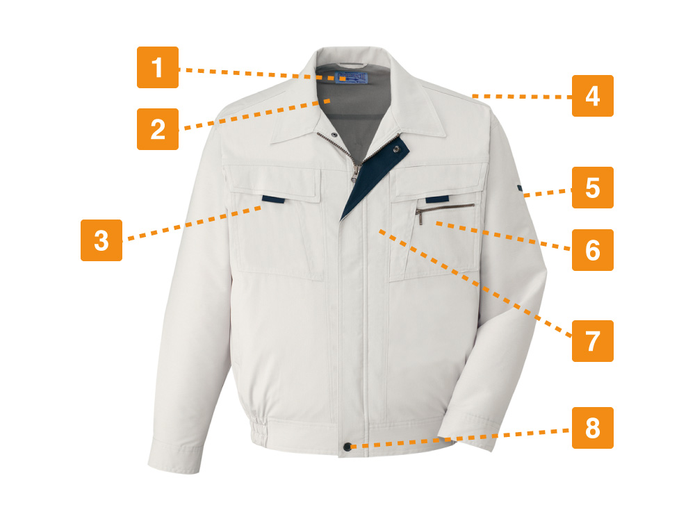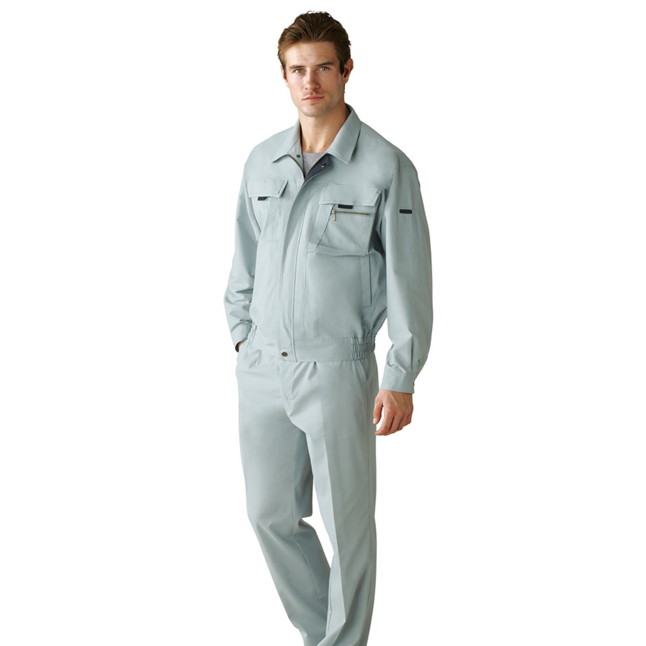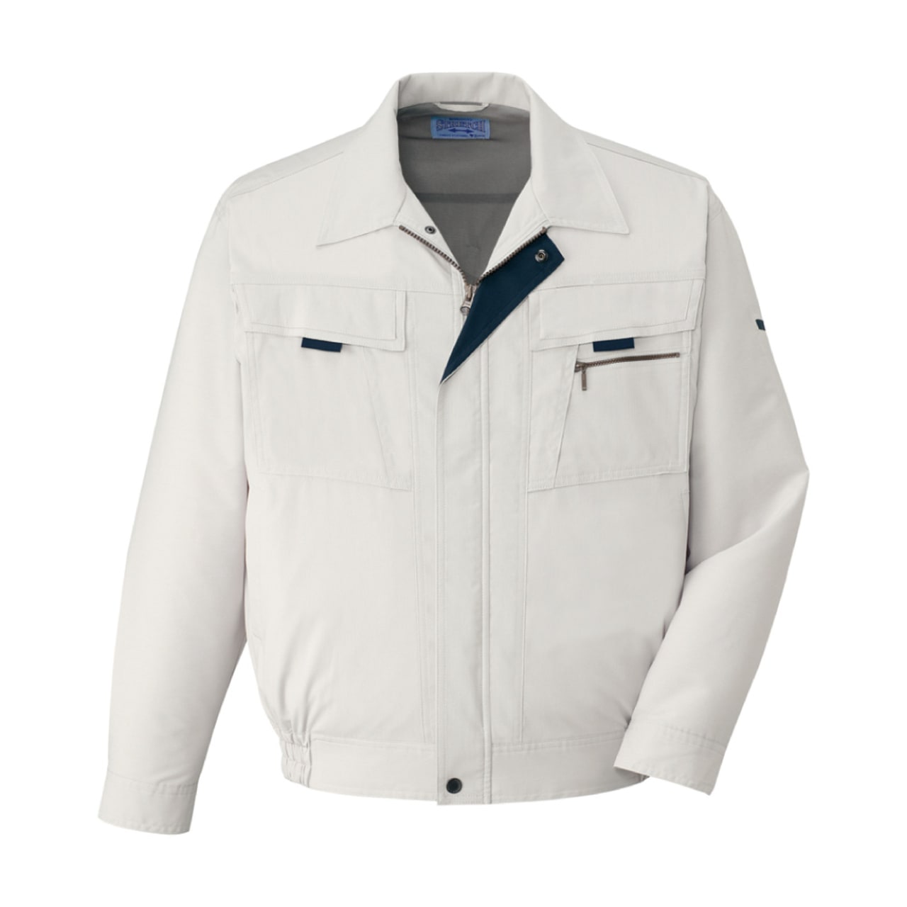 まるごとストレッチ長袖ブルゾンは横糸にソロテック社の特殊ストレッチ糸「ソロテックス®」を採用し、抜群の伸縮性、特に横方向への伸びを維持しています。当社の従来品の伸縮率は6%くらいですが、この糸素材は12%を誇っています。伸縮性が良い一方で、形態安定性も優れていて、外観が乱れにくいのも特徴です。カラーバリエーションはネイビー、アースグリーン、シルバーの3種類で、どれも現場作業にぴったり合う色合いになっています。機能性も優秀で、ポケットが多く携帯性が優れているし、引き手付雨蓋もついています。そのうえ帯電防止素材使用で、静電気に敏感な現場でも活用できる商品です。サイズはS~5Lと7種類もあり、どんな年齢や体形の方にも自由に選べるようになっています。