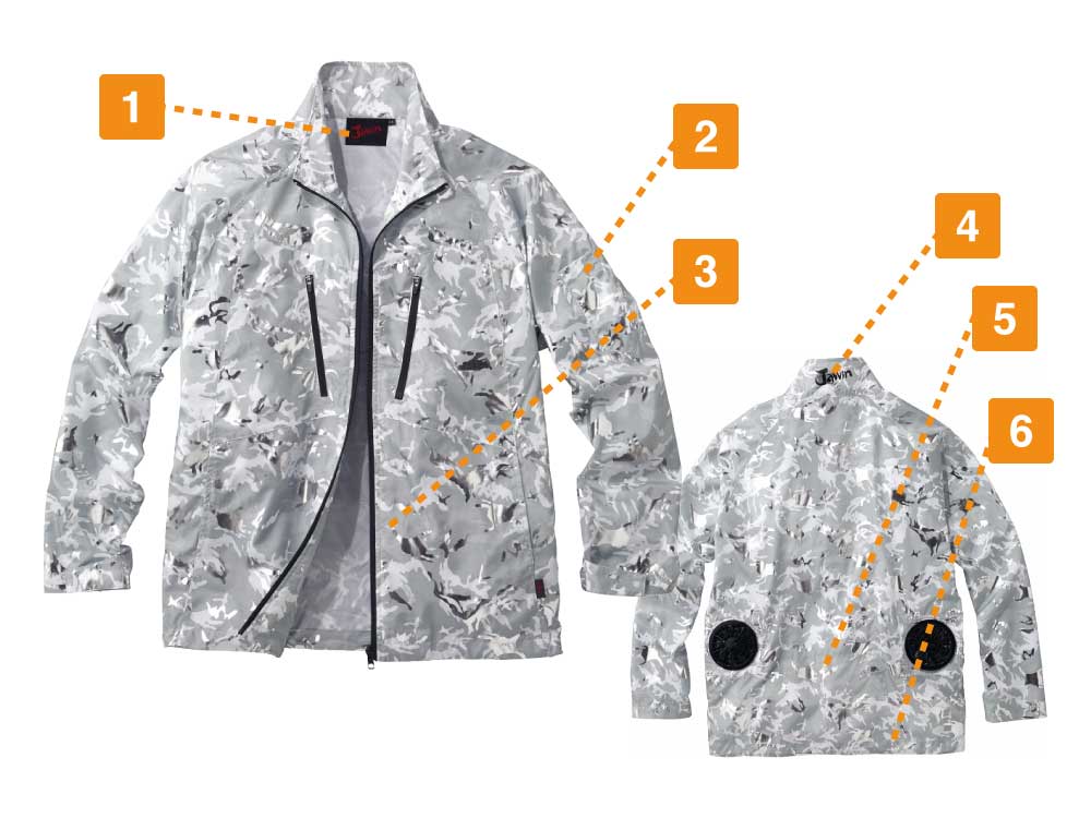 プロ仕様の空調機能を備えた長袖ジャケットは、涼しい風が心地よく、炎天下でも汗が気持ちよく蒸発します。空気が流れてきても、服自体は膨らまないようになっているので、外見は乱れることはありません。建築・建設、農業・農園・造園、清掃、などあらゆる作業現場で使いやすい空調服です。カモフラ柄とデニム柄は、作業現場でもなじみやすく、実用性のあるデザインです。カラーバリエーションはインディゴ、シャイニーシルバーカモフラ、シャイニーネービーカモフラの3色となっていています
