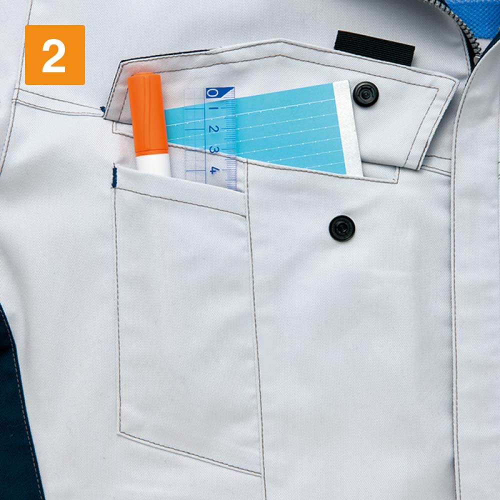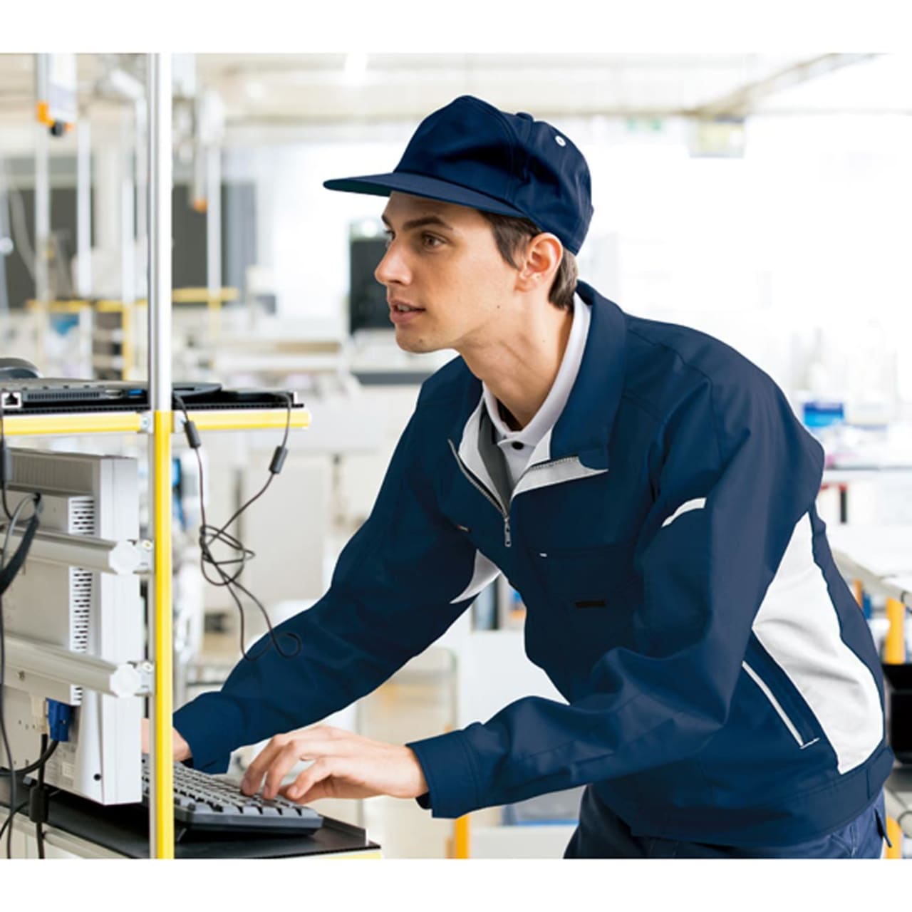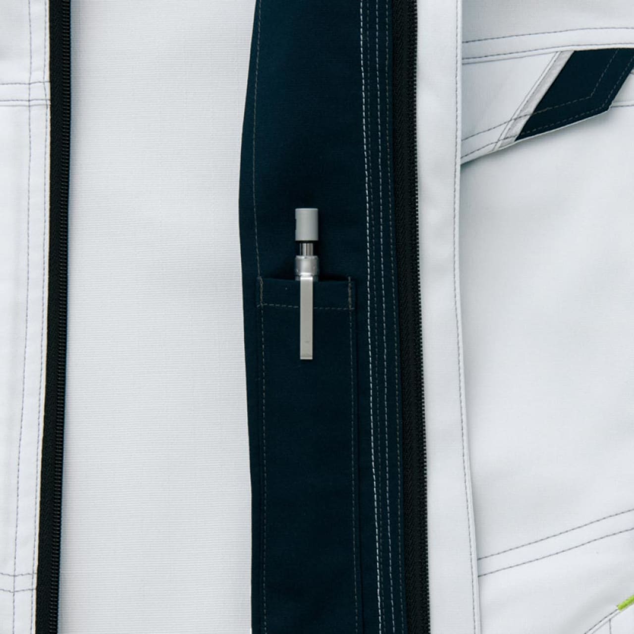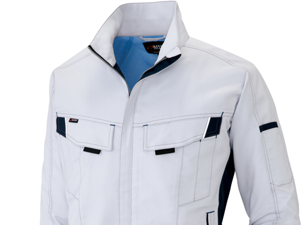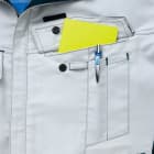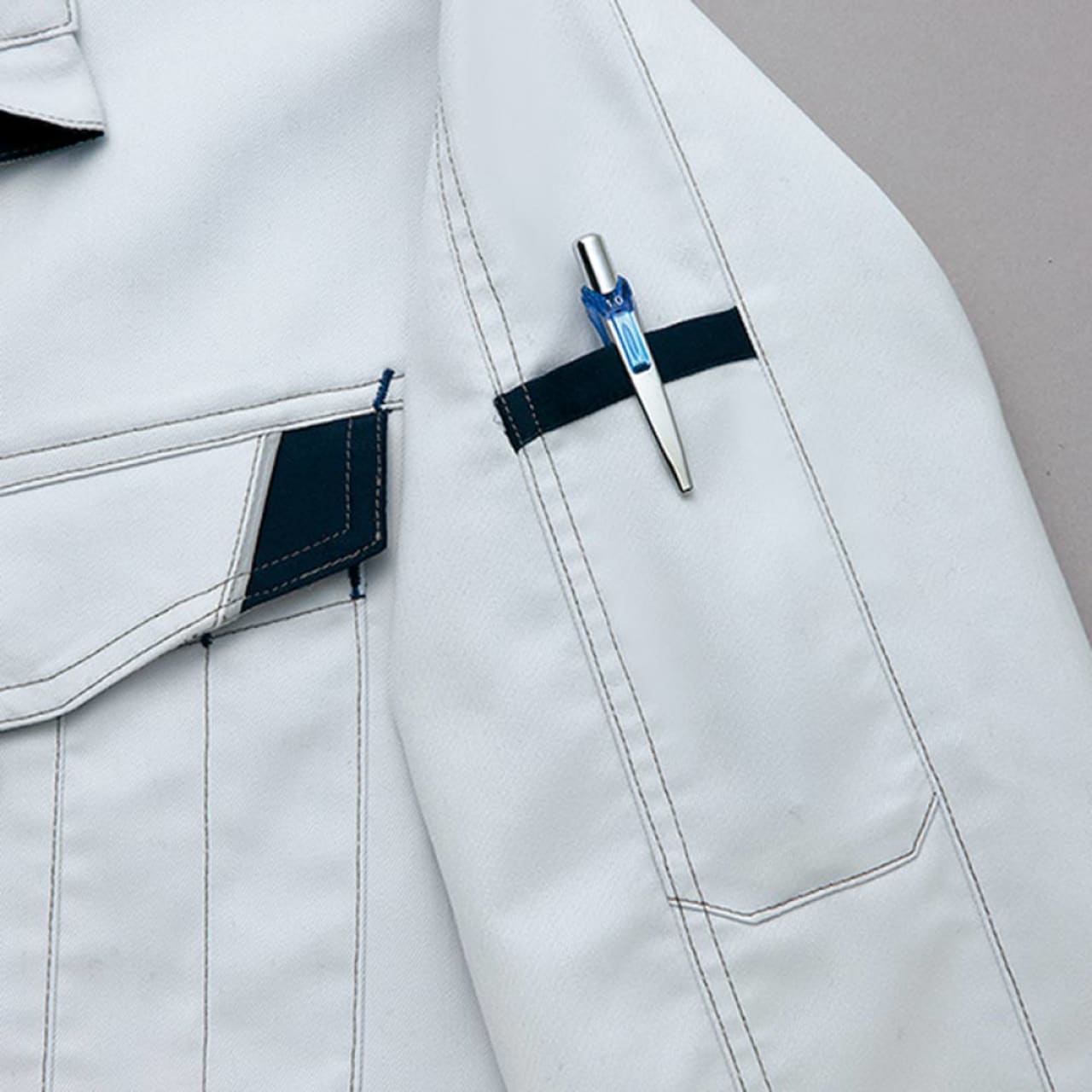 立体裁断により体にフィットさせながら、ストレッチ生地で上半身の運動性能を高めたブルゾンです。物流など、腕や肩の動きが大きい現場におすすめです。または、腕を前後に動かすことが多い機械を扱う現場にも向いています。ブルゾンの形状は、胴回りにだぶつきが少ないスリムなデザインです。布の引っ掛かりの恐れがある現場で、安全に作業することができます。ポケットはペン差しやIDハンガーにも対応しているため、作業中に小物を持ち歩くシーンにも重宝します。中身が飛び出ないファスナー付きポケットで、大きく動いても物が落ちにくい設計です。