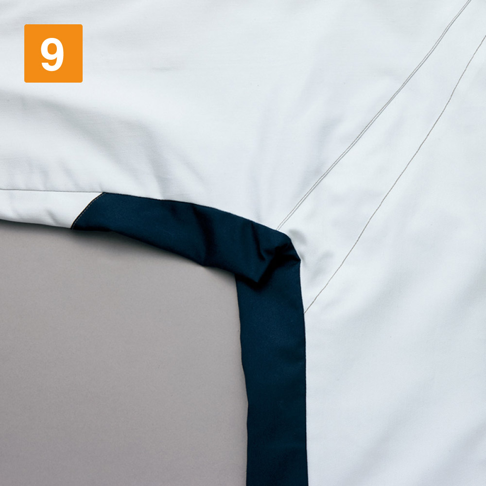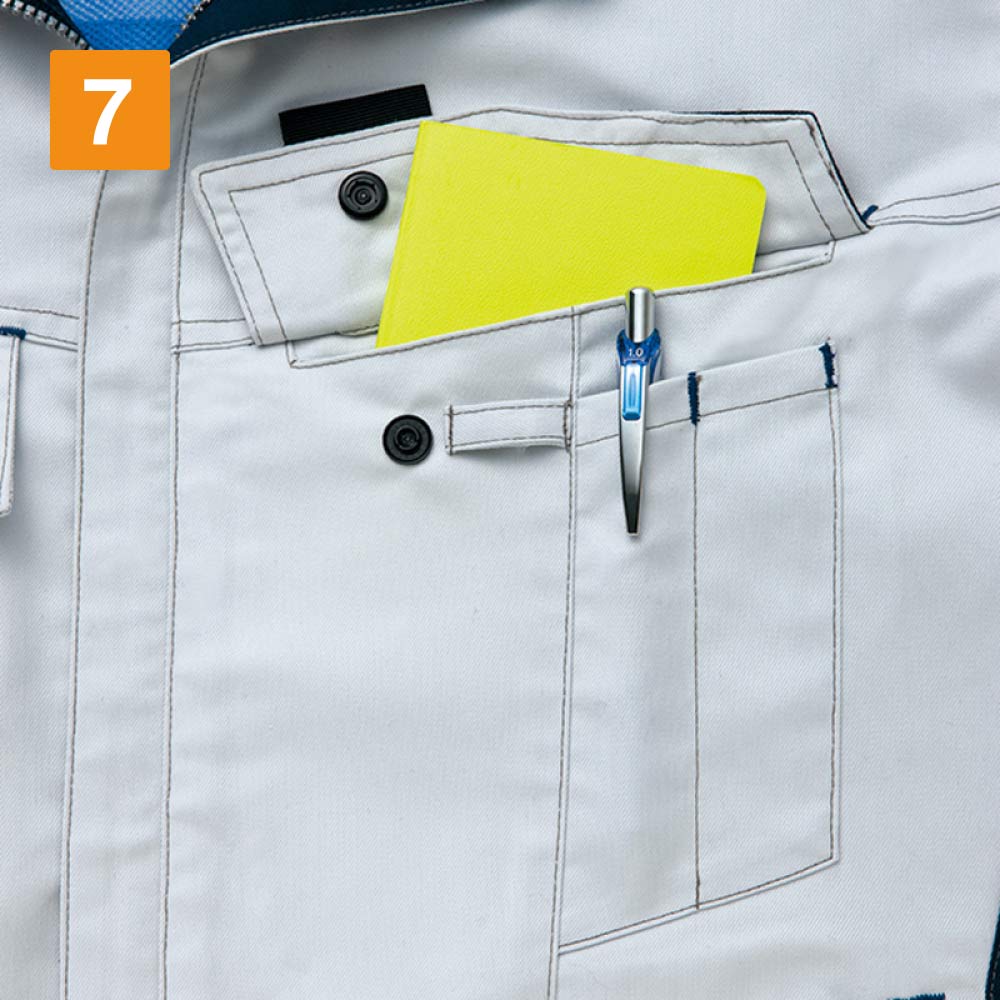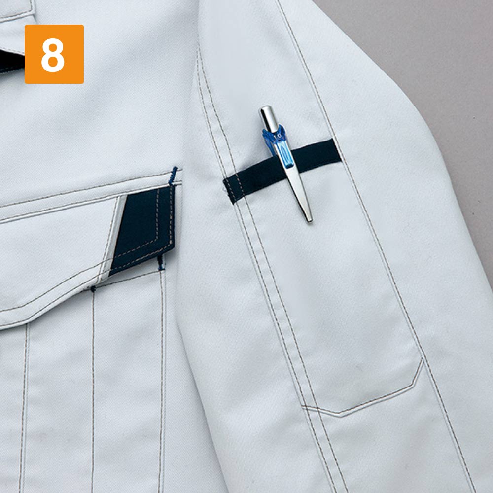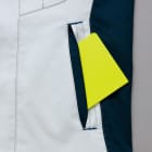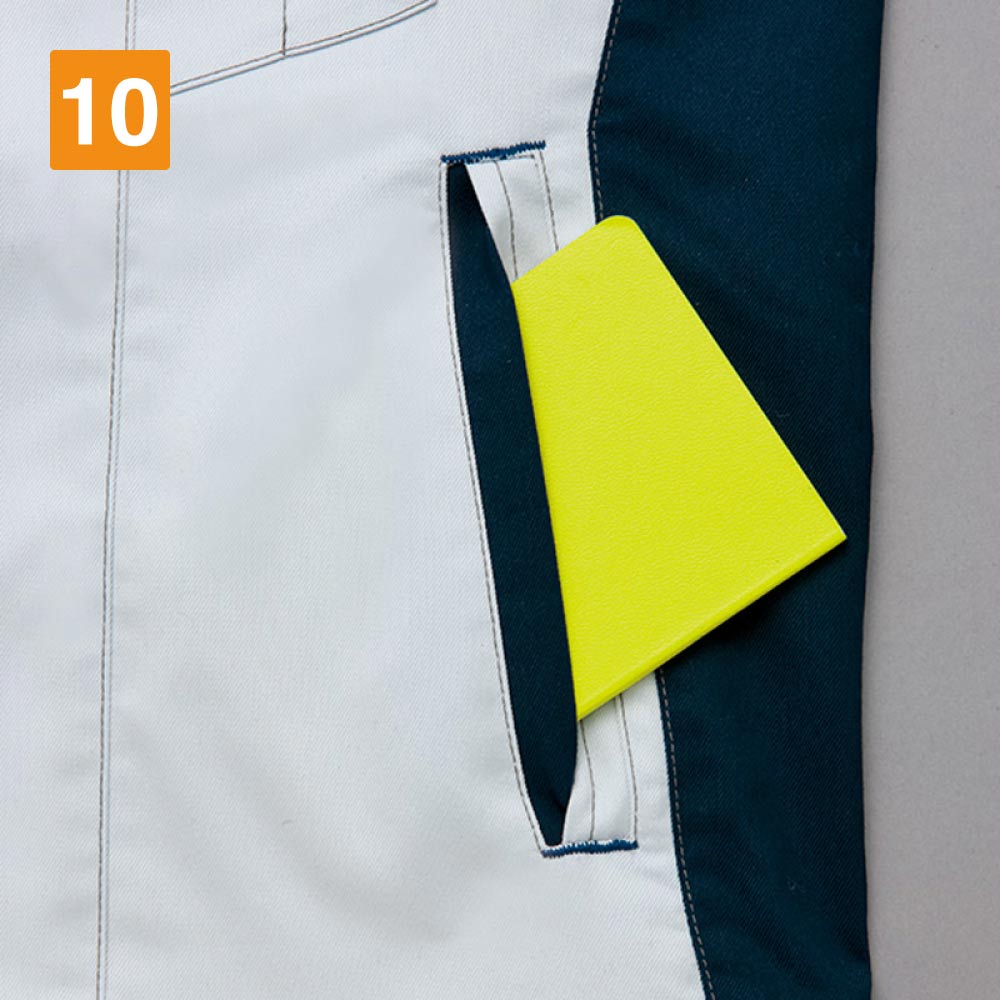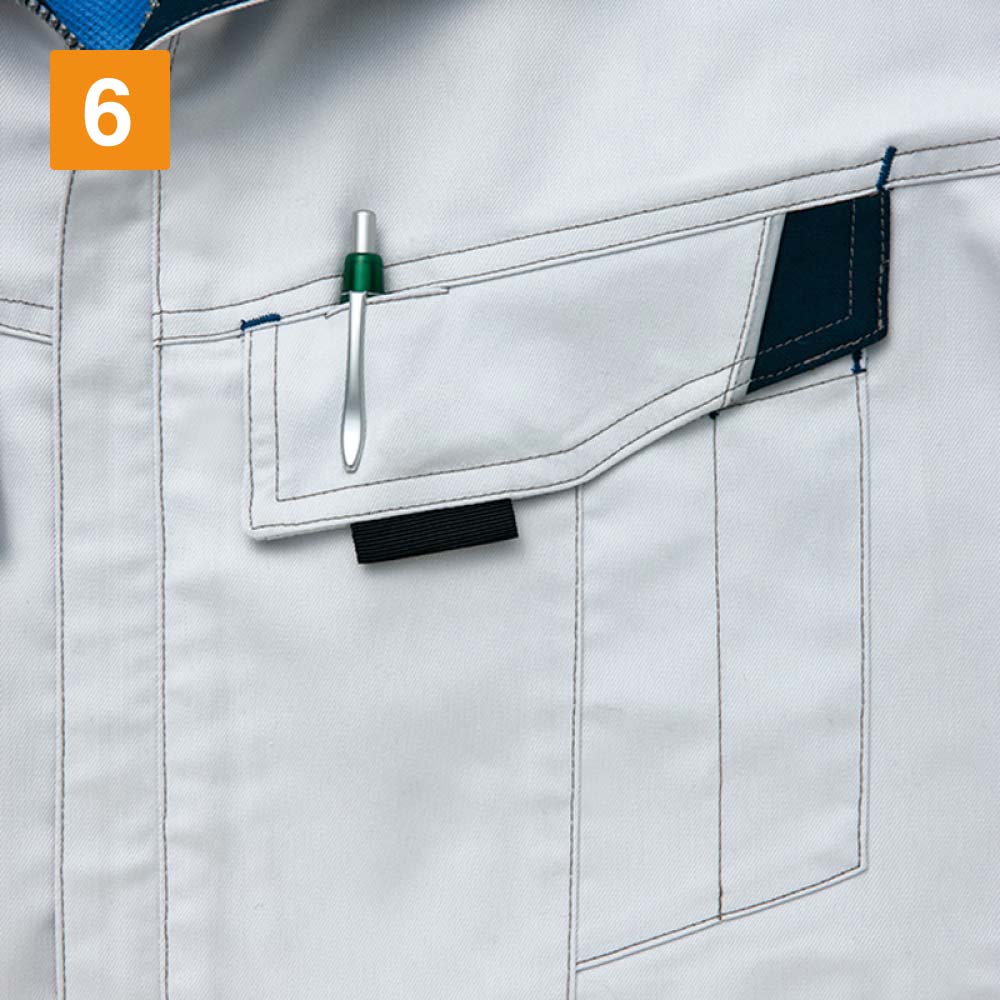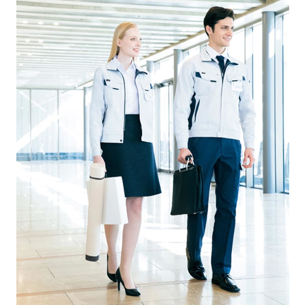 立体裁断により体にフィットさせながら、ストレッチ生地で上半身の運動性能を高めたブルゾンです。物流など、腕や肩の動きが大きい現場におすすめです。または、腕を前後に動かすことが多い機械を扱う現場にも向いています。ブルゾンの形状は、胴回りにだぶつきが少ないスリムなデザインです。布の引っ掛かりの恐れがある現場で、安全に作業することができます。ポケットはペン差しやIDハンガーにも対応しているため、作業中に小物を持ち歩くシーンにも重宝します。中身が飛び出ないファスナー付きポケットで、大きく動いても物が落ちにくい設計です。
