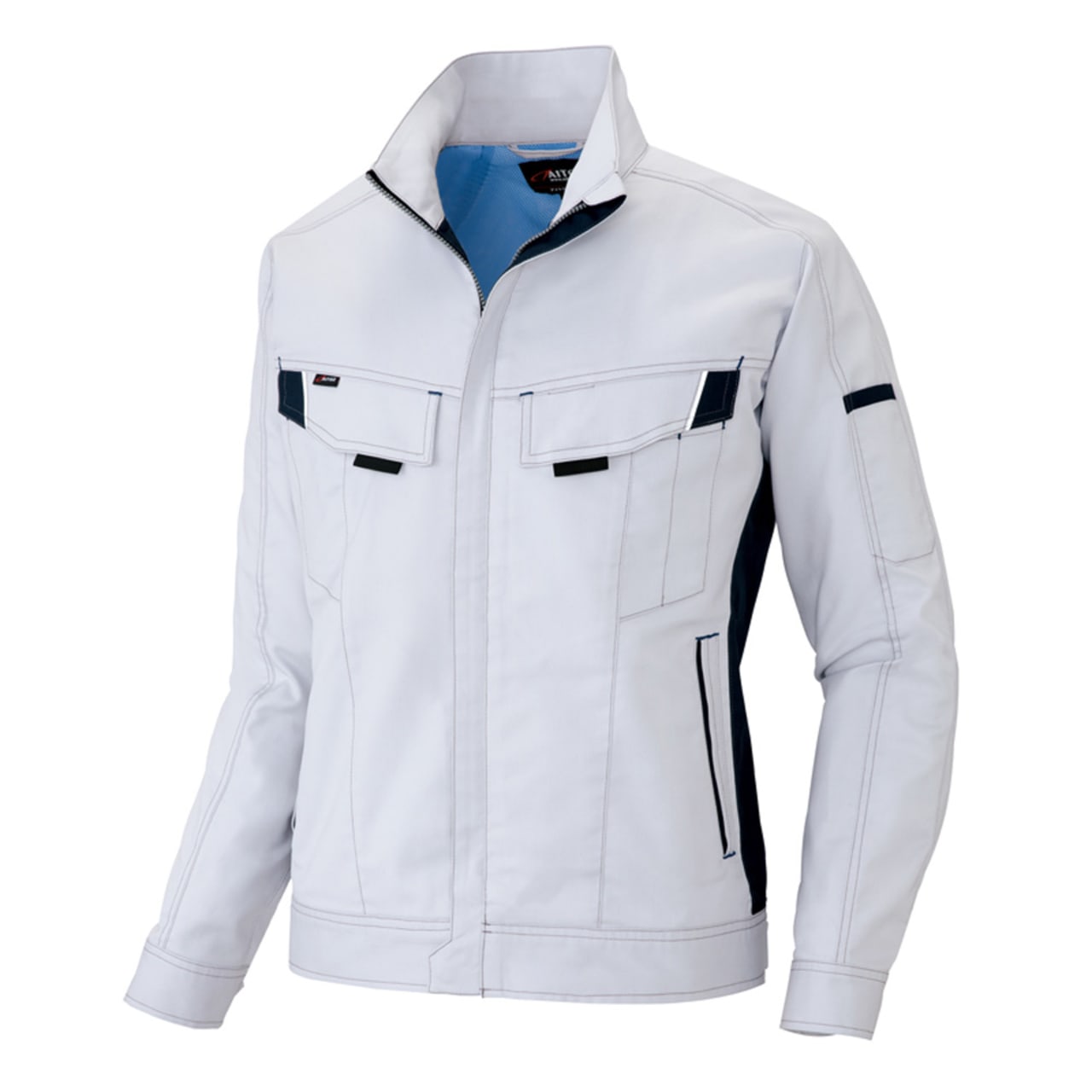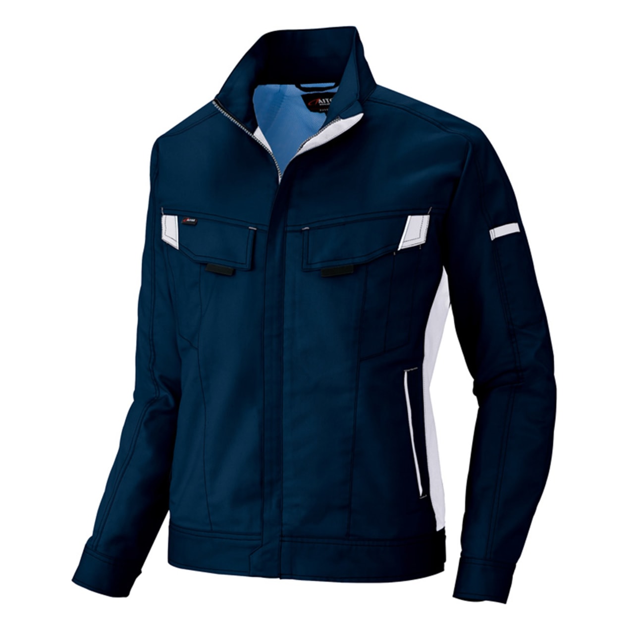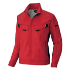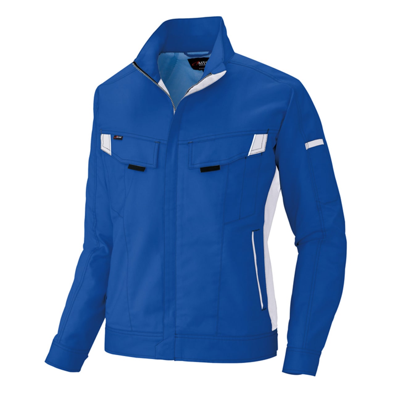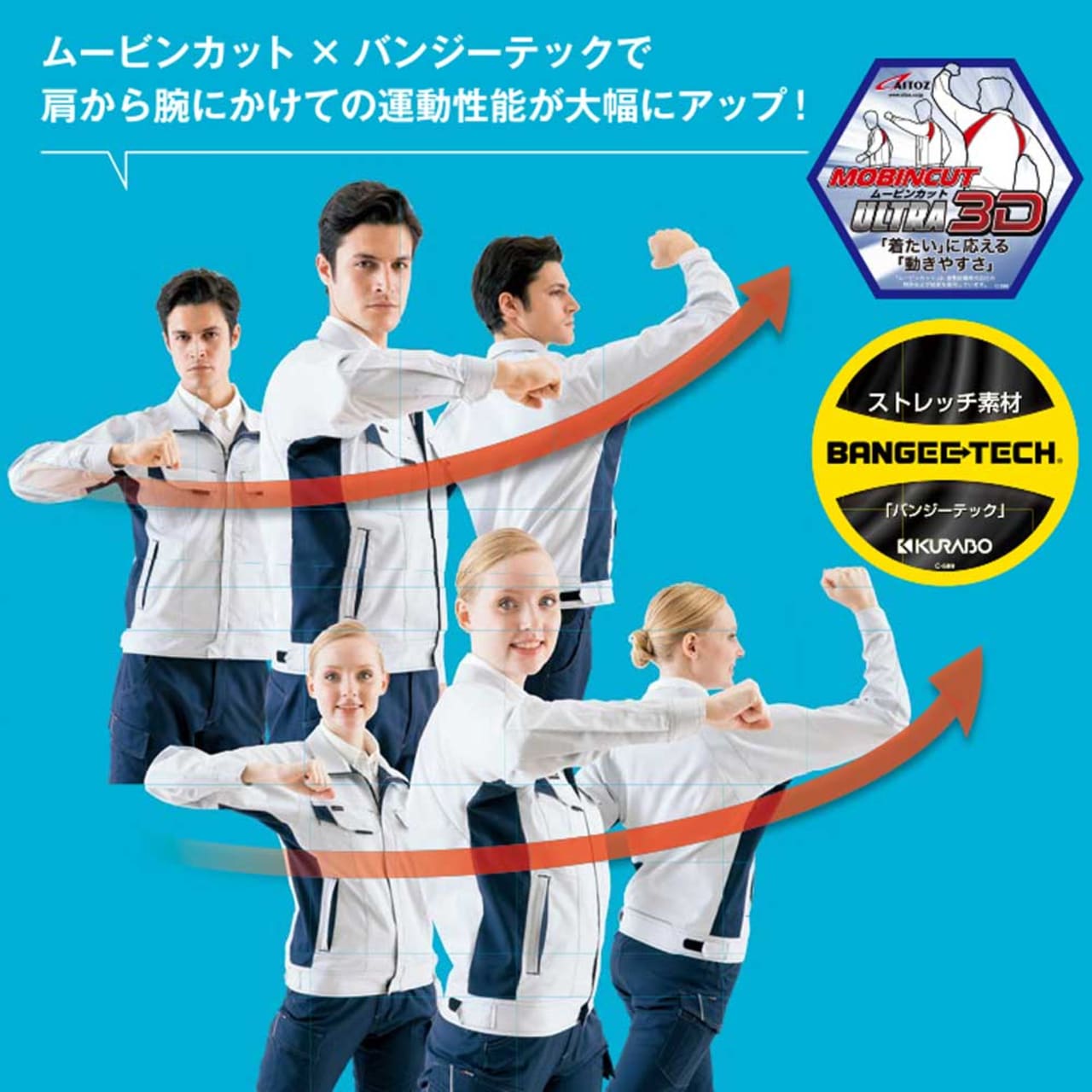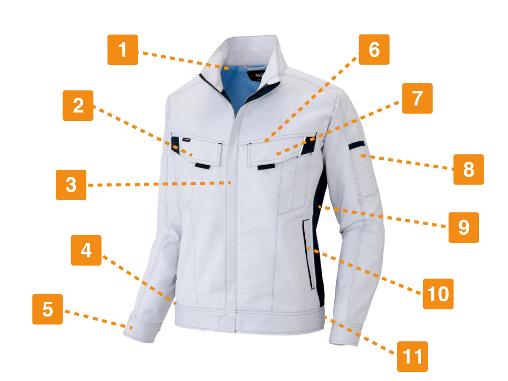 バンジーテックの収縮性のある生地と、ムービンカットの立体裁断により、上半身の動きやすさに対応したジャケットです。肩や腕を大きく動かす際でも、ストレスを軽減できます。ムービンカットの立体裁断は、前身頃のウエストがシェイプされた形で、後身頃や肩回りに余裕を持たせています。肩や腕を大きく前に動かす際や、腕を高く上げる際でもストレッチ生地で運動性能がアップします。ブルゾンは作業がしやすいショート丈で、ウエストのアジャスターで調節が可能です。背中についている反射パイピングによって、暗い場所でも作業員の安全性を確保できます。
